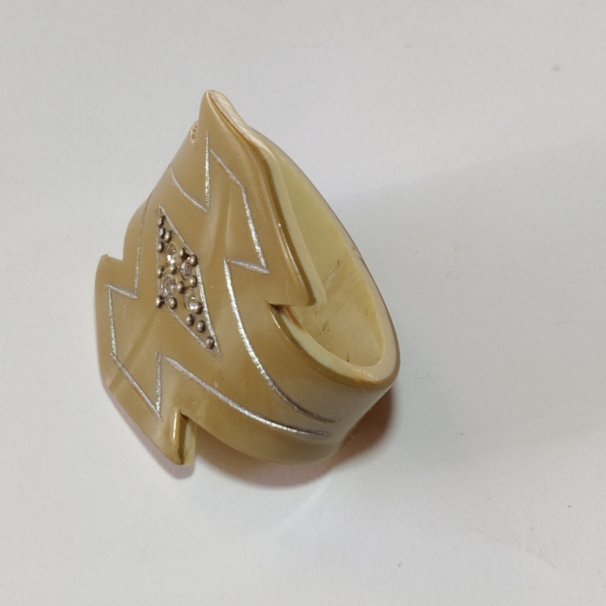 It is made of celluloid which is an early type of plastic. It features paste details of diamante and metal studs within an etched outline mirroring the shape of the main ring.