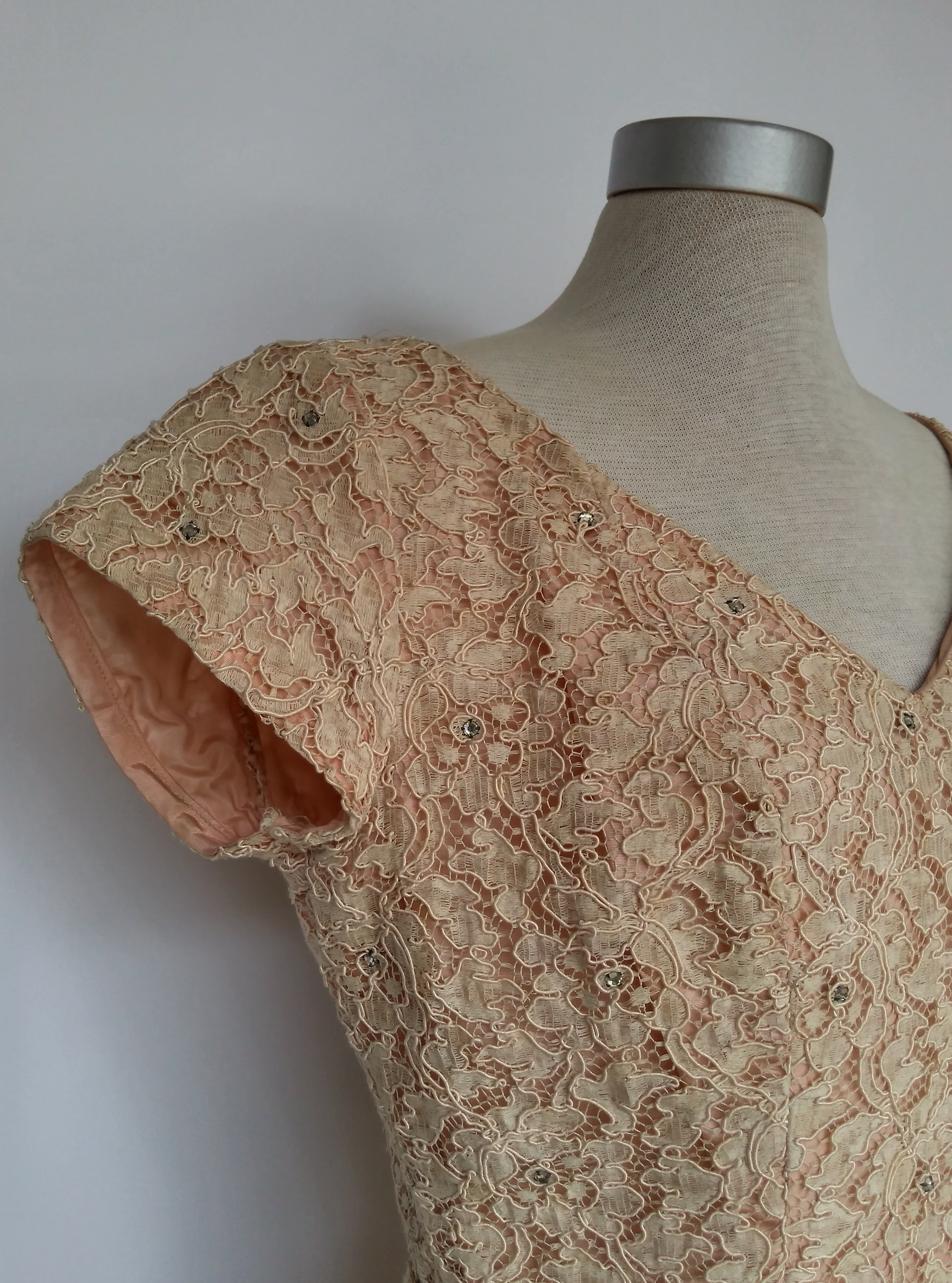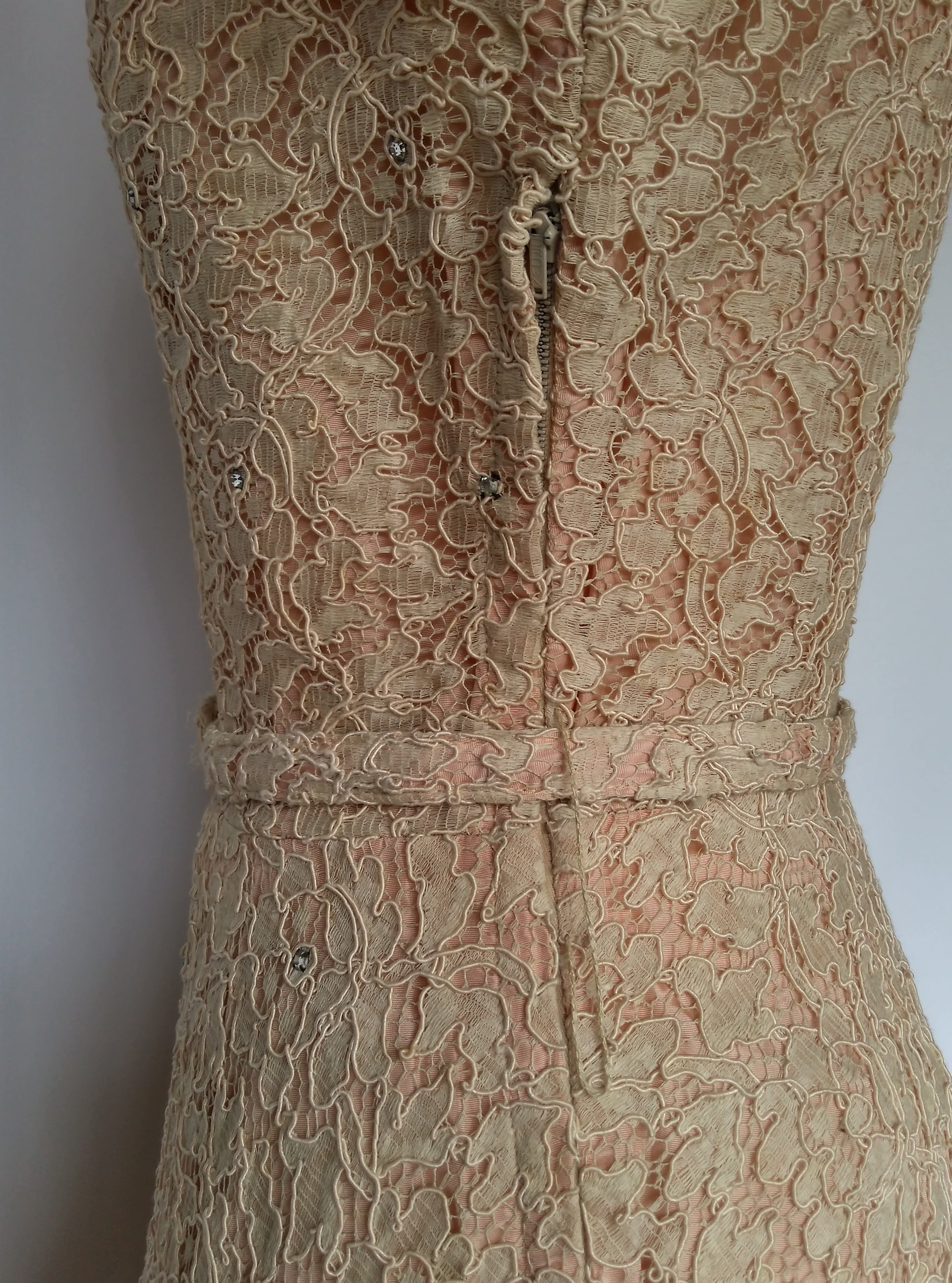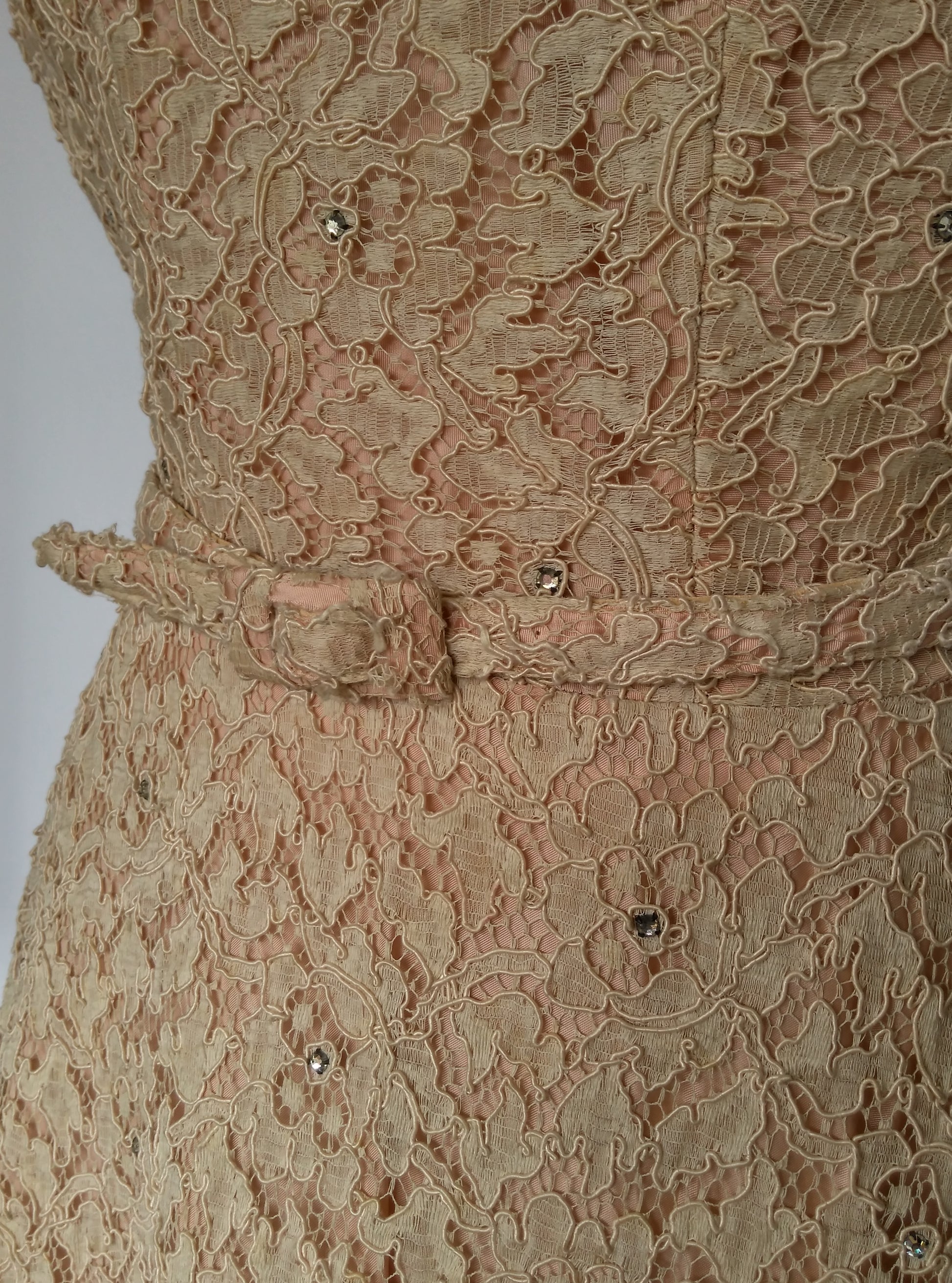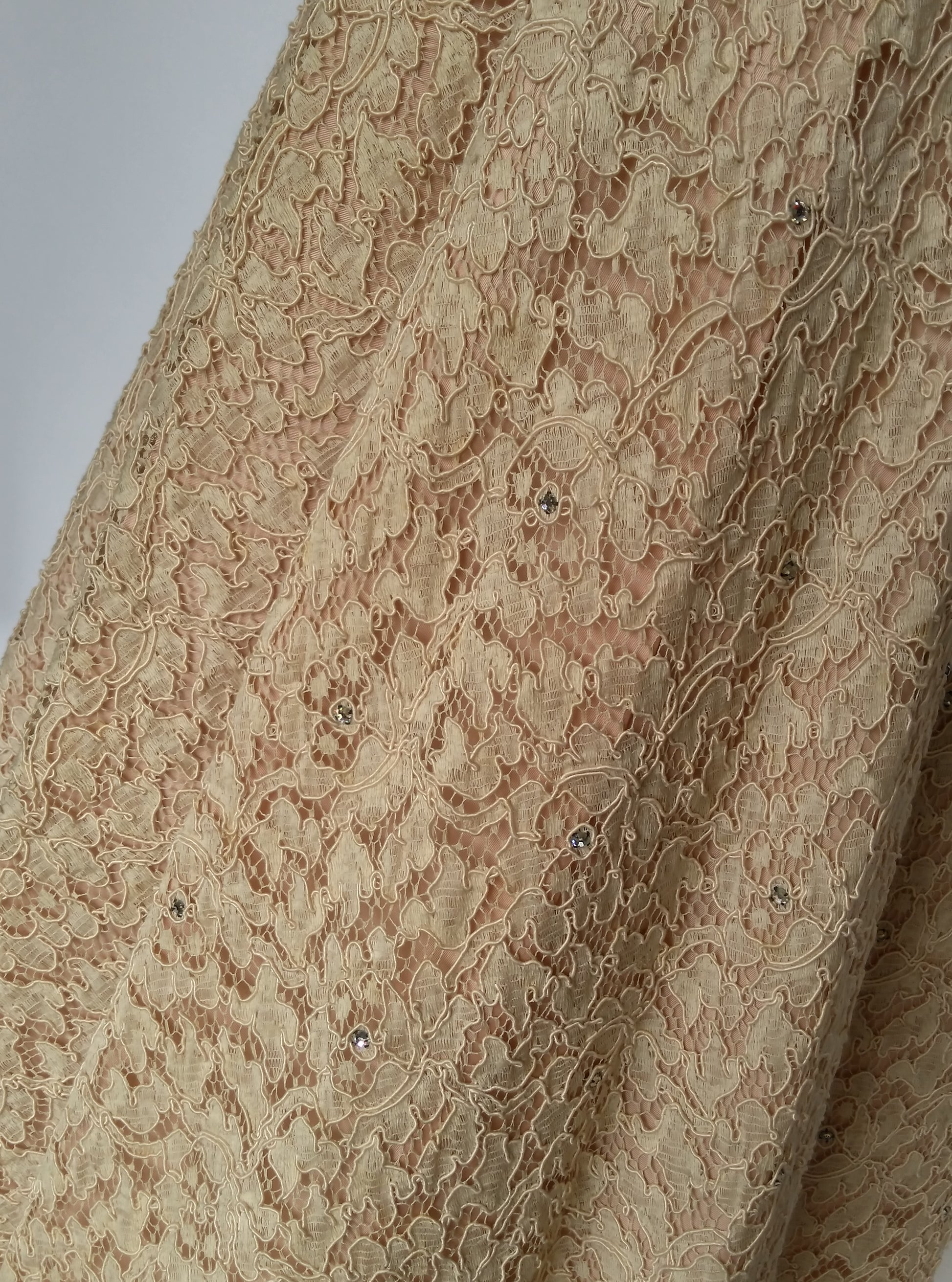 The outer fabric is a heavy lace studded with diamante crystals which subtly catch the light when the fabric moves.