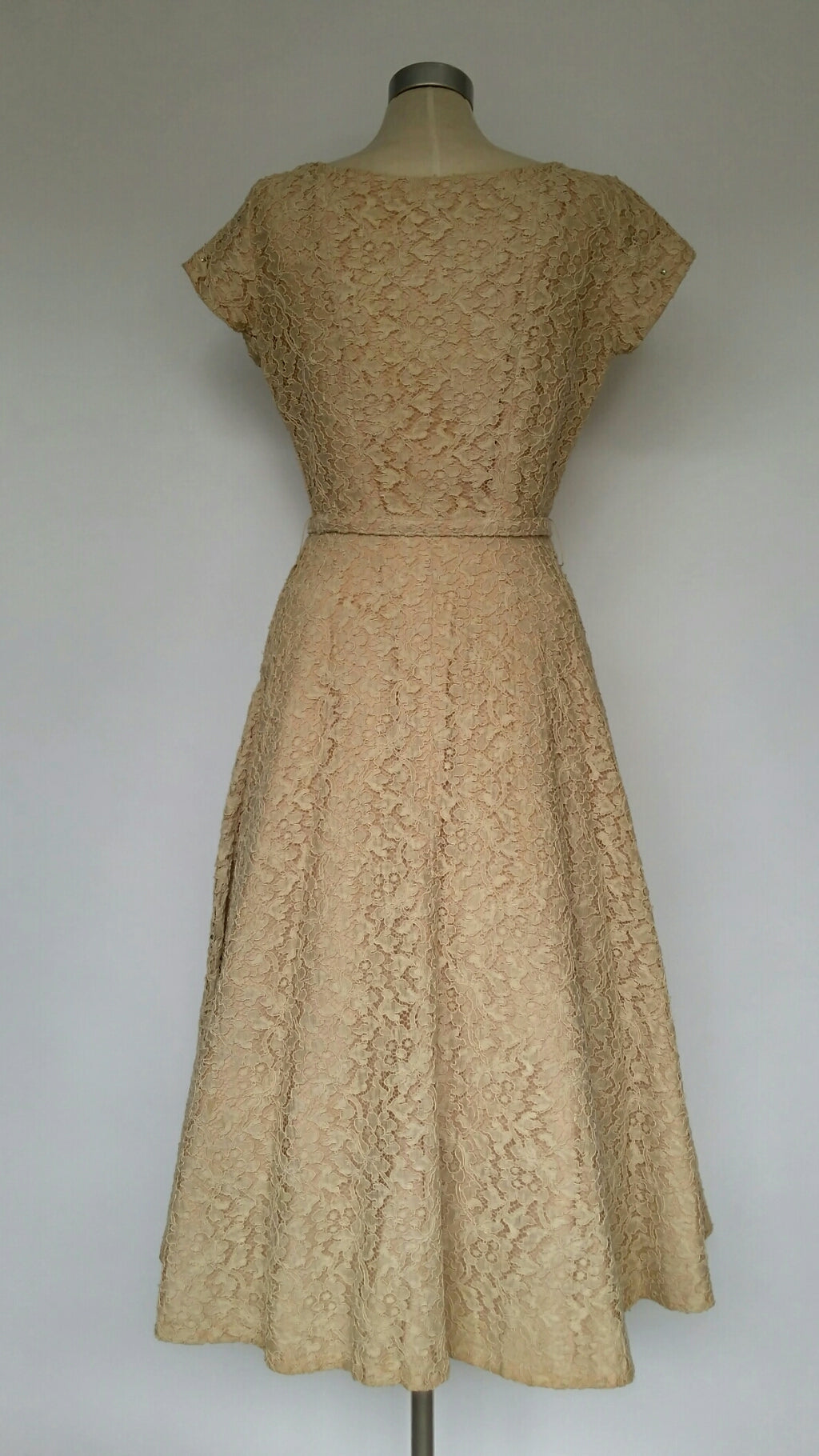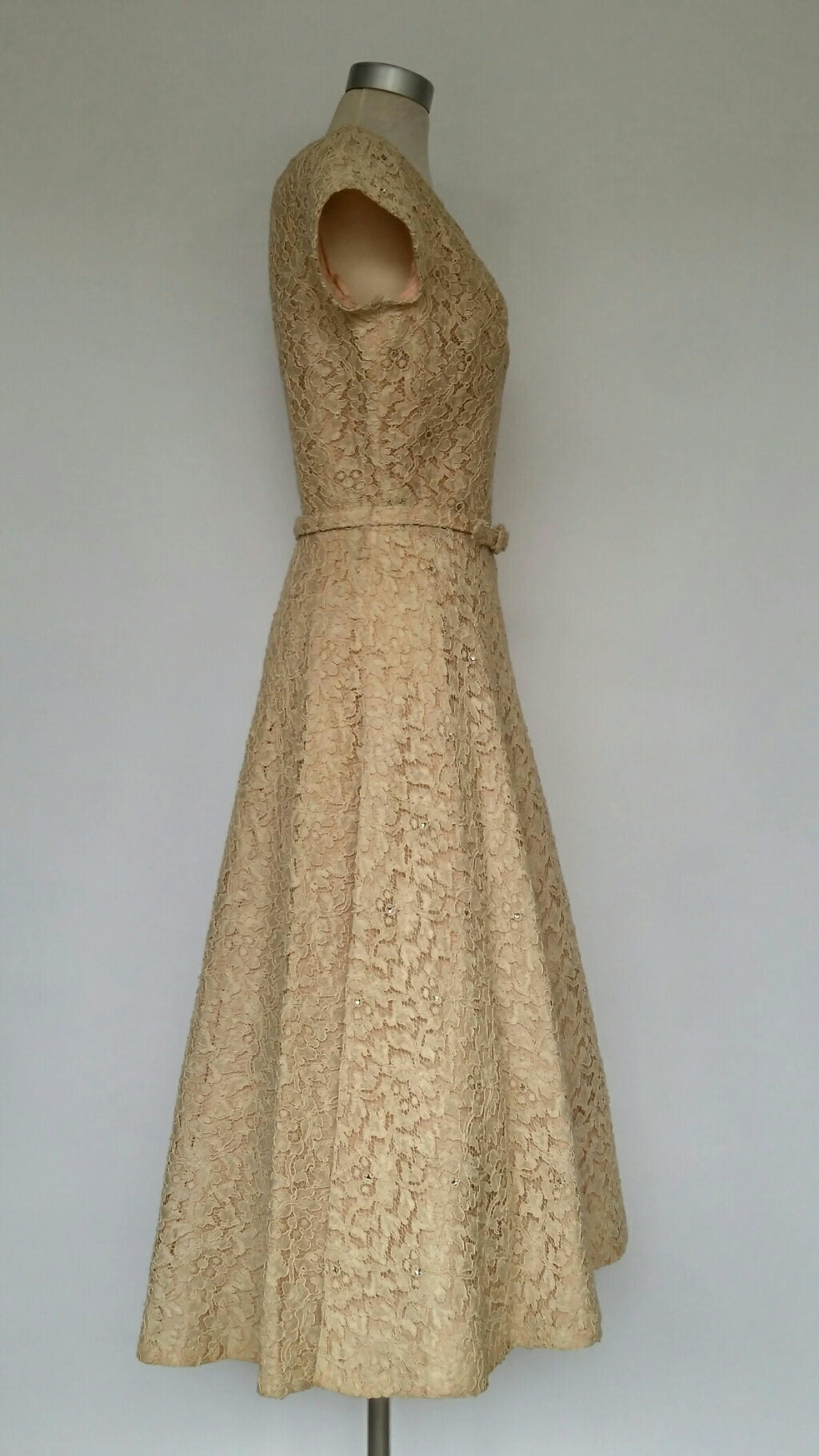 Studded with tiny diamante gems this is a dress that will sparkle at any occasion. This is a gorgeous 1950s dress; a handmade original hence bearing no label. Shown without a petticoat, the addition of a netted one would make the skirt stand out further to create the original fifties effect. The dress is waisted with the original metal side zip and is fully lined.