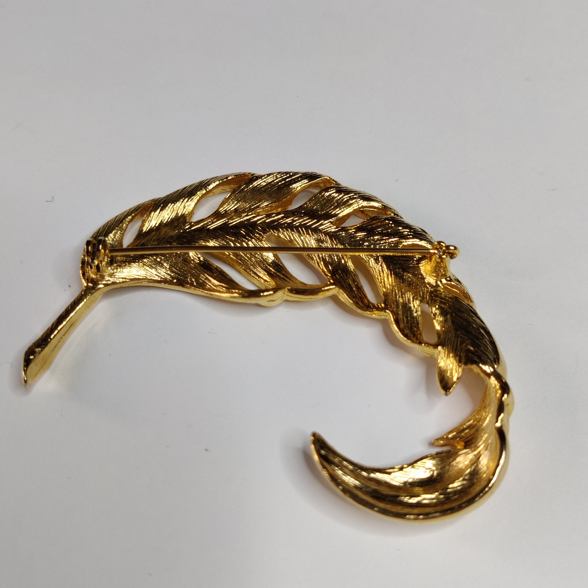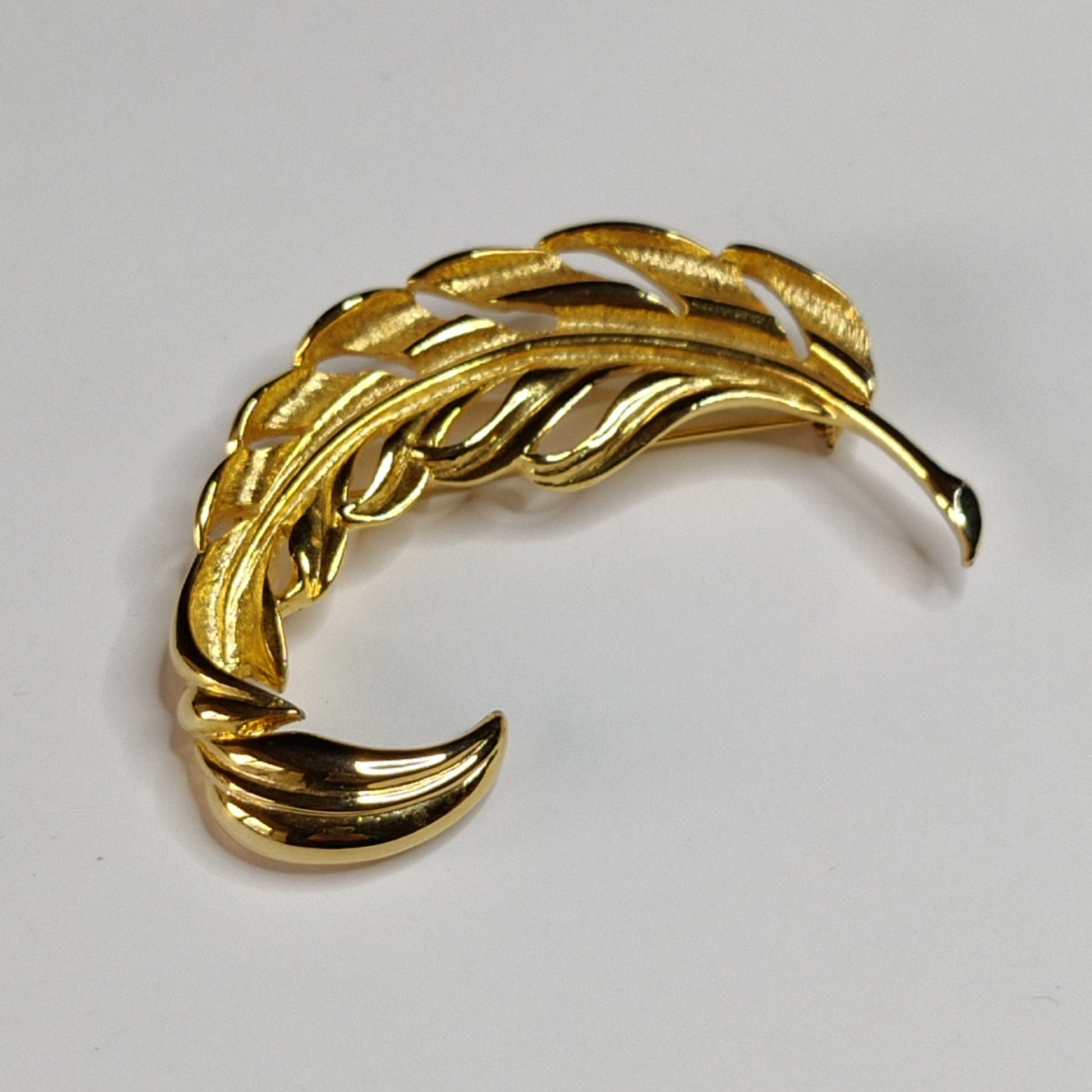 In gold tone metal it is not signed but has a feeling of quality. The centre leaf has a textured mat gold finish and some of the edges of the leaf have open pierced work.