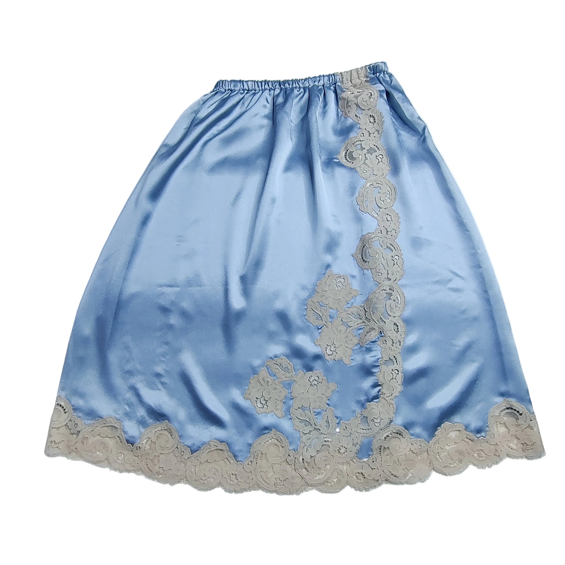 The waist slip is an overlapping wrap style with the opening to the front. The front overlap features beautiful floral lace which extends down and right around the hem. The waist is channel elasticated.
