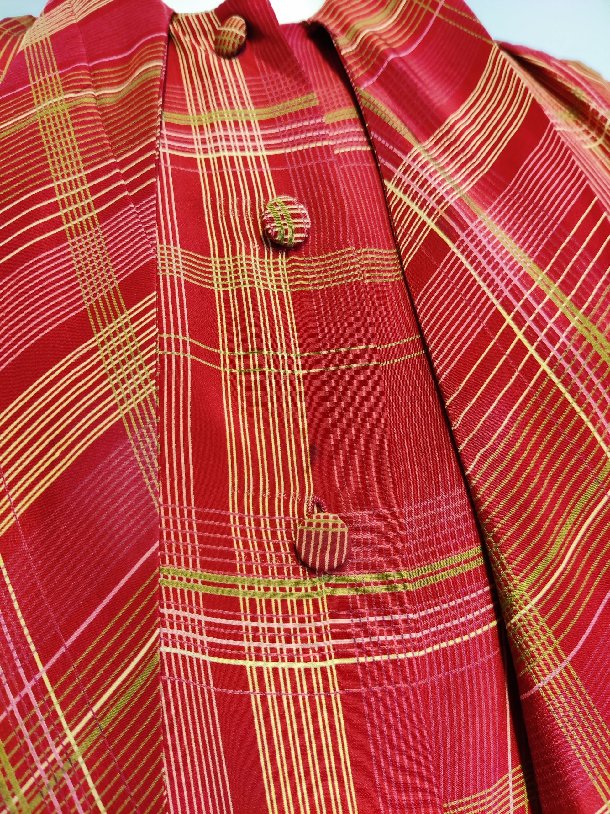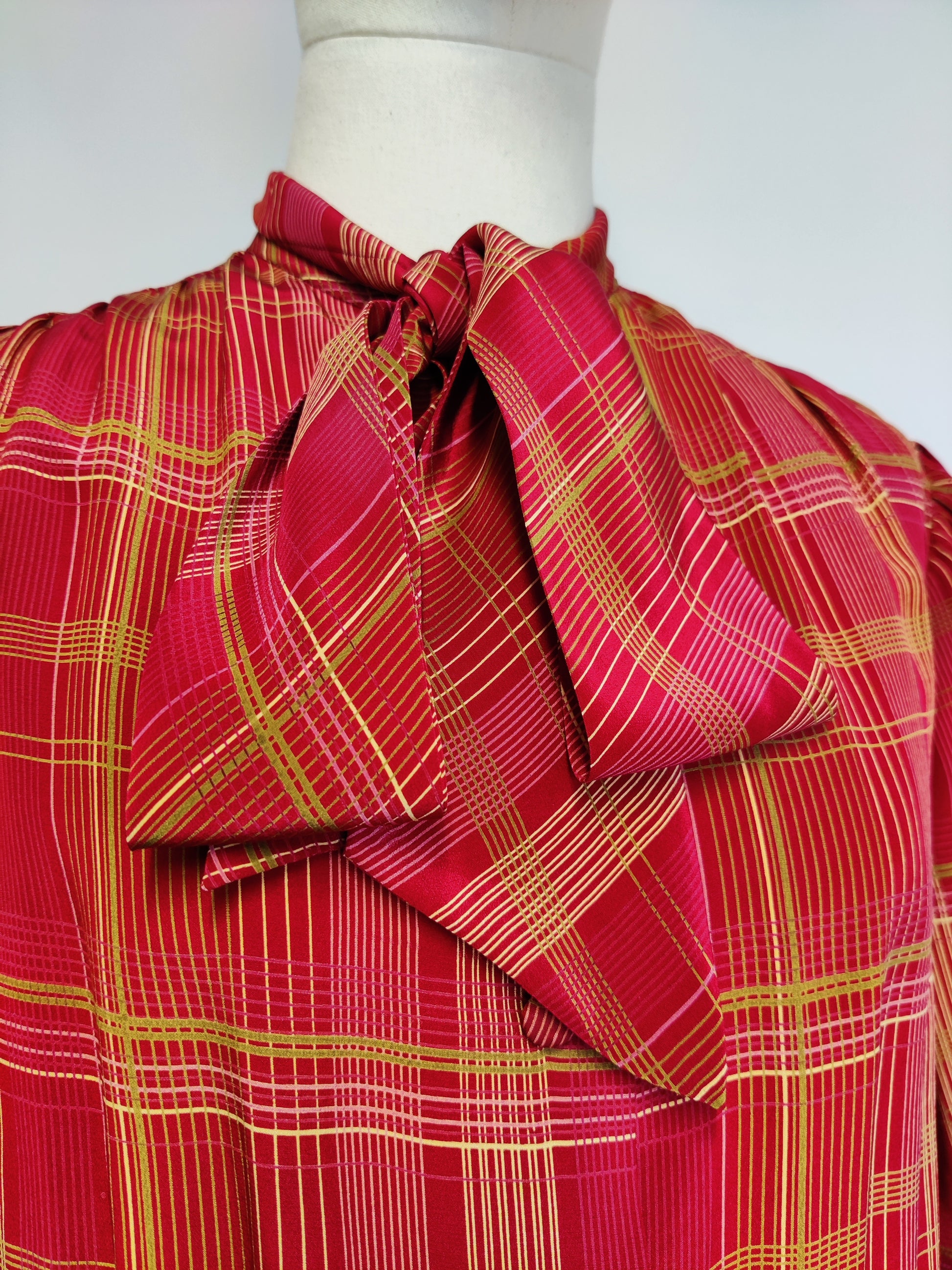 In a base colour of soft maroon in has a subtle pencil line check pattern in a muted shade of gold/camel.