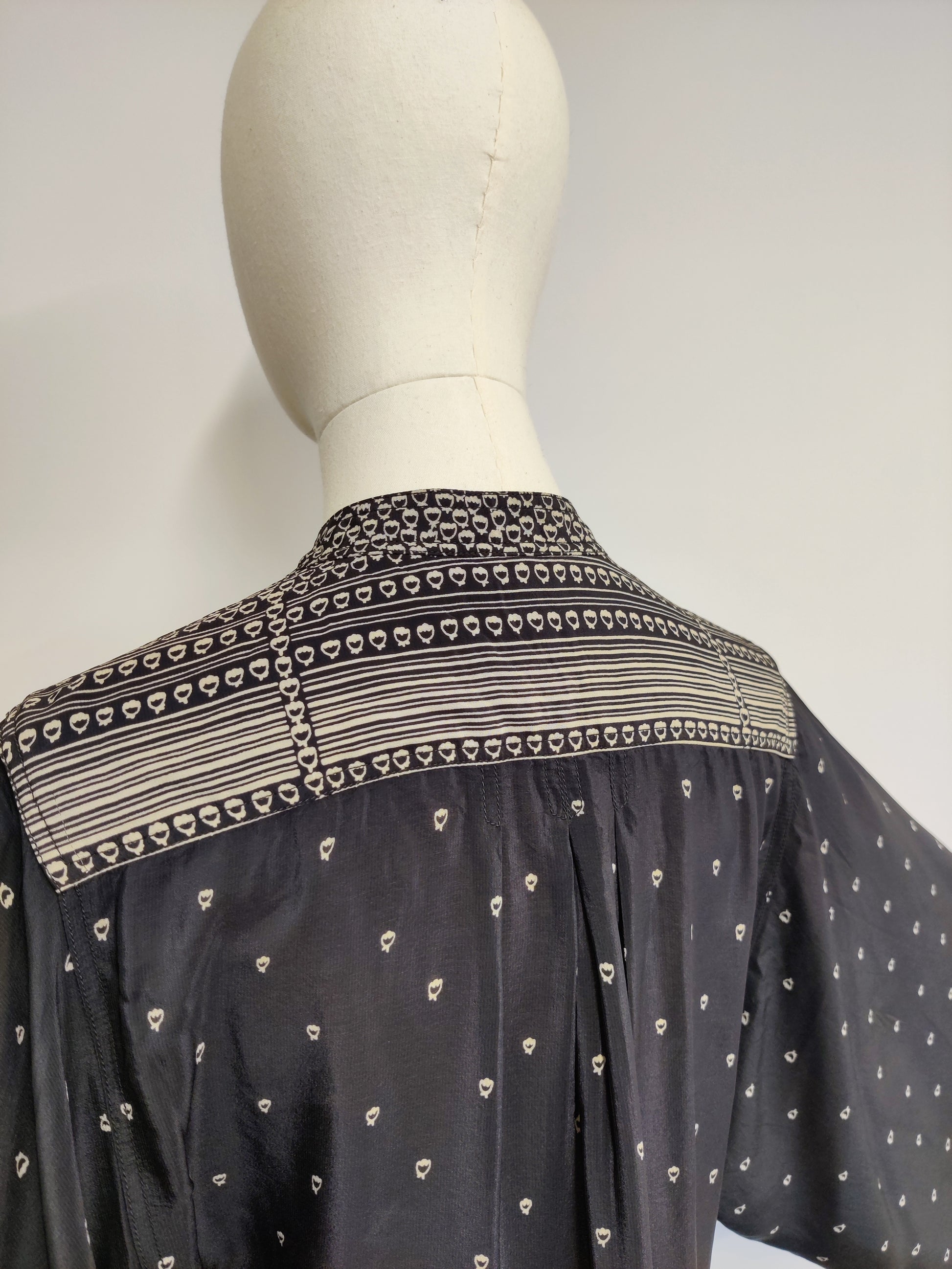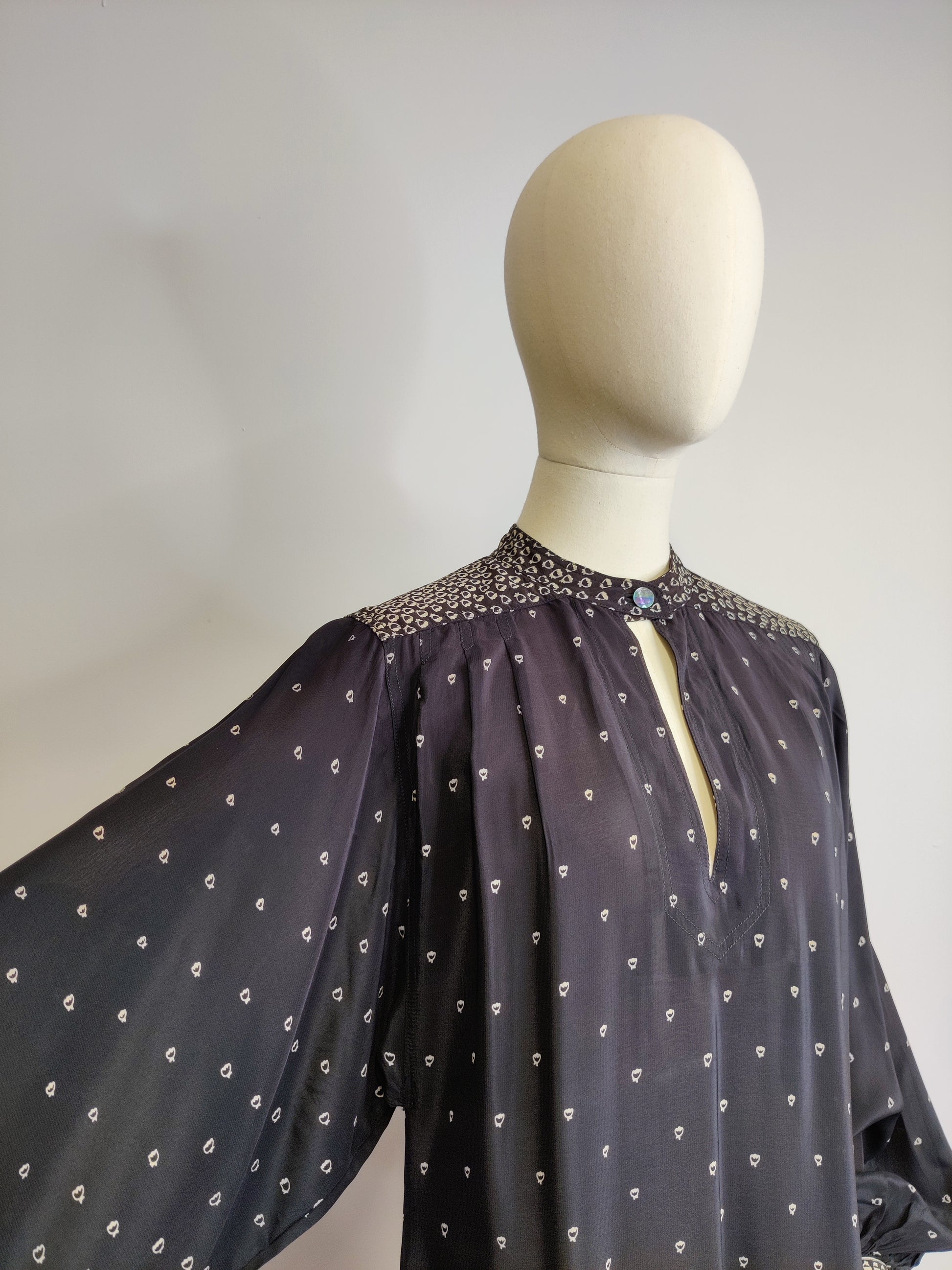 It has a stand up mandarin type collar with a front neckline slit and single mother of pearl grey button. It features a dolman style sleeve typical of the 70s/80s fashion. With long sleeves it buttons at the cuff with matching mother of pearl buttons. It has a narrow matching fabric tie belt.