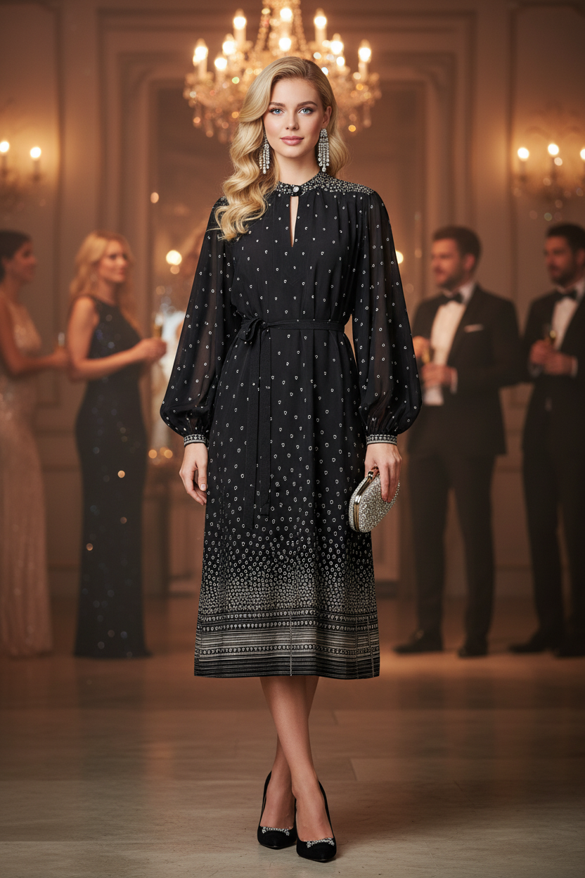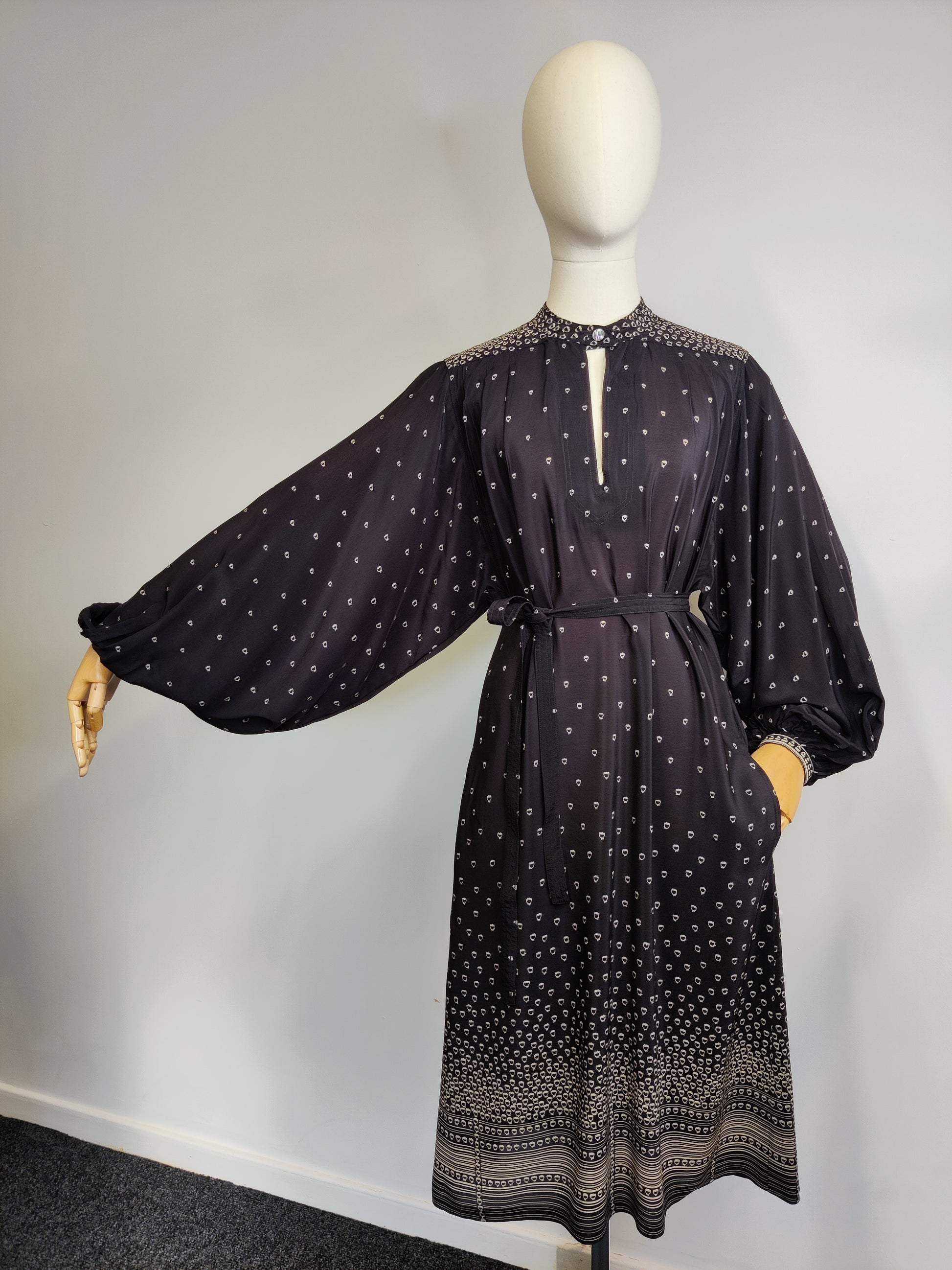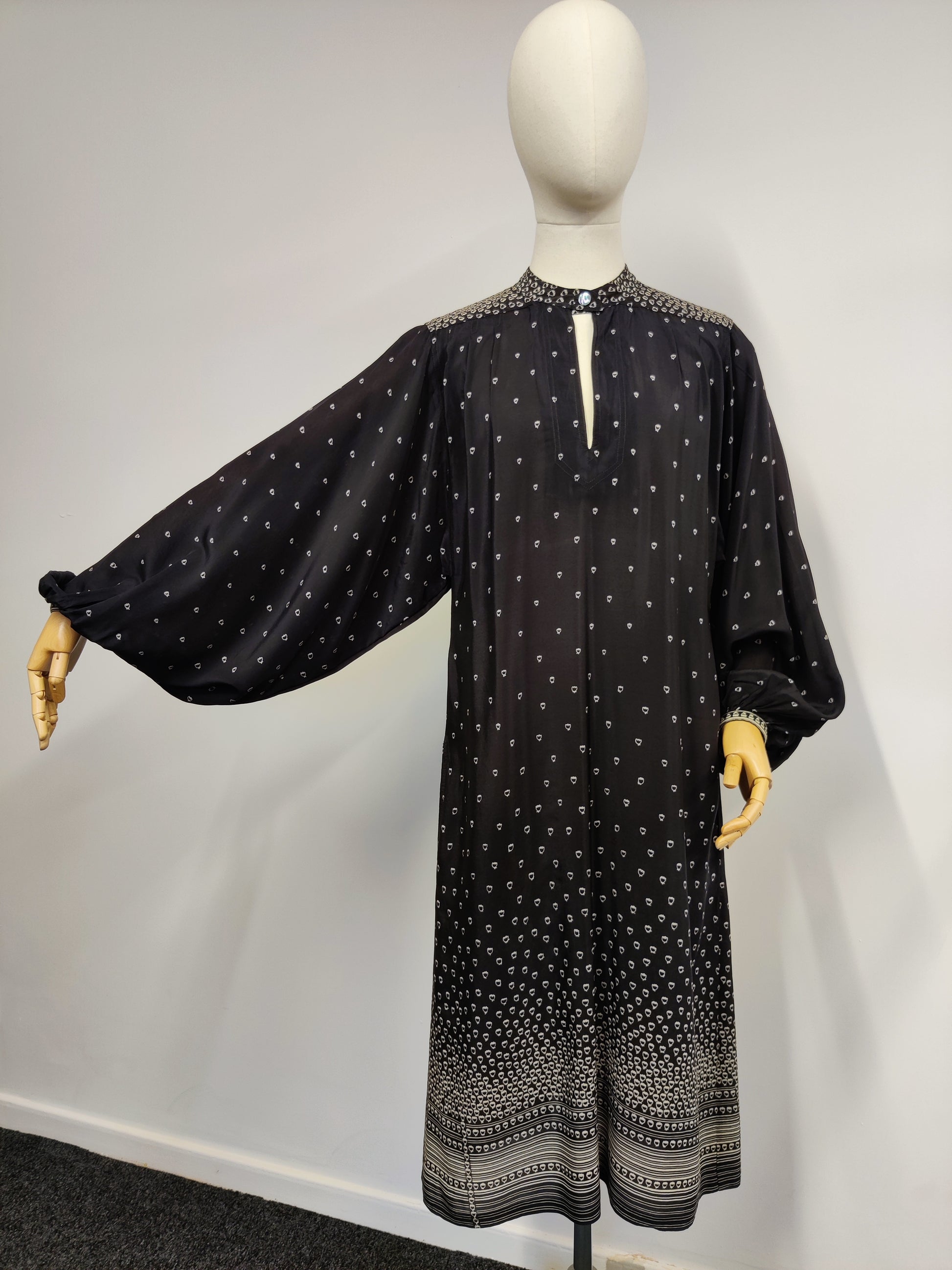 It is a gorgeous monochrome patterned dress in black and off white/ivory dating to the 1970s. Its made in a synthetic fabric imitating silk. It is probably an acetate mix. The pattern is cut so that the print forms a wide striped patterned border around the bottom of the dress.
