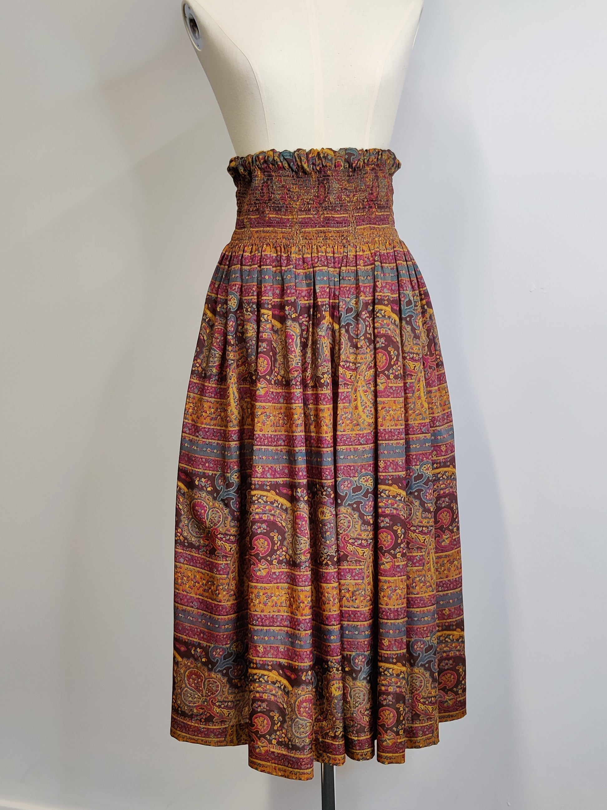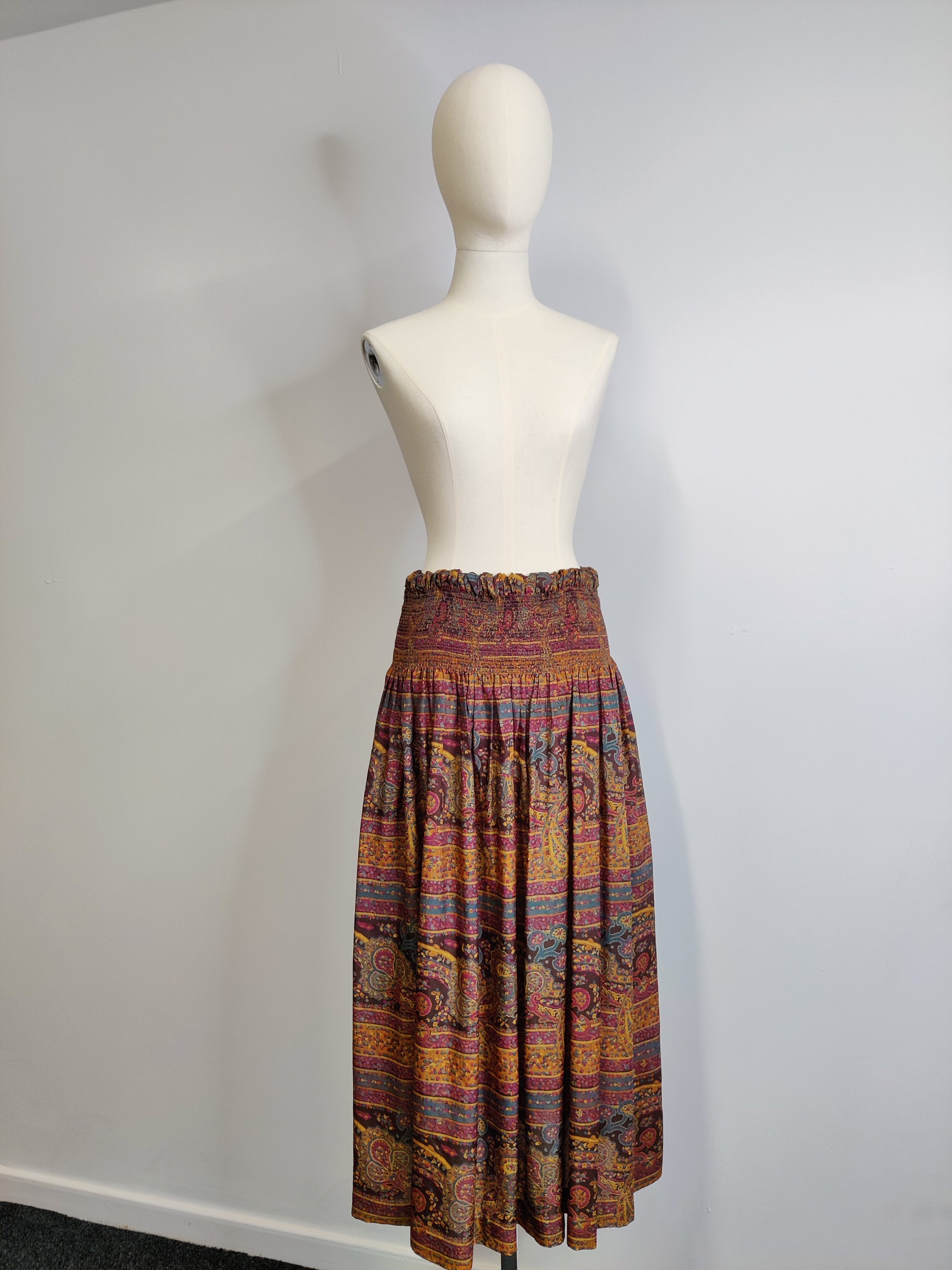 The skirt is mid to ankle length depending on your height. It has an elasticated channel at the waist. The top 5ins (13cms) of the skirt from the waist is elasticated smocking. This is designed to form a deep waist band. There are no openings and therefore the skirt is a 'pull on' style. The skirt has pockets set in the side seams at the hip below the waist smocking.