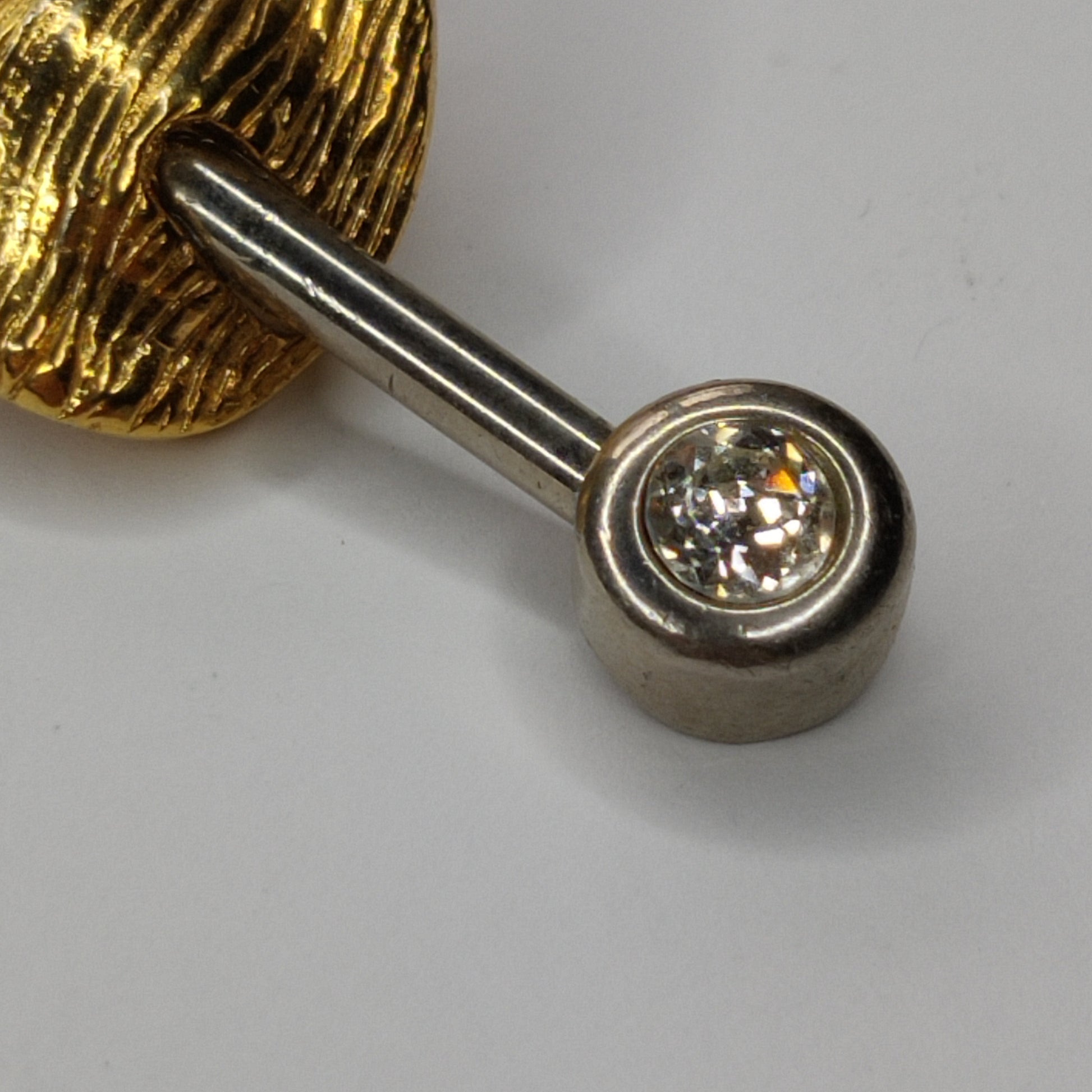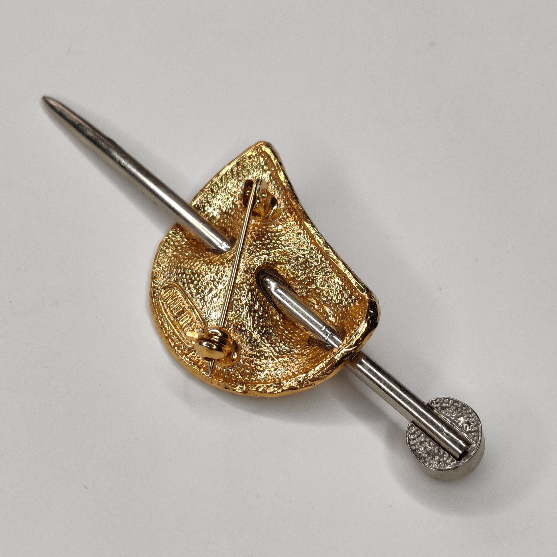 Modelled in gold tone and silver tone metal it depicts a pin piercing through fabric. The end of the pin features a clear diamante rhinestone and the 'fabric' is textured.