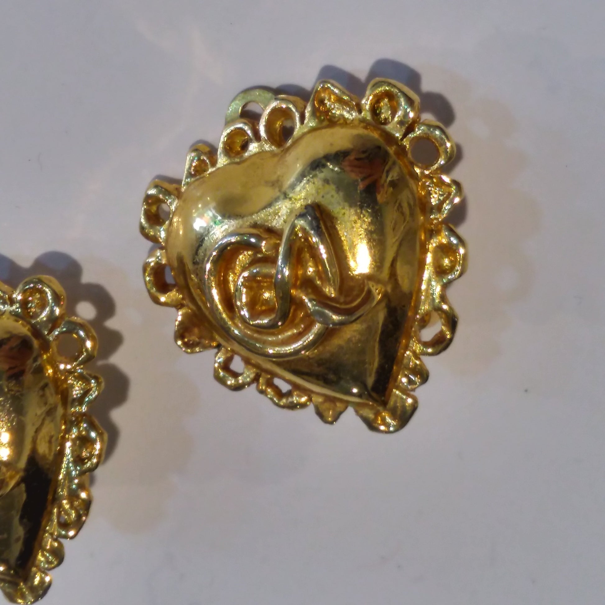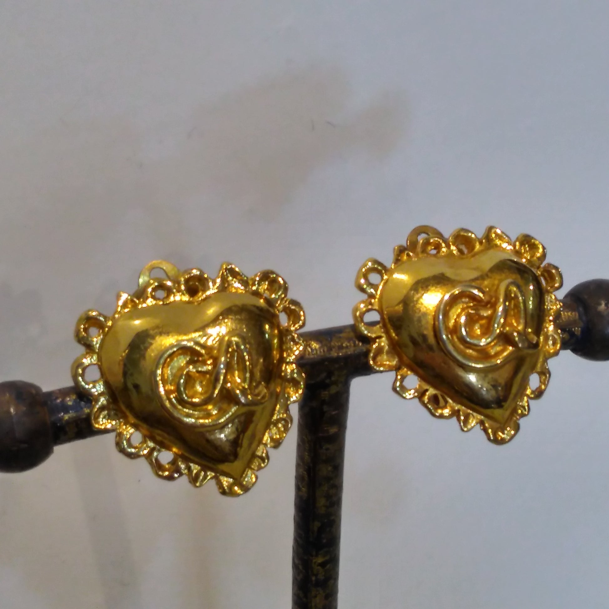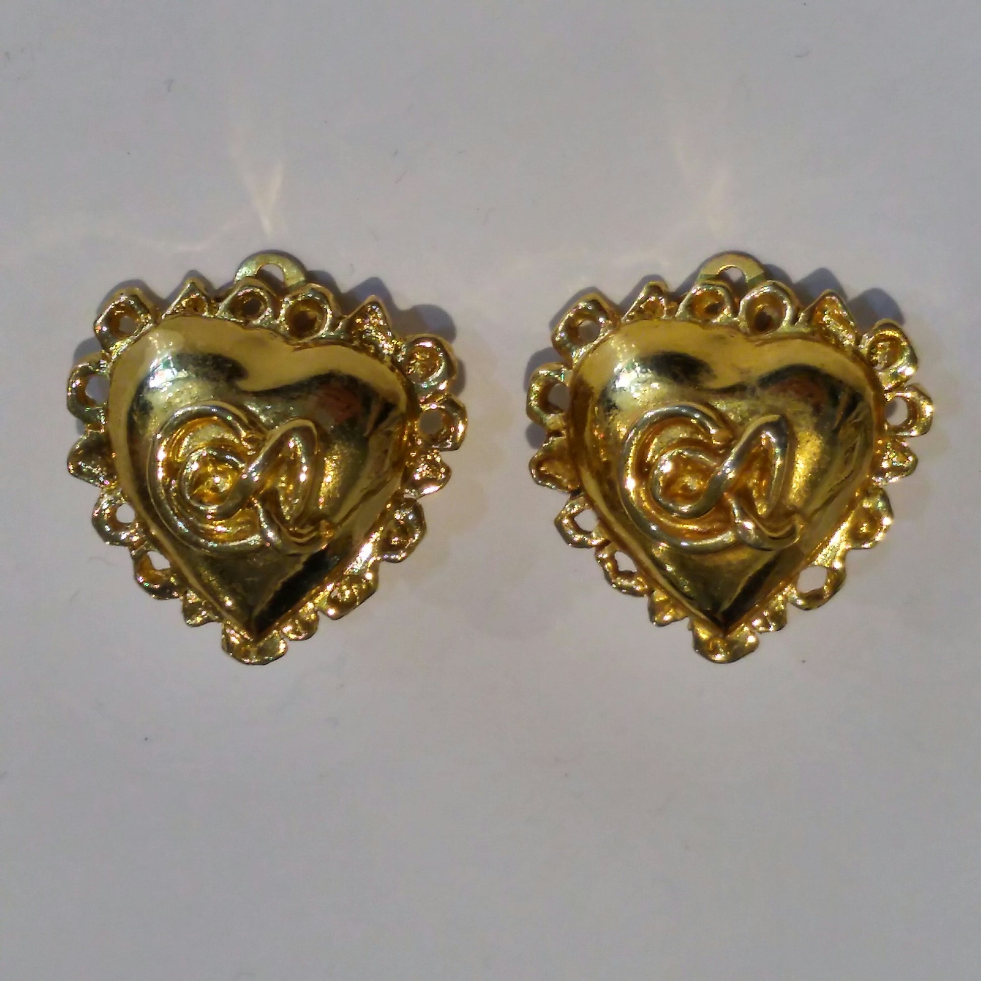 A striking pair of heart shaped Christian Lacroix clip earrings in gold tone metal. These date to the 1990s, are gold plated and feature the Lacroix logo in the centre of each earring.
