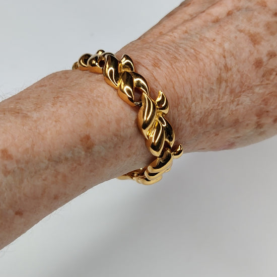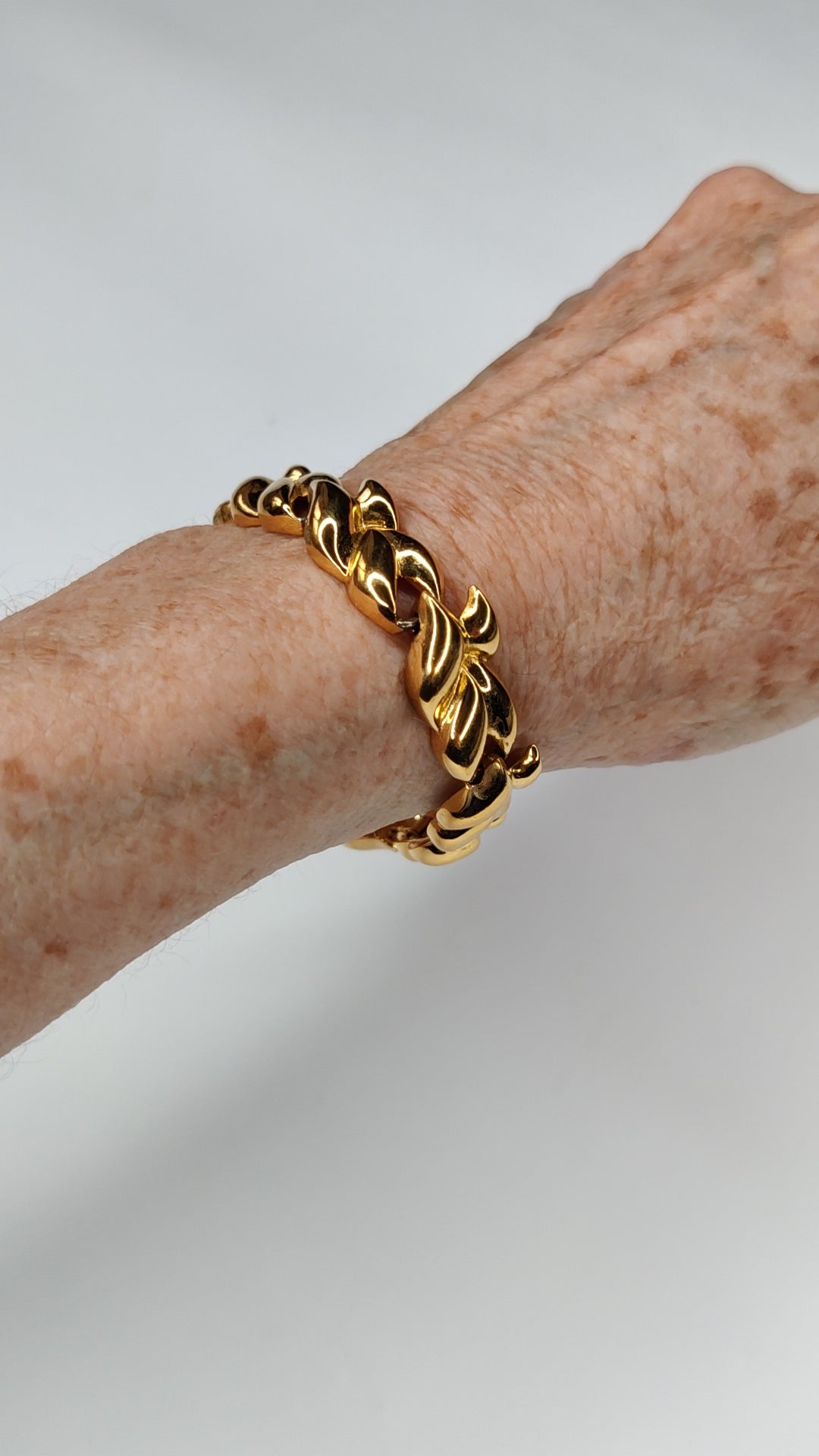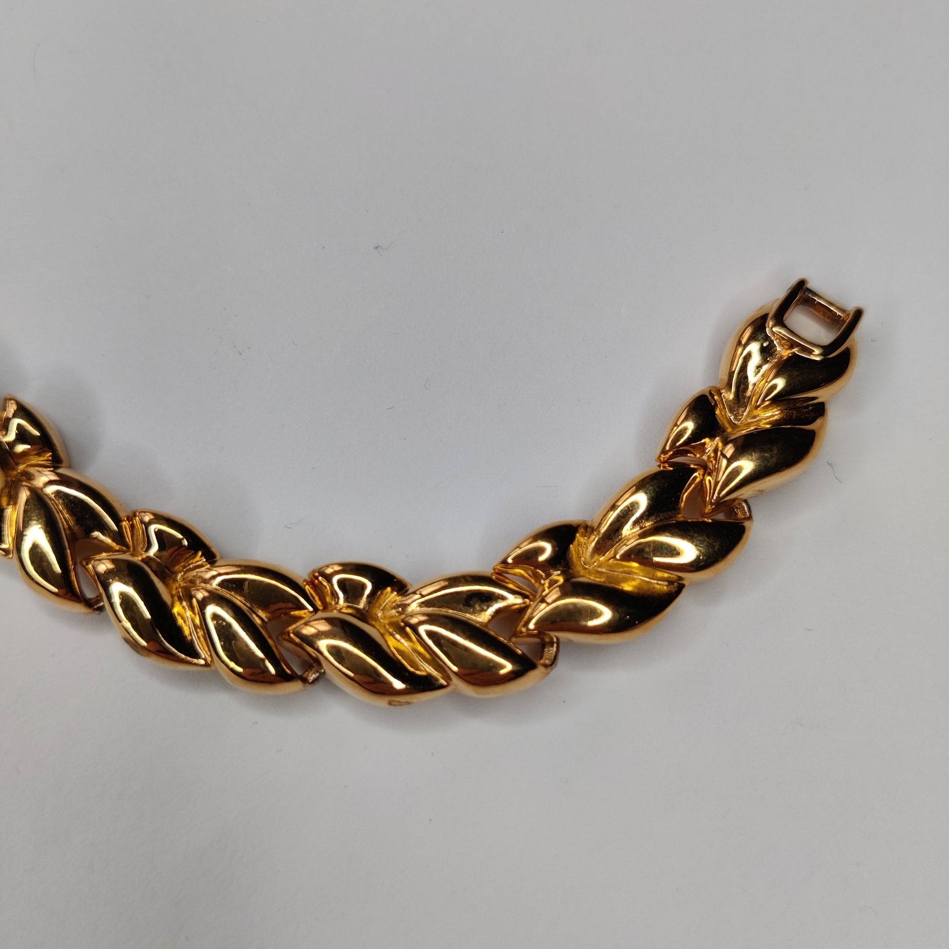 It features shaped leaf like articulated links in a deep gold tone metal. Most jewellery by Napier is silver or gold plated. We believe this is gold plated. The design creates a plaited effect. It has a fold over clasp with a firm closure