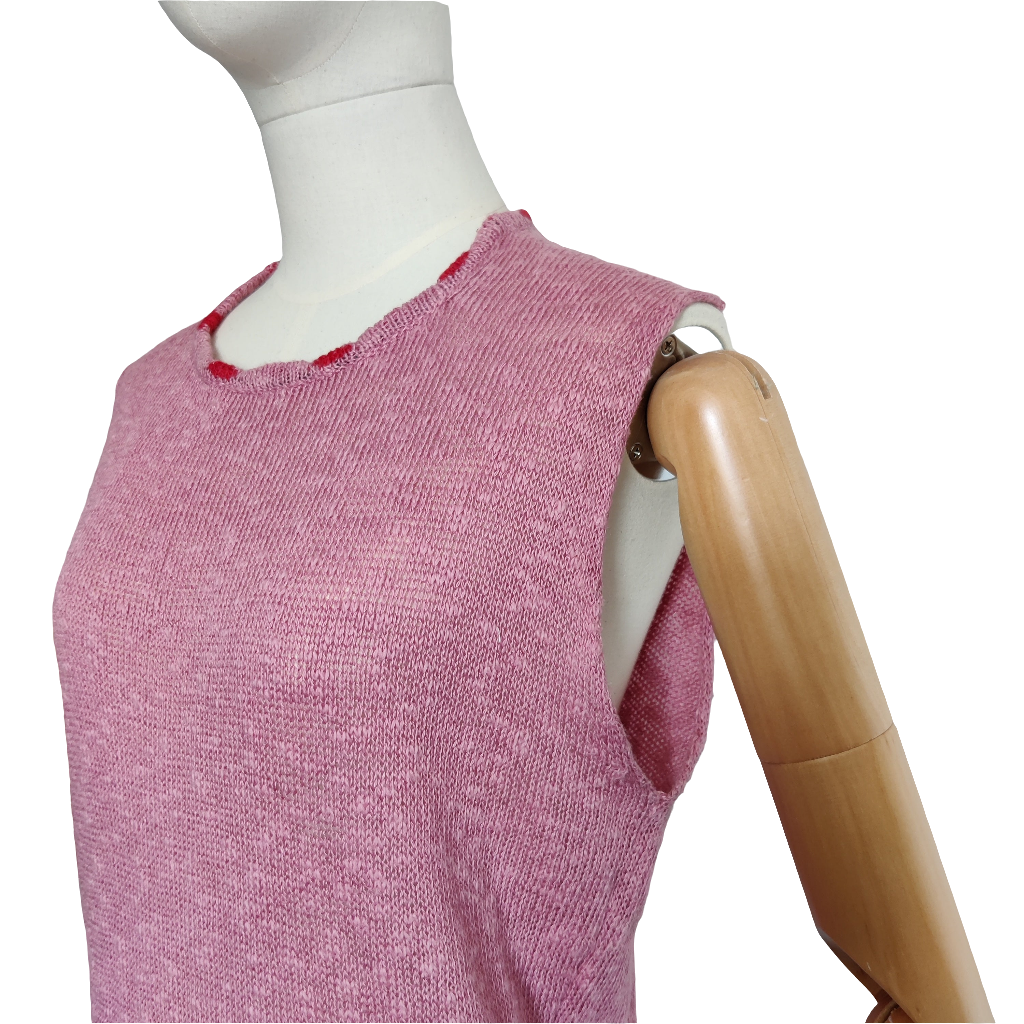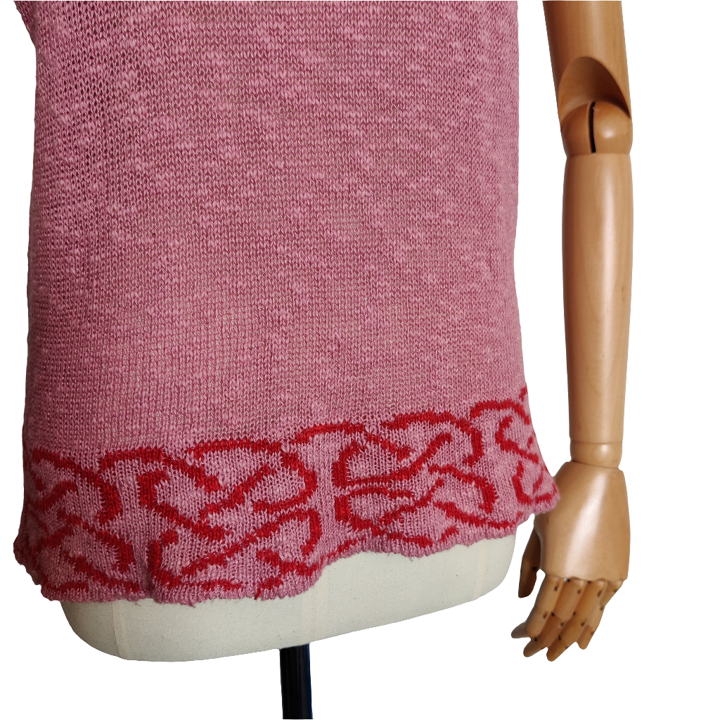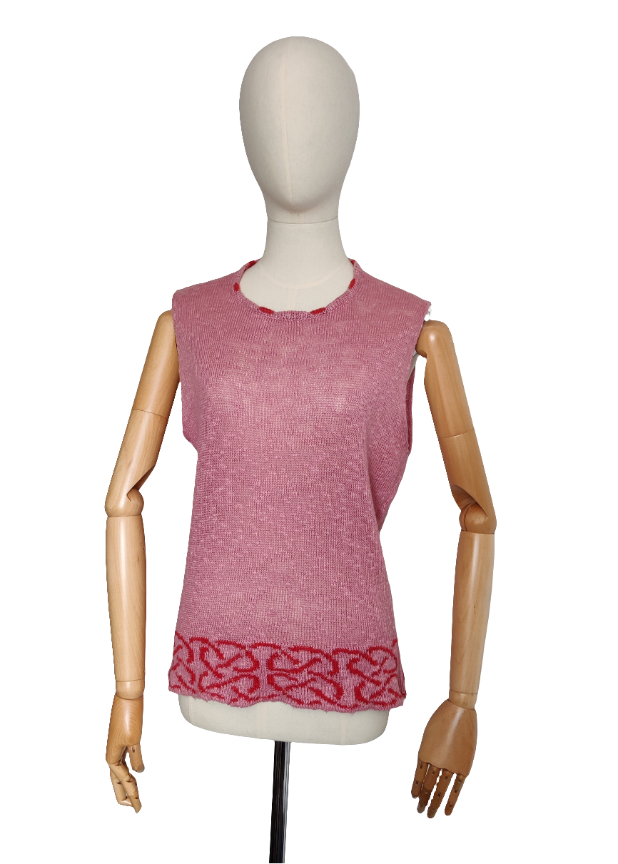 This is a modern sleeveless knitted slipover by Bill Baber which is handmade in Scotland. It is a dusky pink shade with a contrasting coral/red Celtic Knot edging pattern at the hem border and at the neckline. It is a fine knit in a long line style with roll over (unedged) deep armholes.