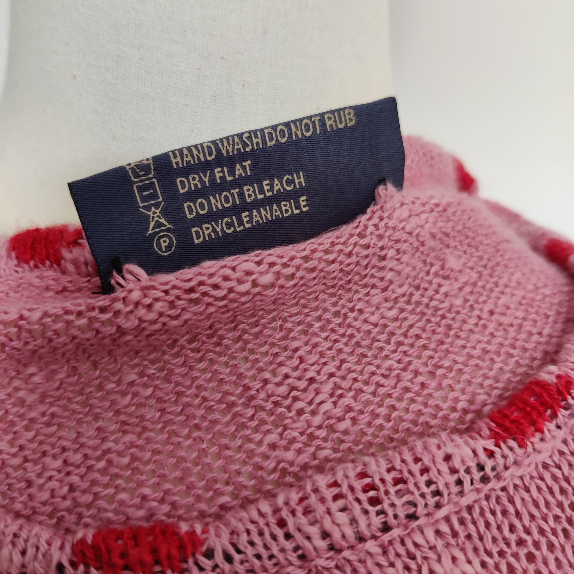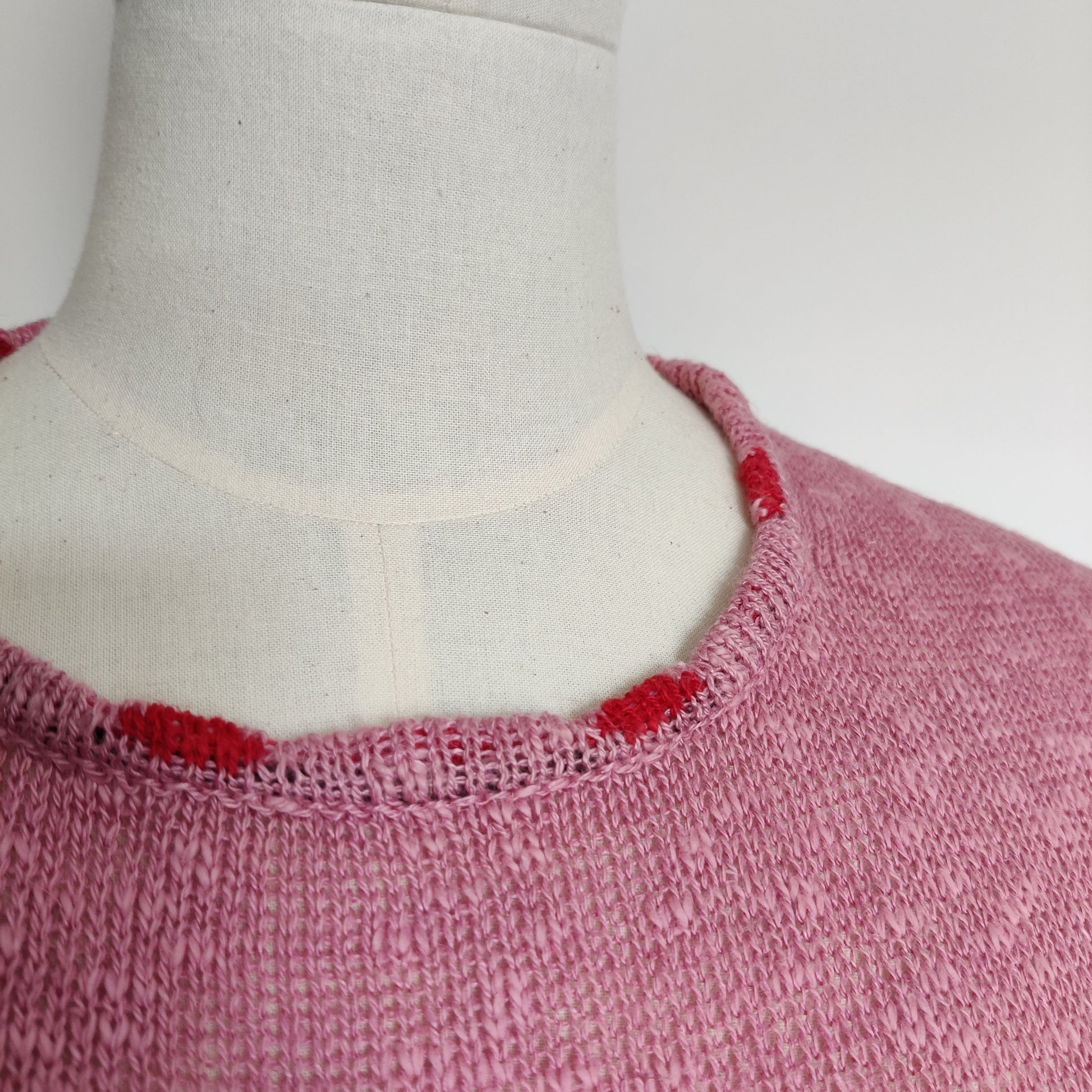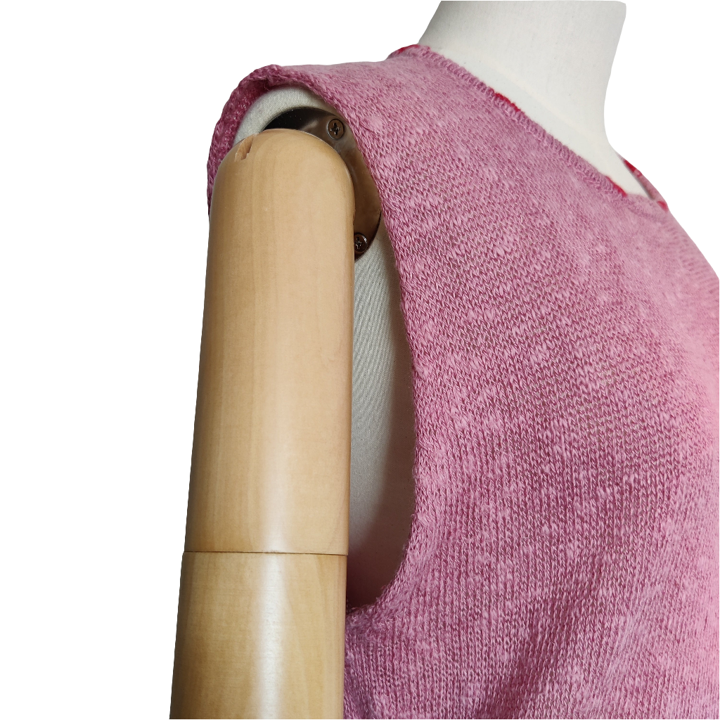 This is a modern sleeveless knitted slipover by Bill Baber which is handmade in Scotland. It is a dusky pink shade with a contrasting coral/red Celtic Knot edging pattern at the hem border and at the neckline. It is a fine knit in a long line style with roll over (unedged) deep armholes.