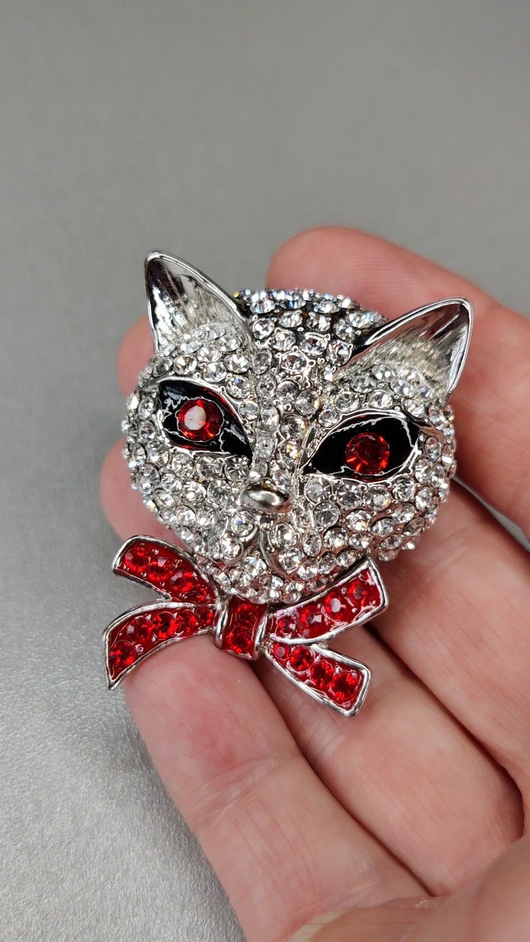 In silver tone metal it features diamante pave with jewelled ruby red eyes and neck bow. As it's three dimensional it glints and catches the light beautifully.
