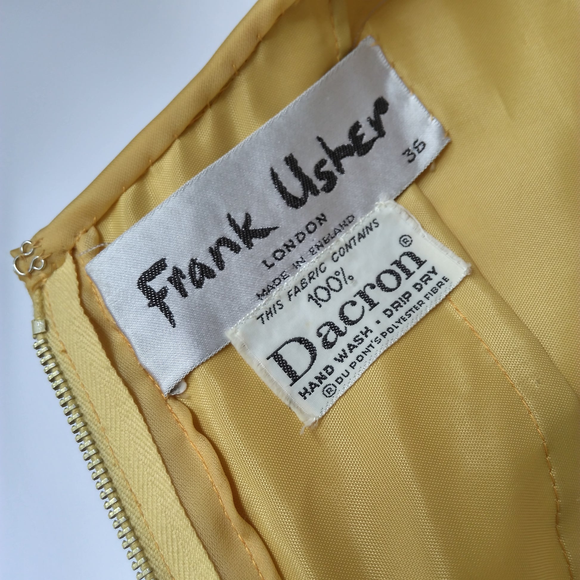 It is a Frank Usher model made from Dacron which has a slight sheer quality. It can be hand washed and drip dried. The dress is fully lined and has an original long metal back zip.