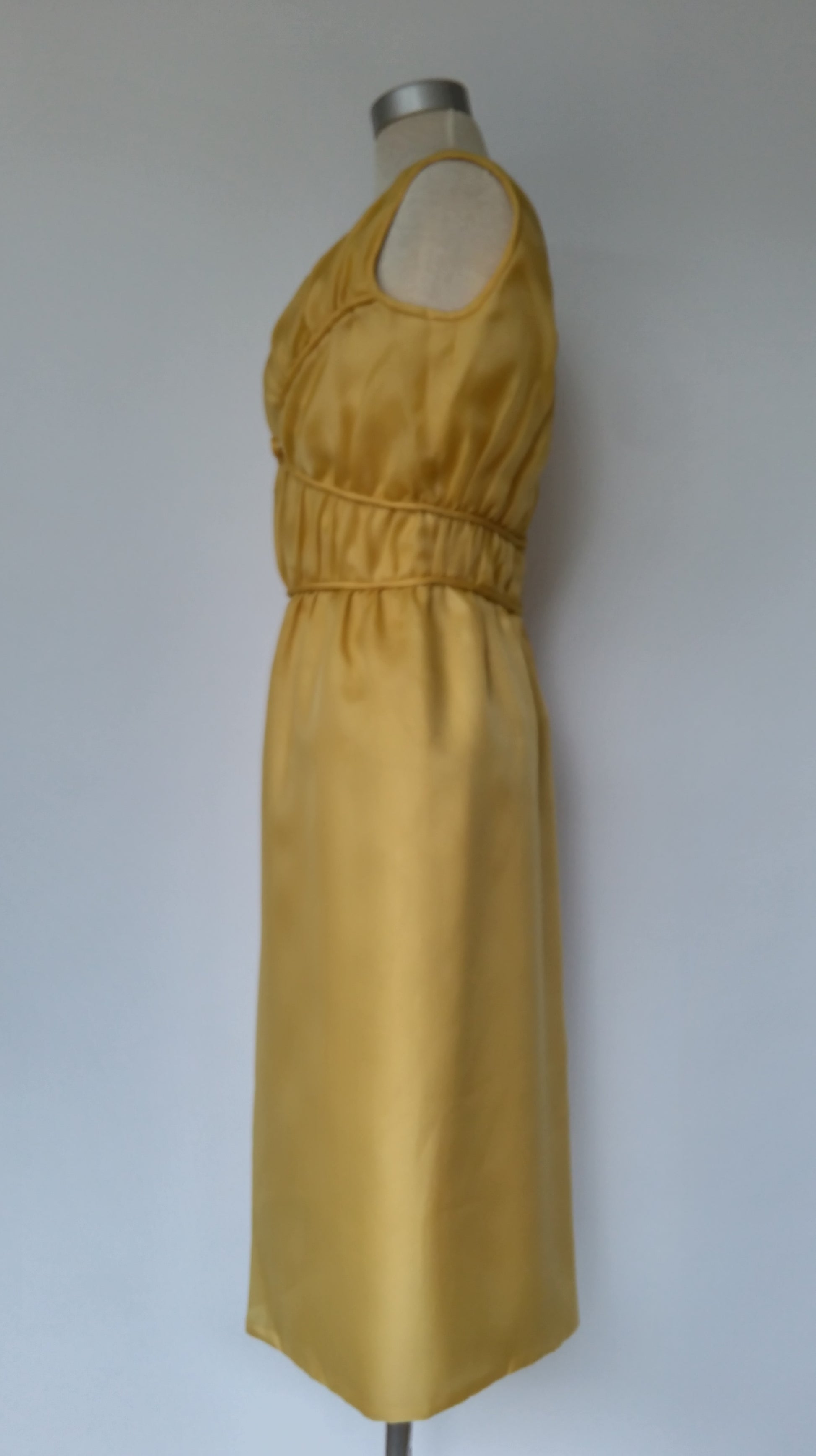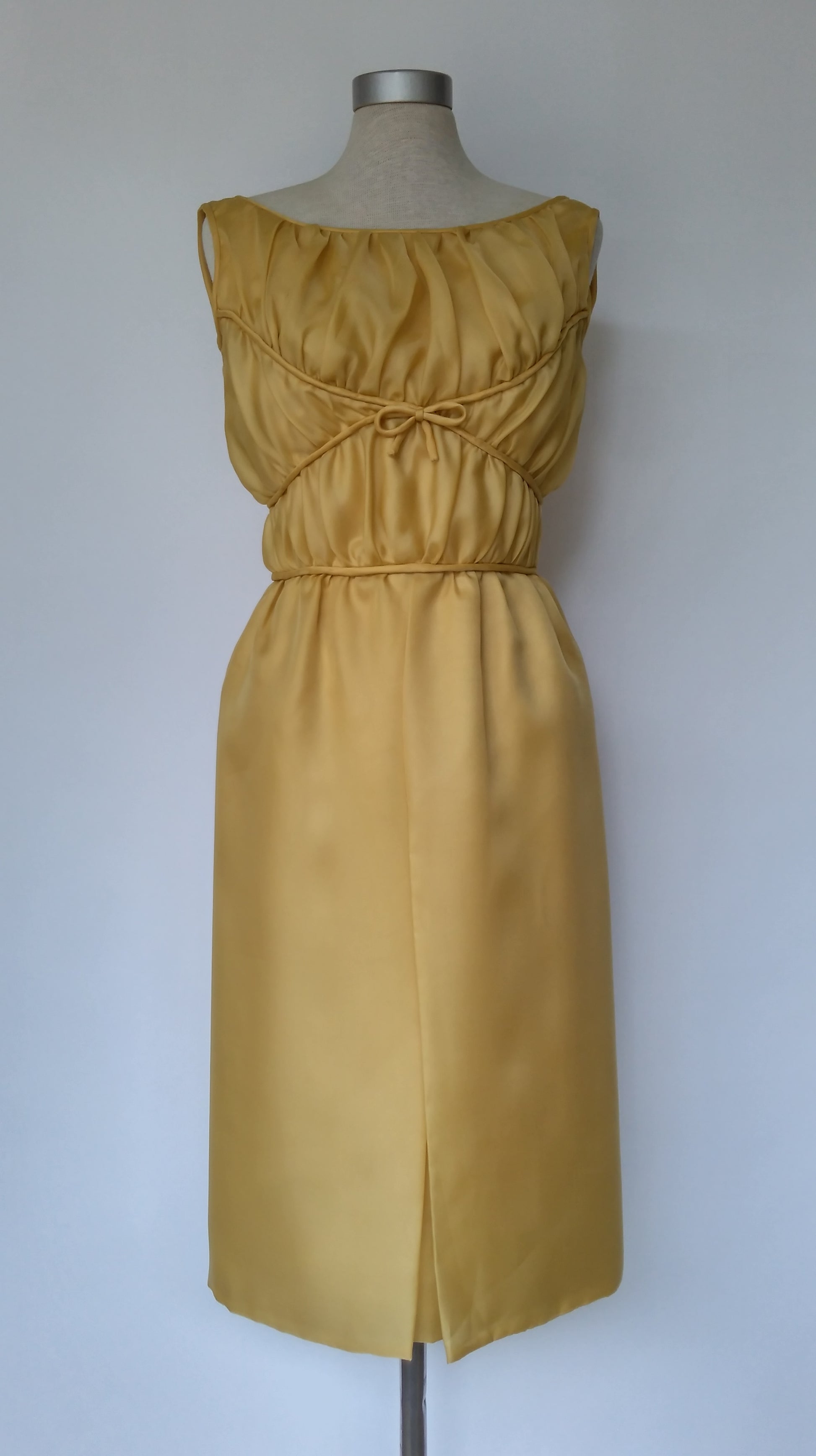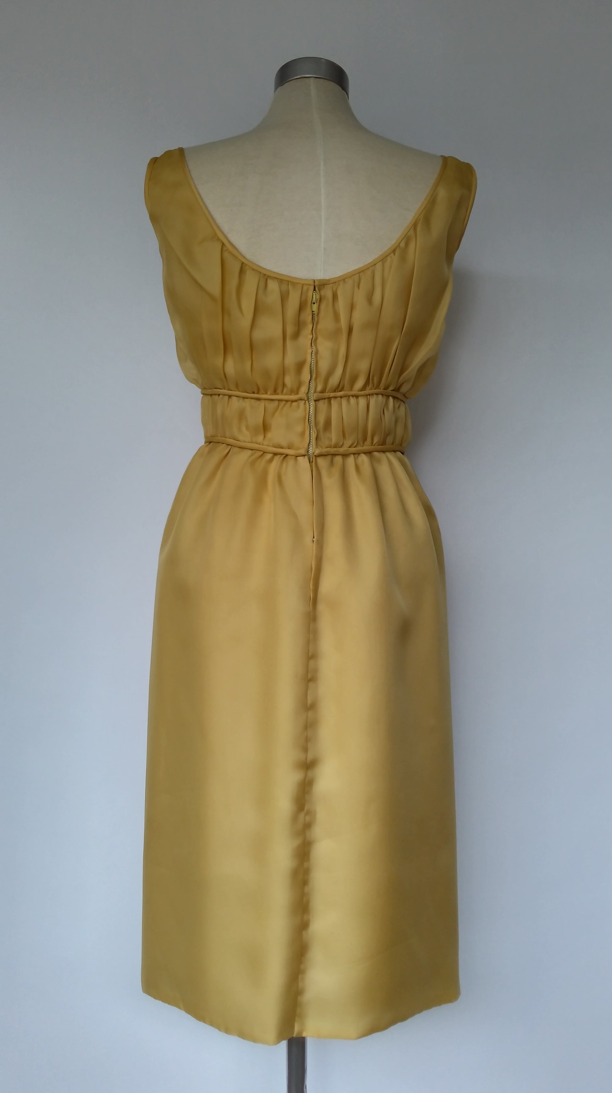 This is a cute 1960s sleeveless cocktail dress in a gorgeous shade. Its scooped neck, piping detail and overlay skirt are so evocative of that sophisticated sixties era.