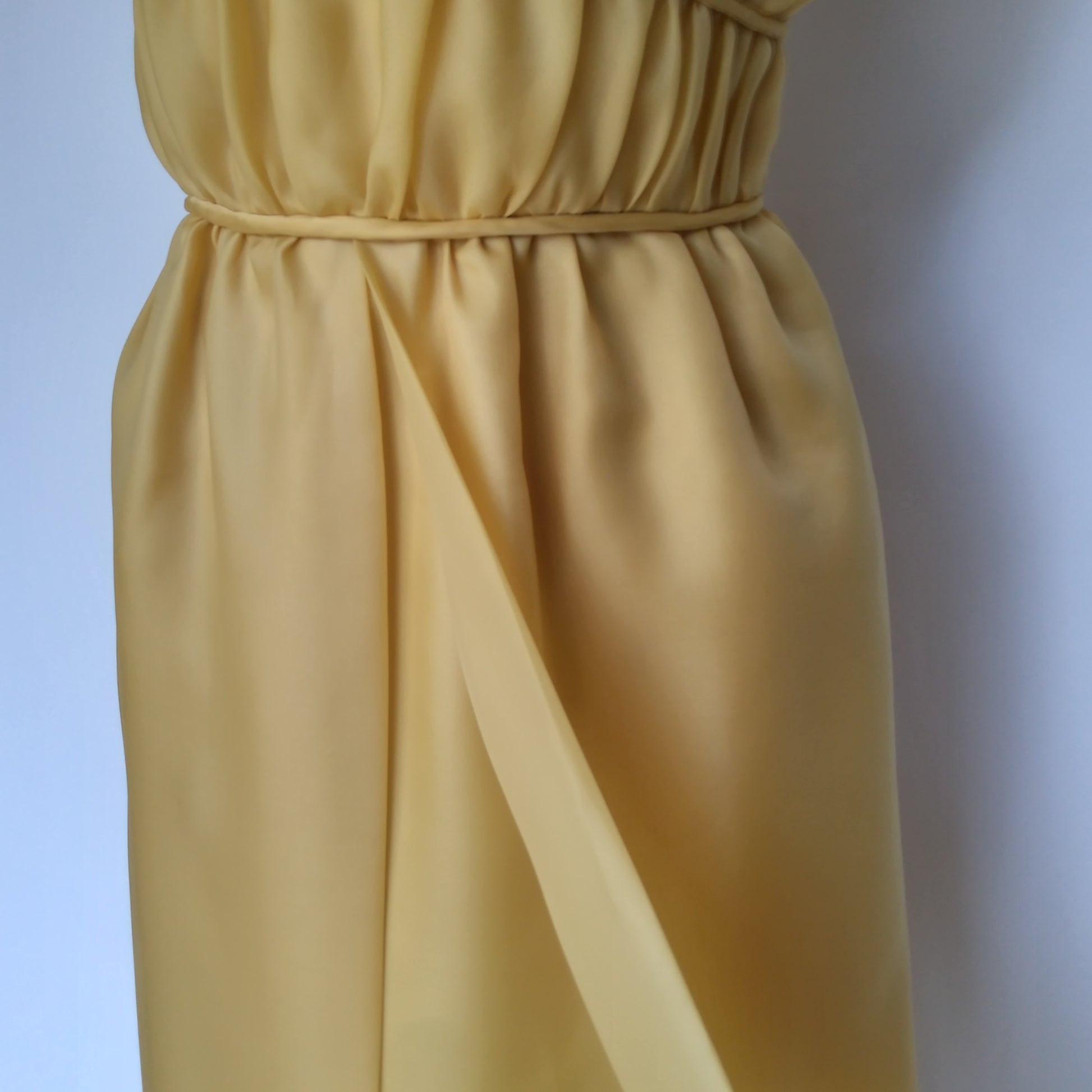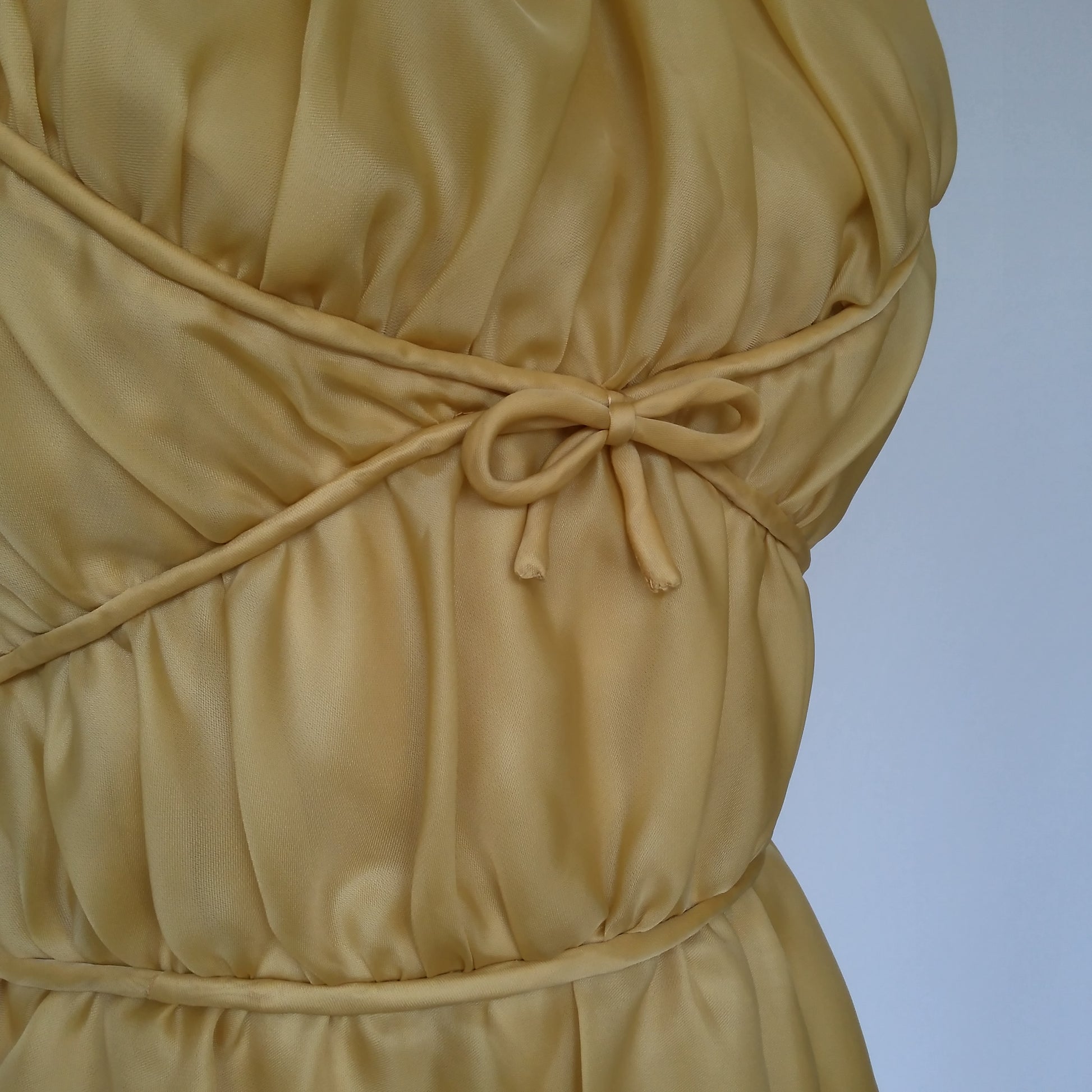 It is ruched over the bodice with criss cross piping detail which is also around the waist and it carries a little bow at the centre bust. The skirt is in two layers with the overlay meeting and is opening at the front creating a faux split.