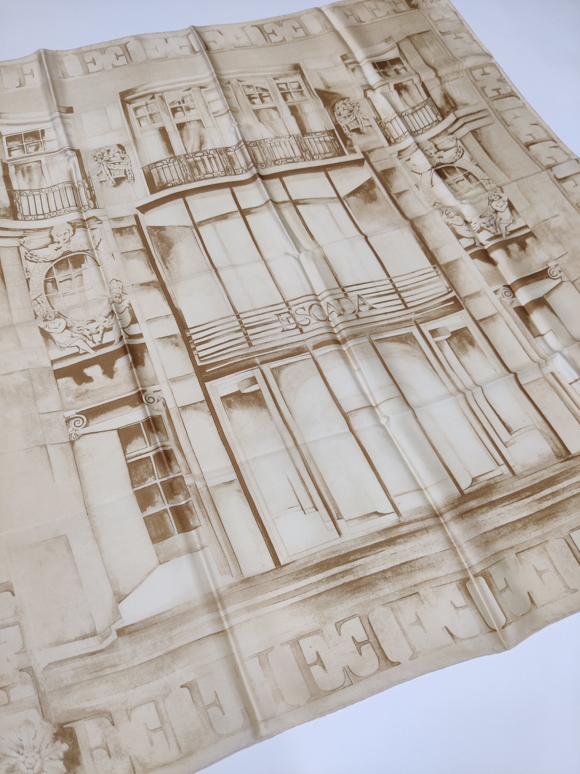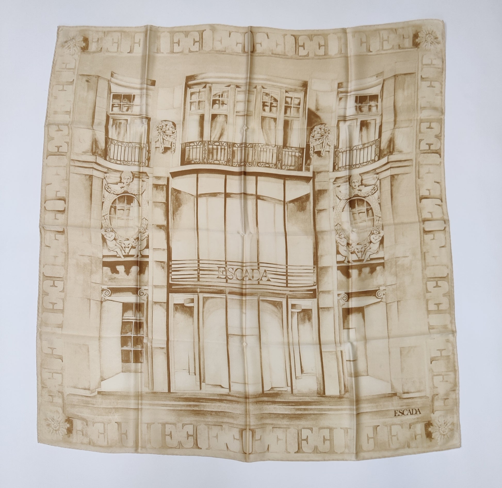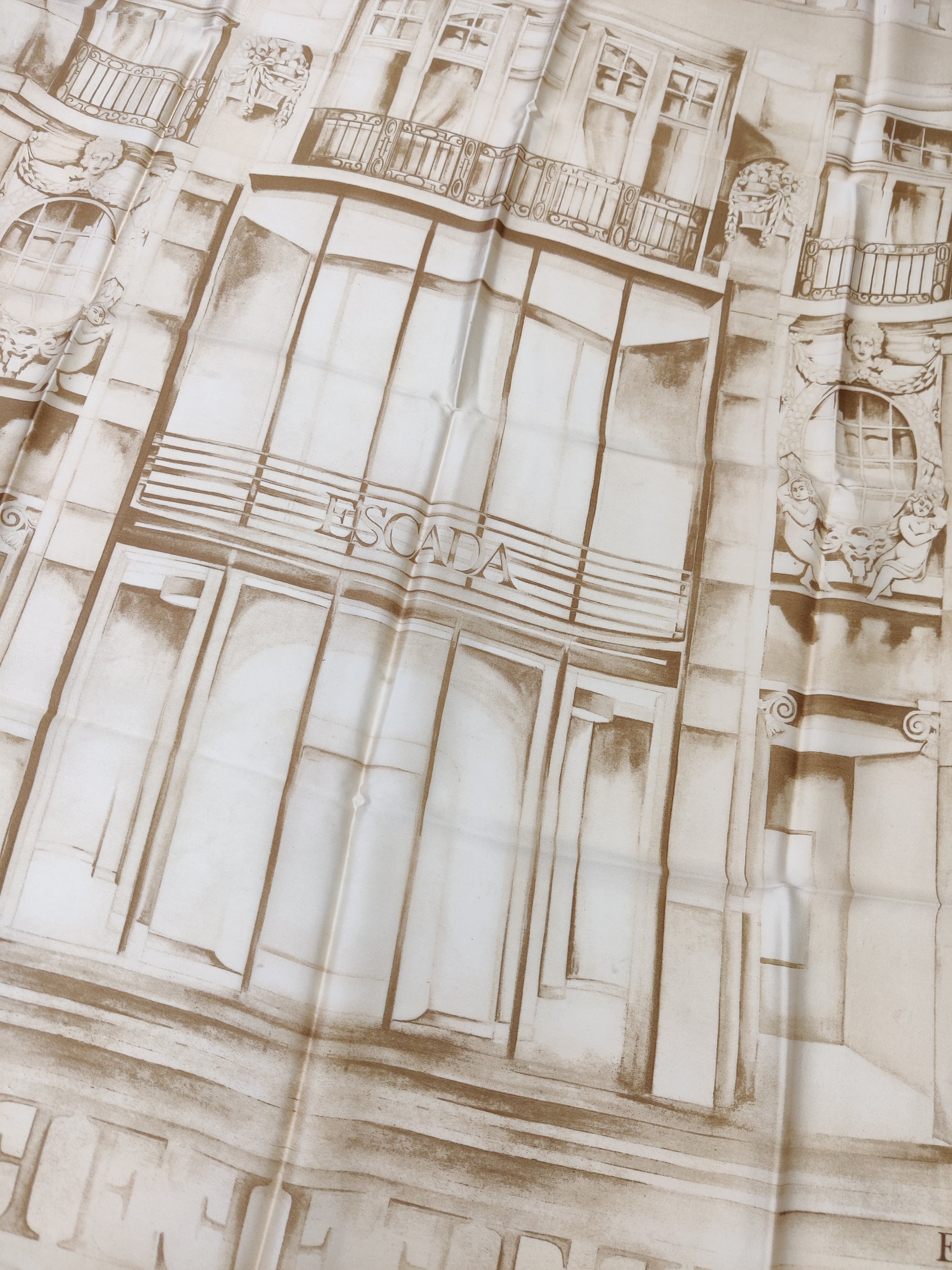 In rich creams and soft browns it depicts an historical facade with the Escada name. Perhaps one of their stores?