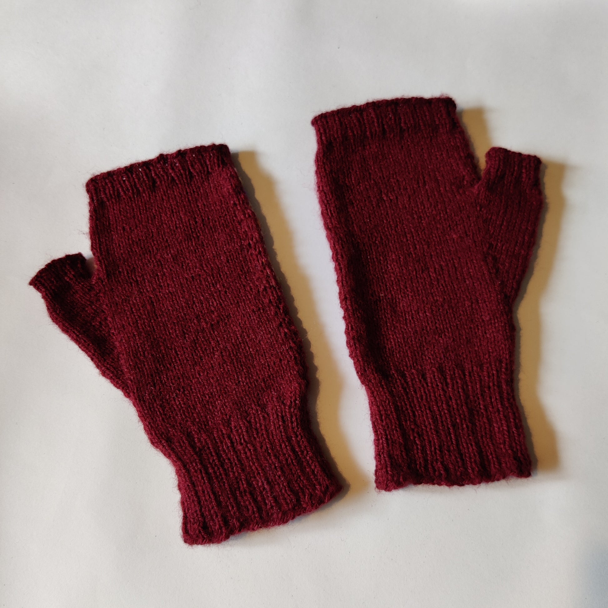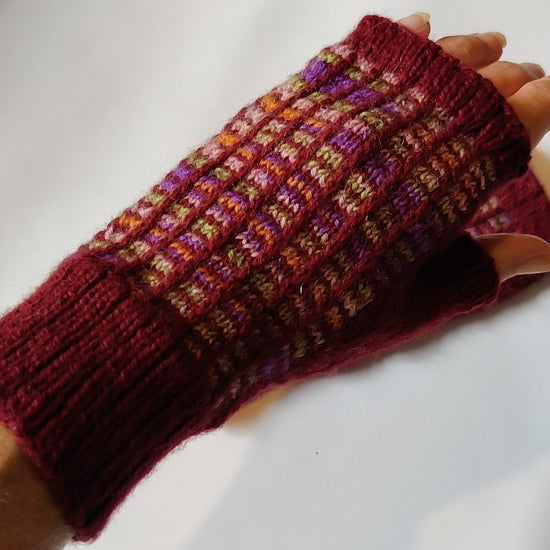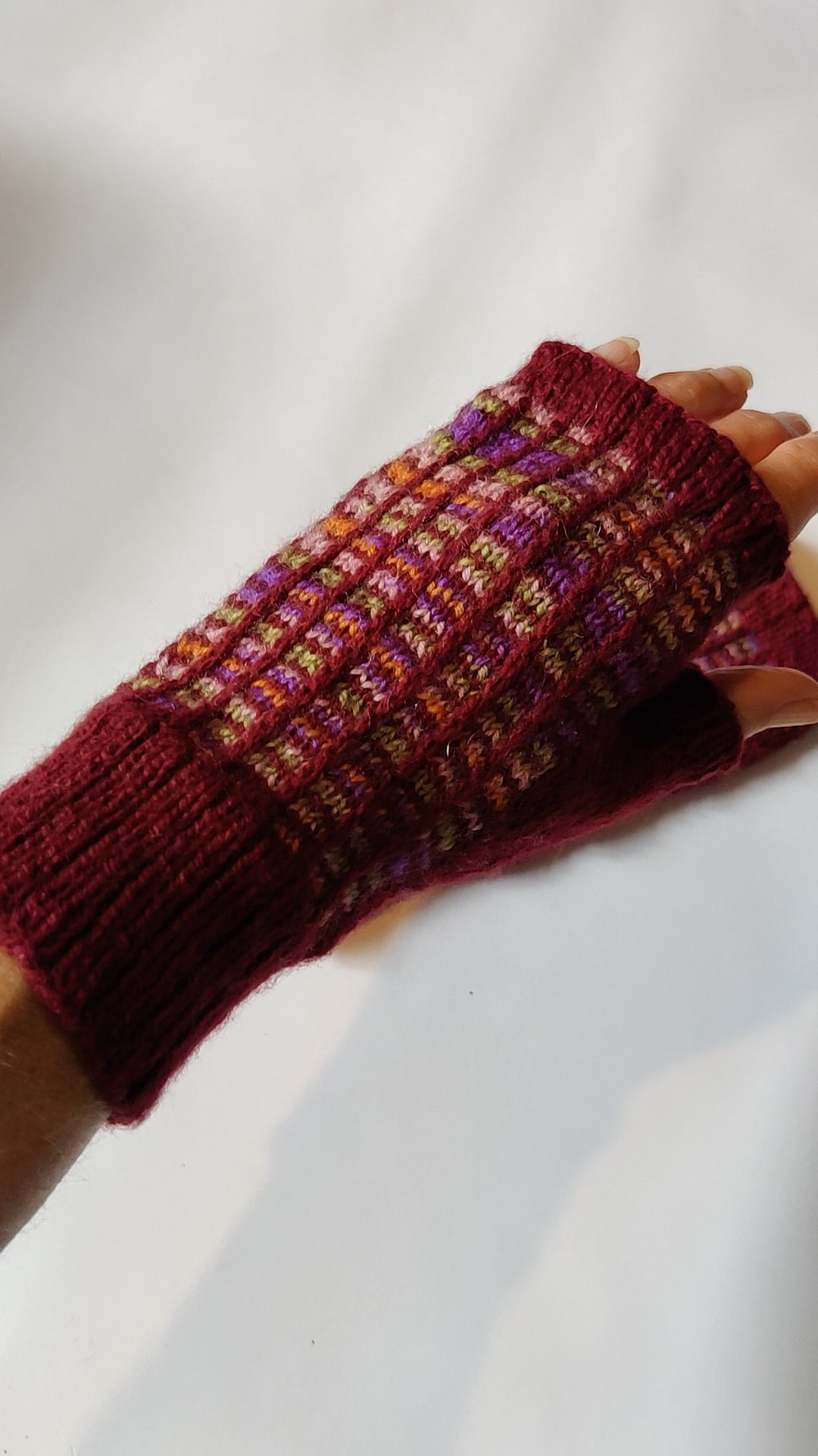 These beautiful and unique fingerless gloves are hand knitted in recycled/upcycled vintage yarns.