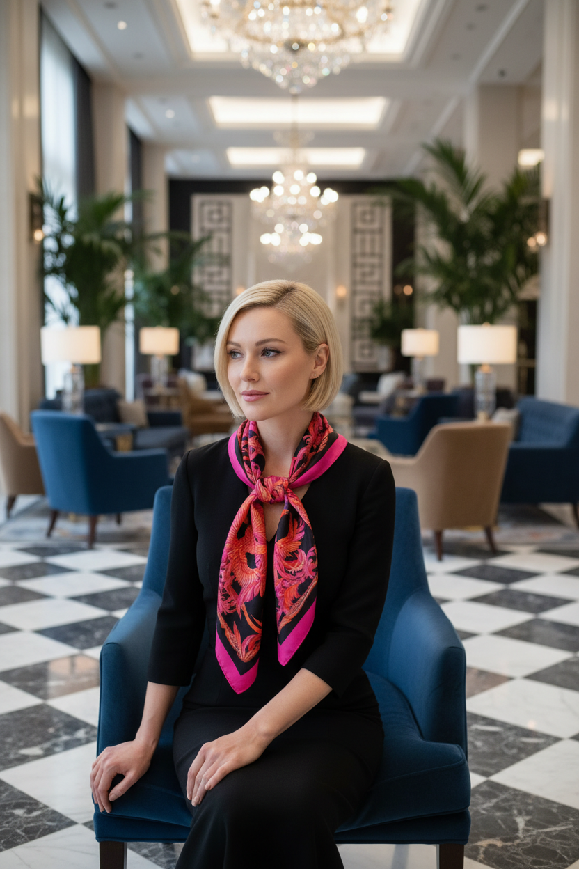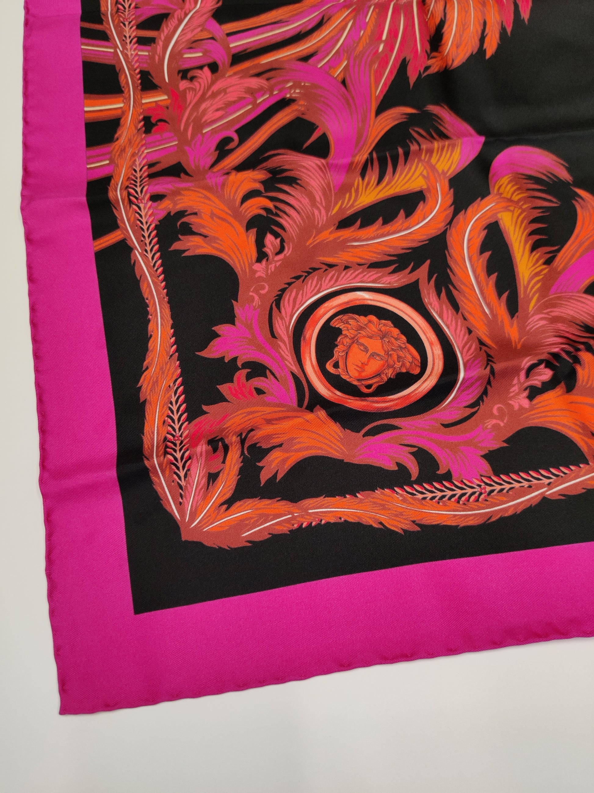 This is a vibrant pink, orange and black multicolour printed silk twill scarf by Versace.