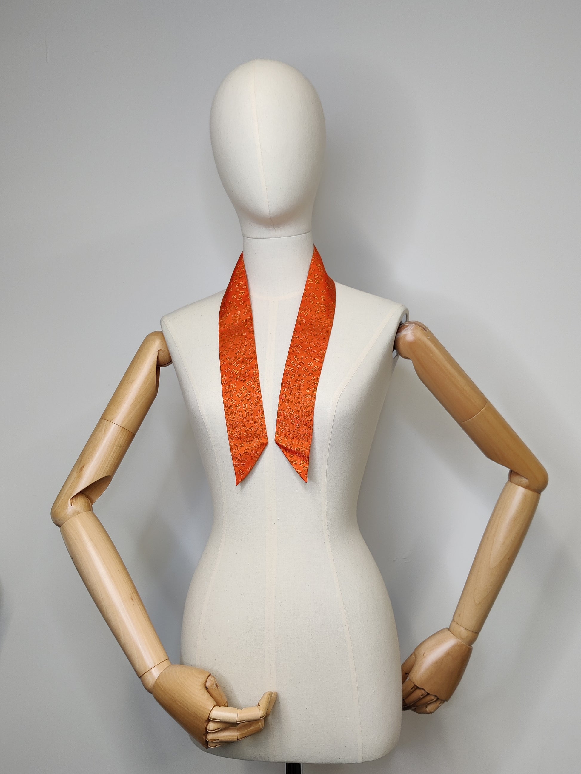 This is an Hermes Silk Twilly in the classic Hermes orange featuring a print of individual capitalised letters of the word Hermes scattered throughout.