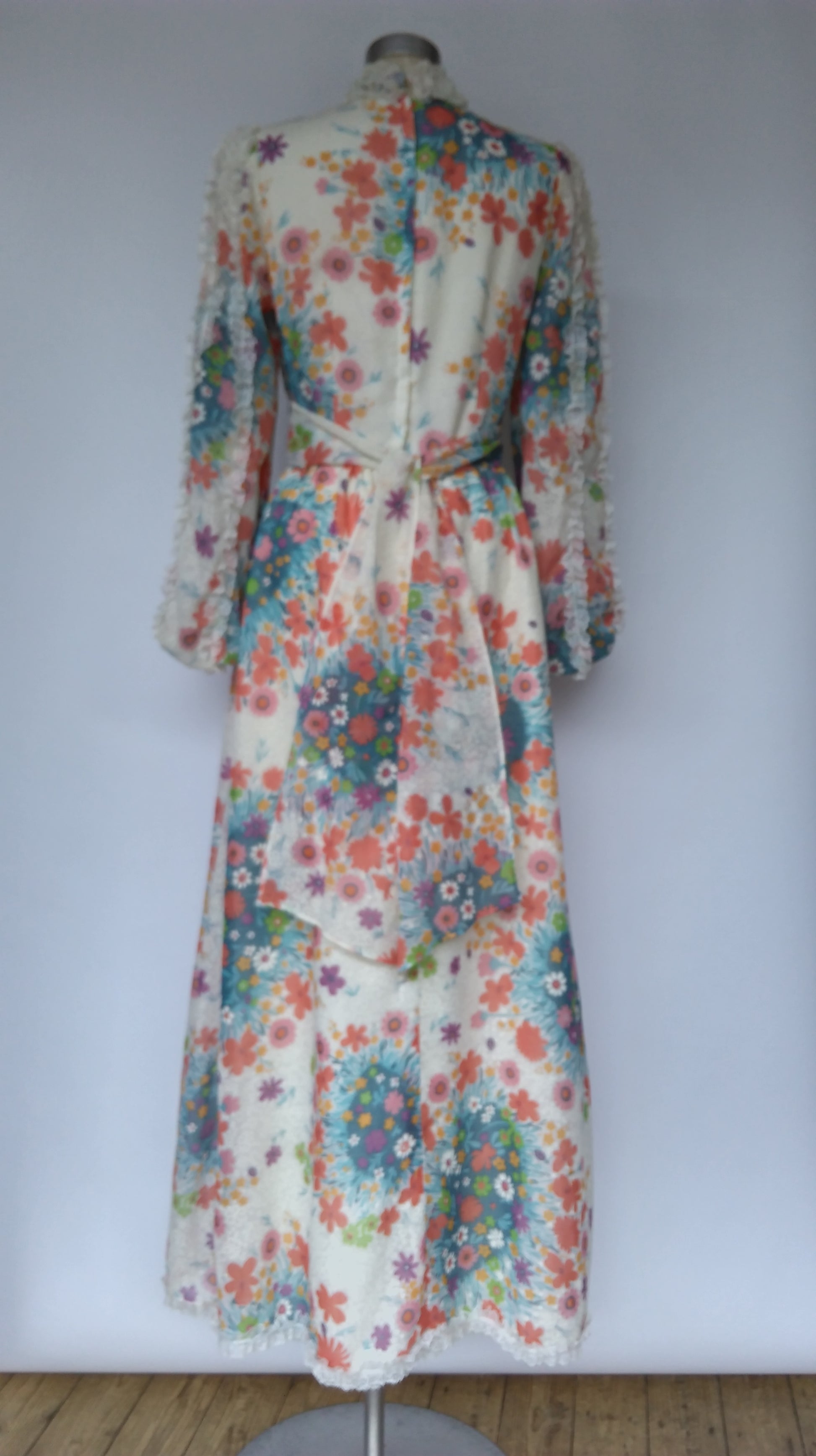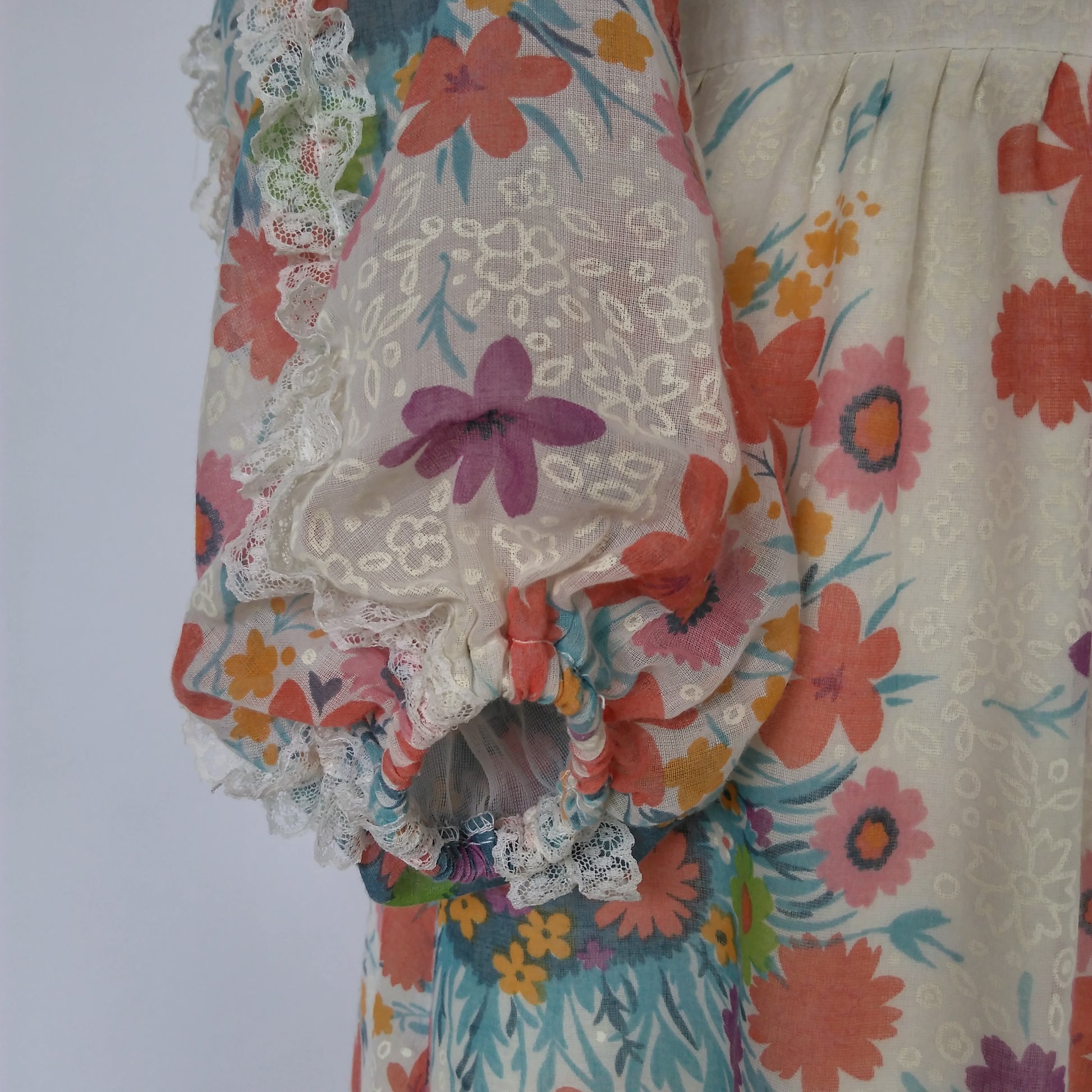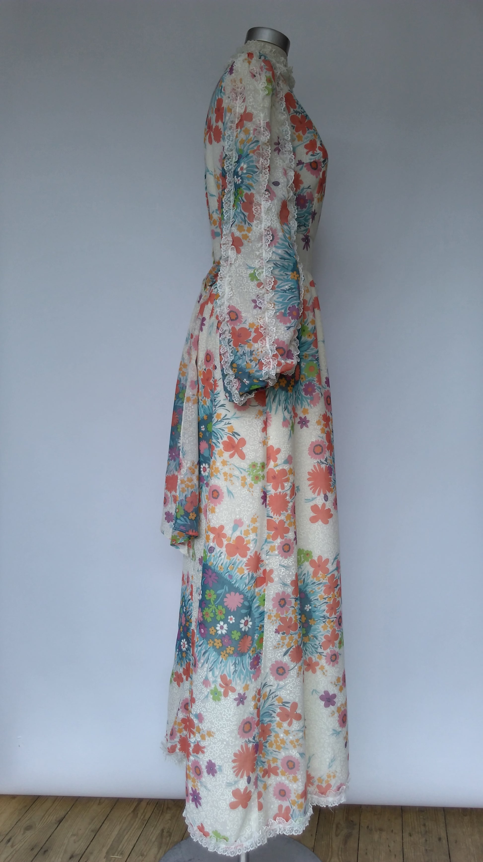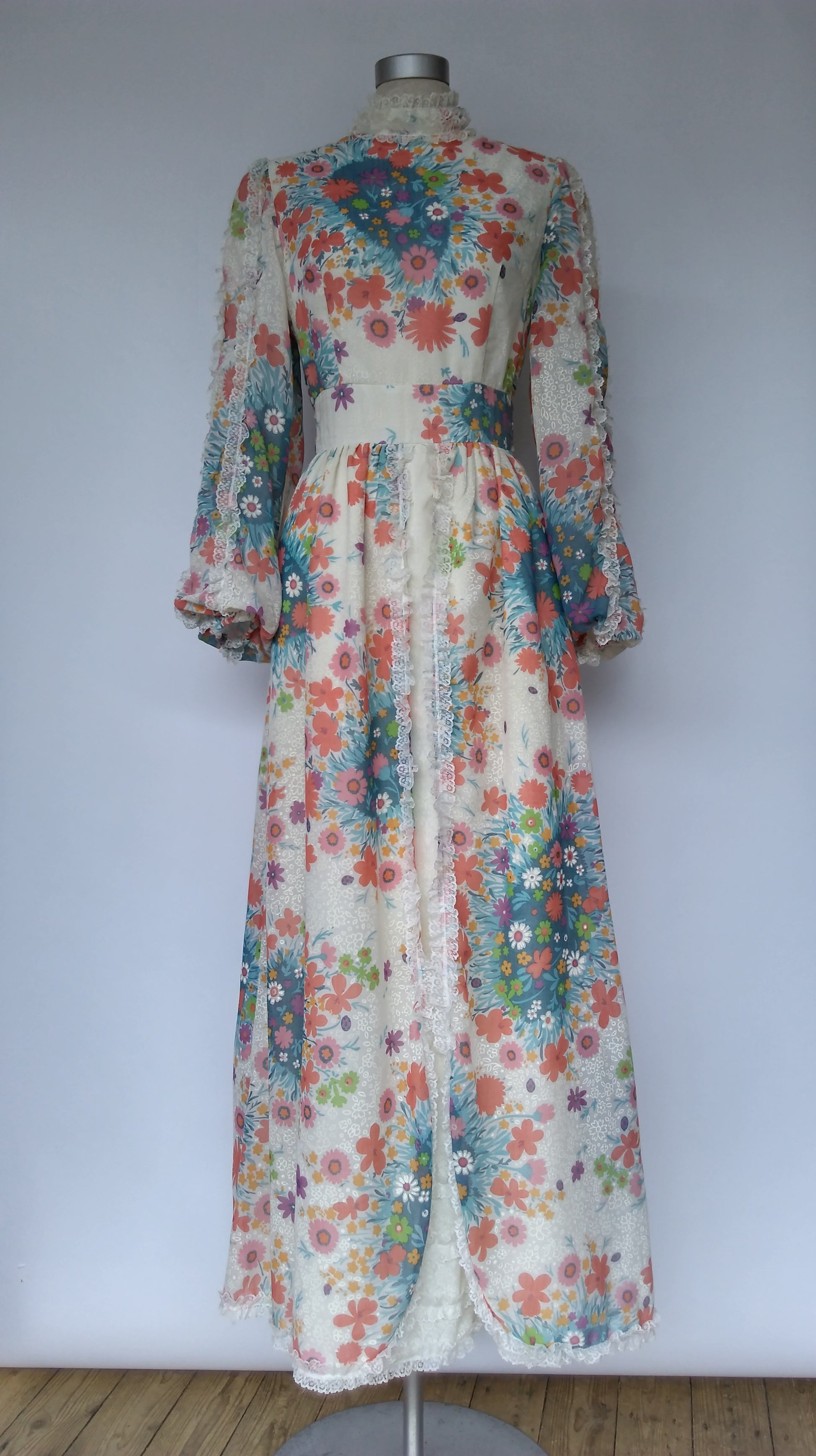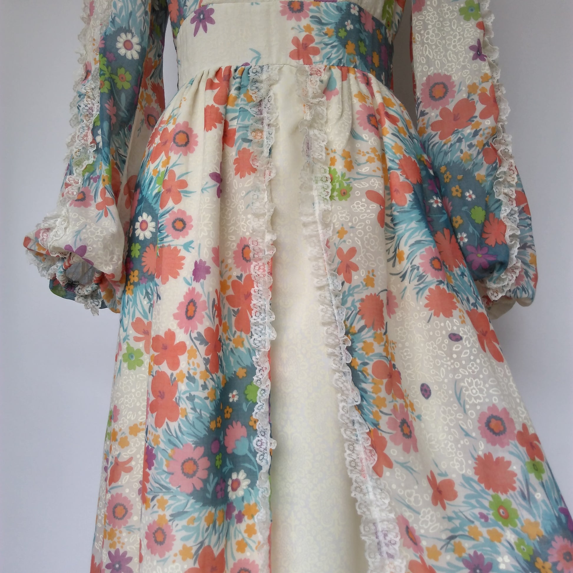 This is a 1960s/70s pretty floral maxi dress by Angela Gore, London label. In a 'Victorianna' style popular in the late 60s early 70s, which is also so wearable now, it would grace any Summer occasion. Perhaps even tripping to the shops with a straw basket?