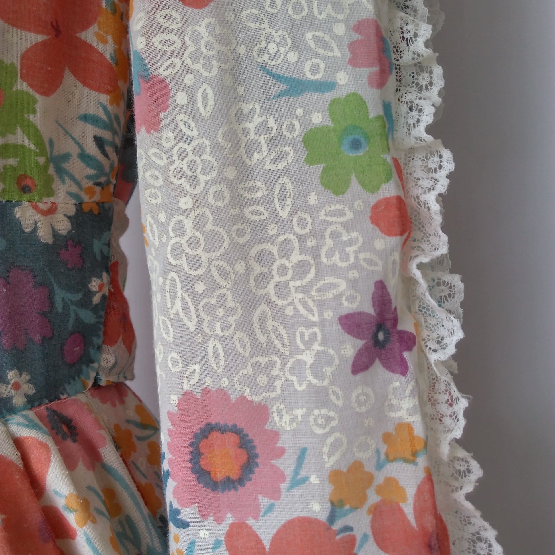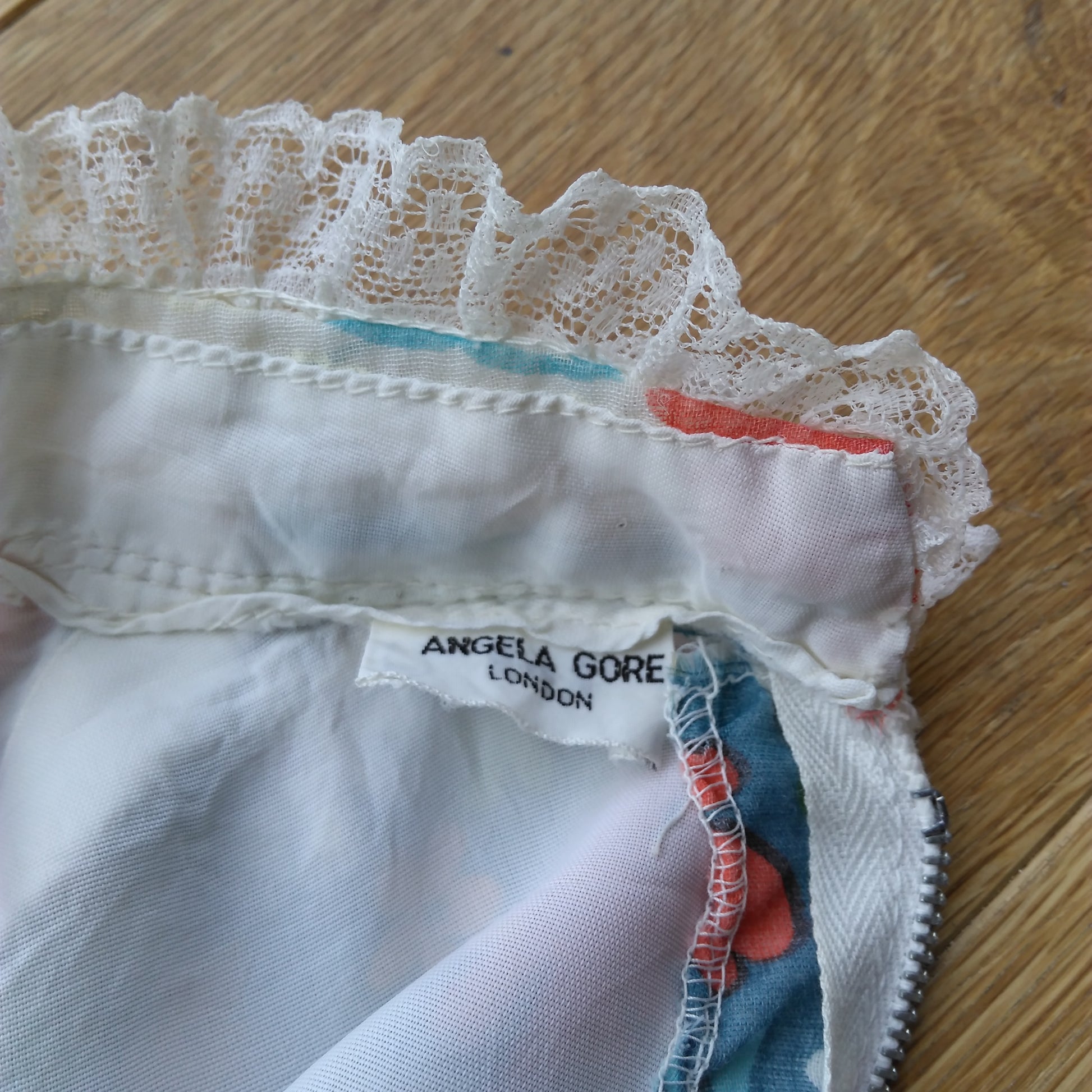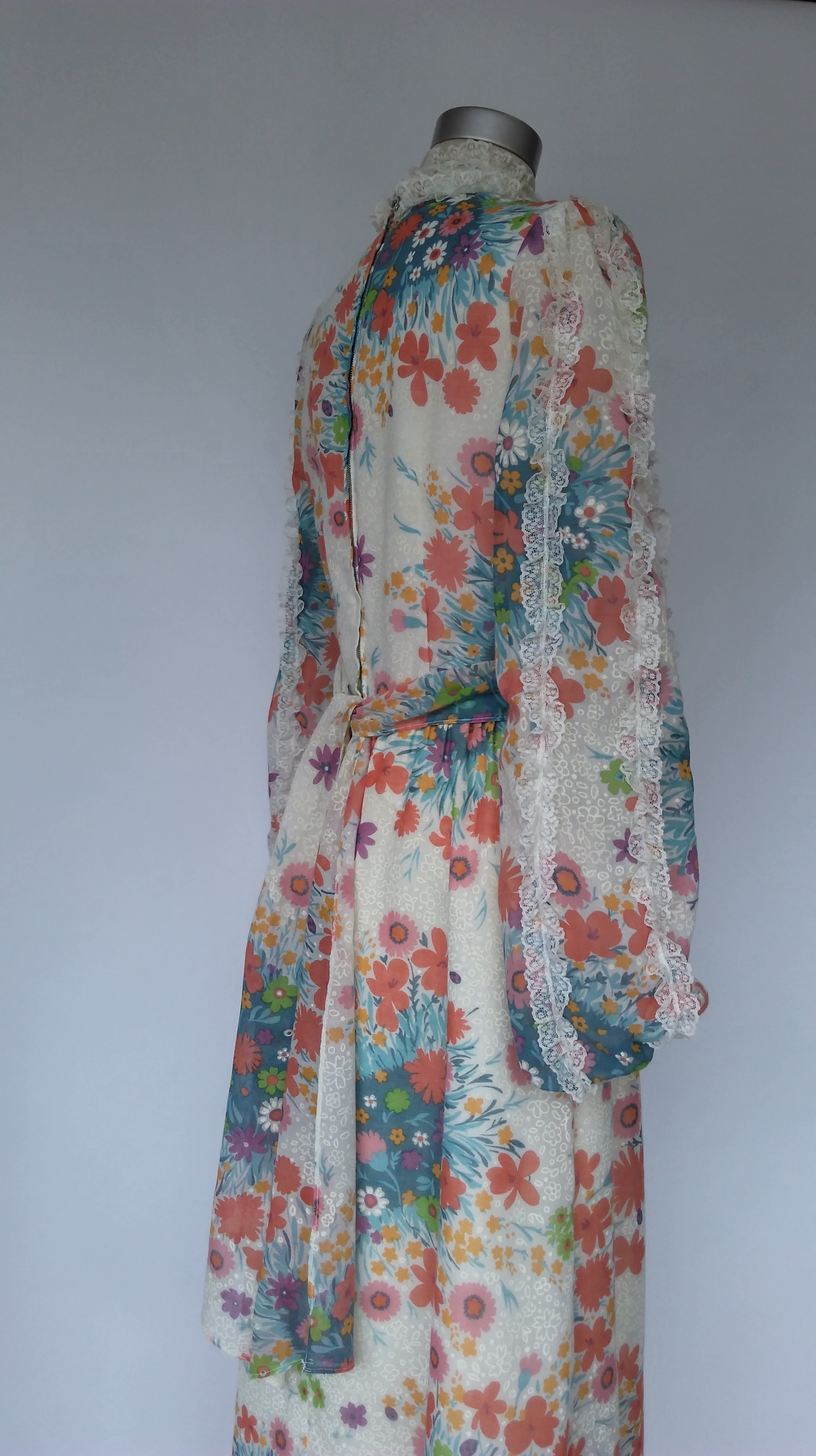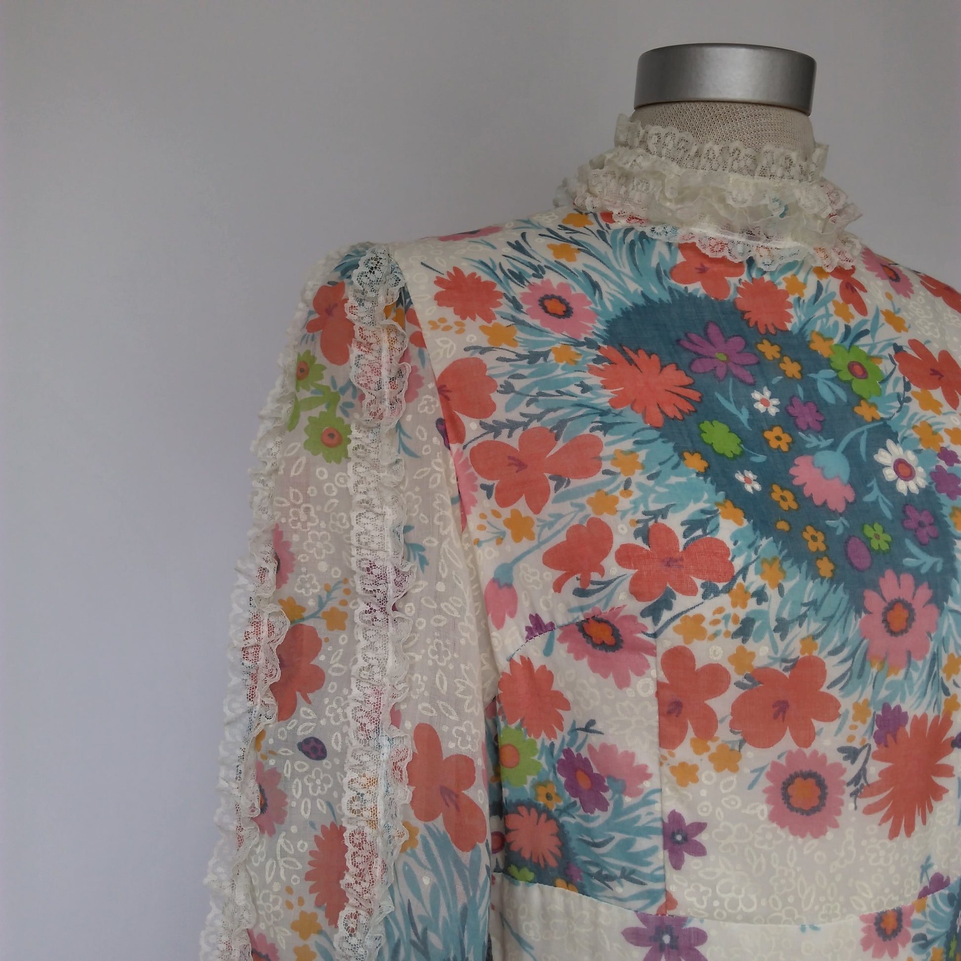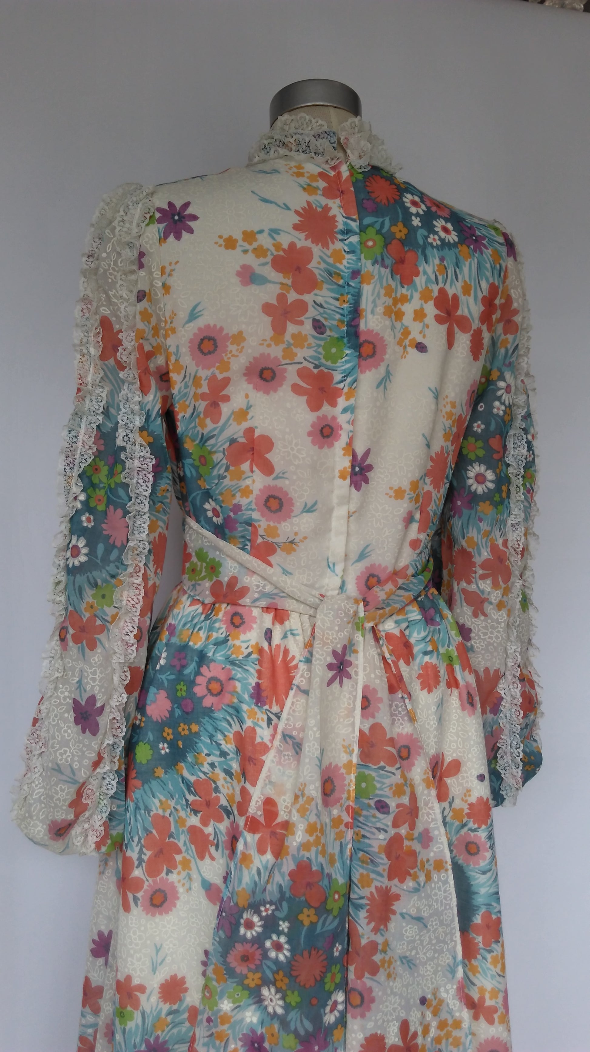 This is a 1960s/70s pretty floral maxi dress by Angela Gore, London label. In a 'Victorianna' style popular in the late 60s early 70s, which is also so wearable now, it would grace any Summer occasion. Perhaps even tripping to the shops with a straw basket?