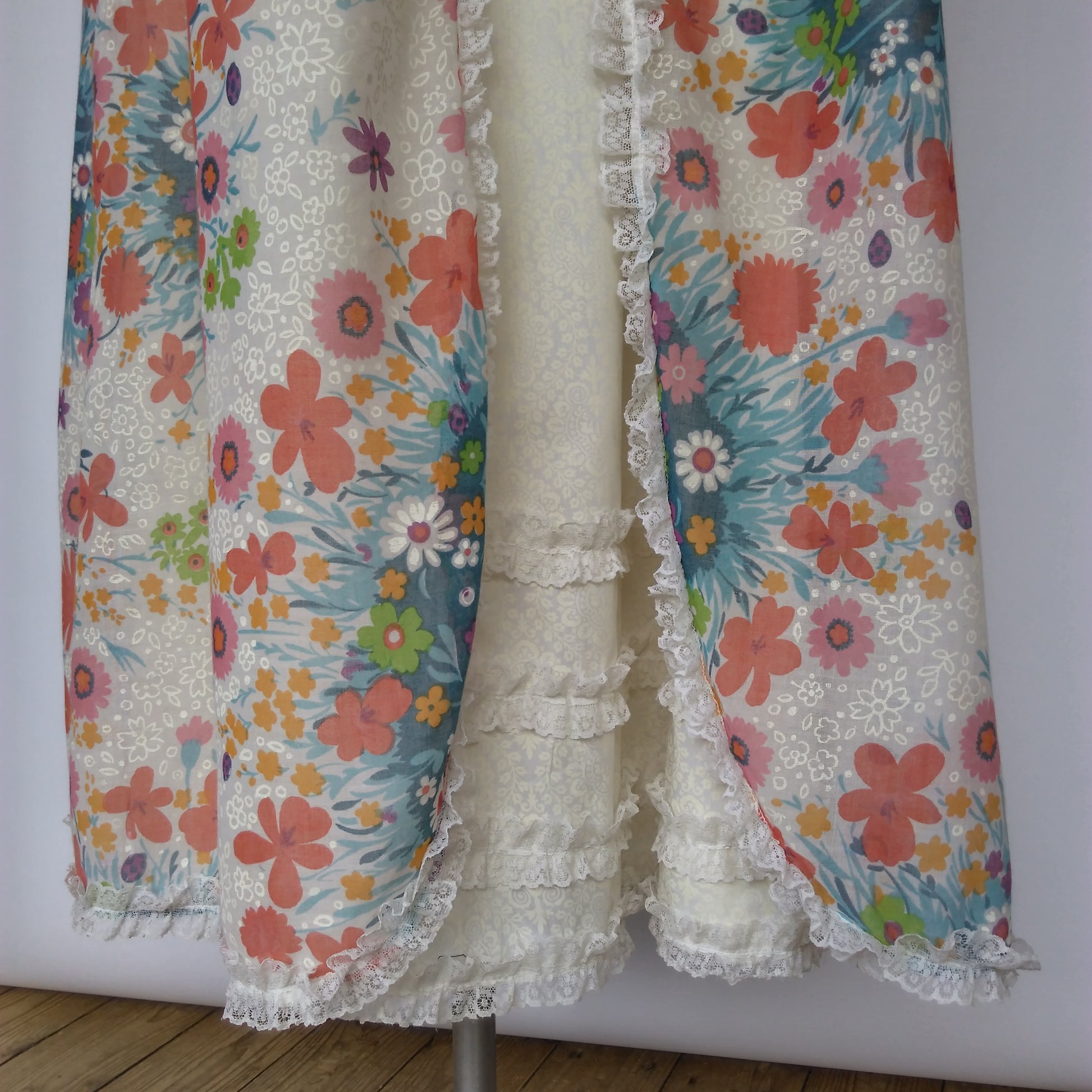 - the top overlaid skirt (in the floral fabric) falls away in a curve from the centre of the front waist with the edges also trimmed in lace