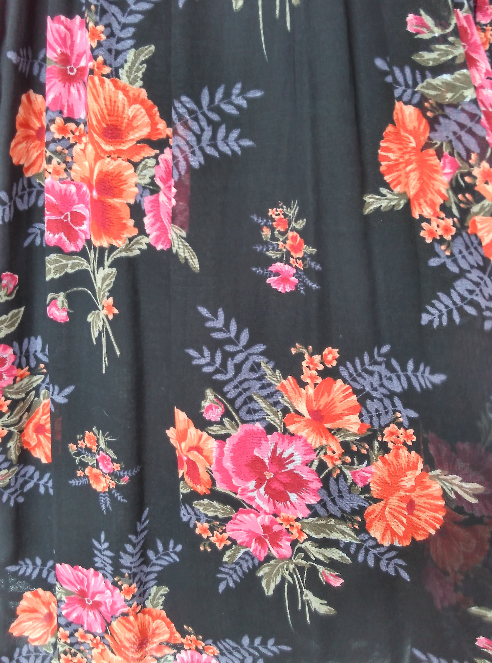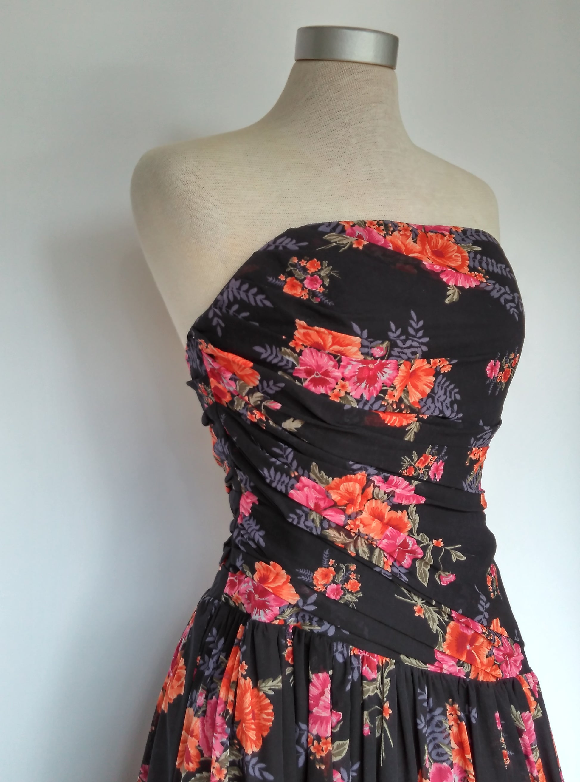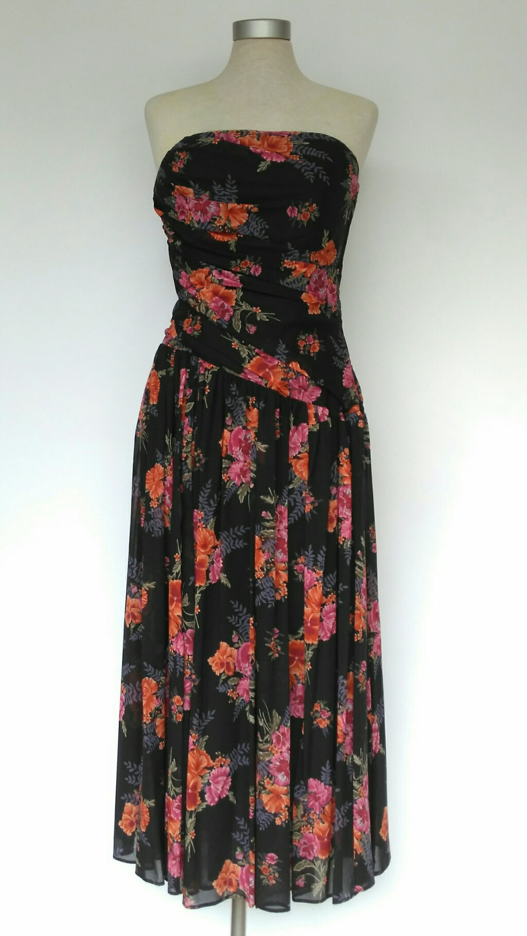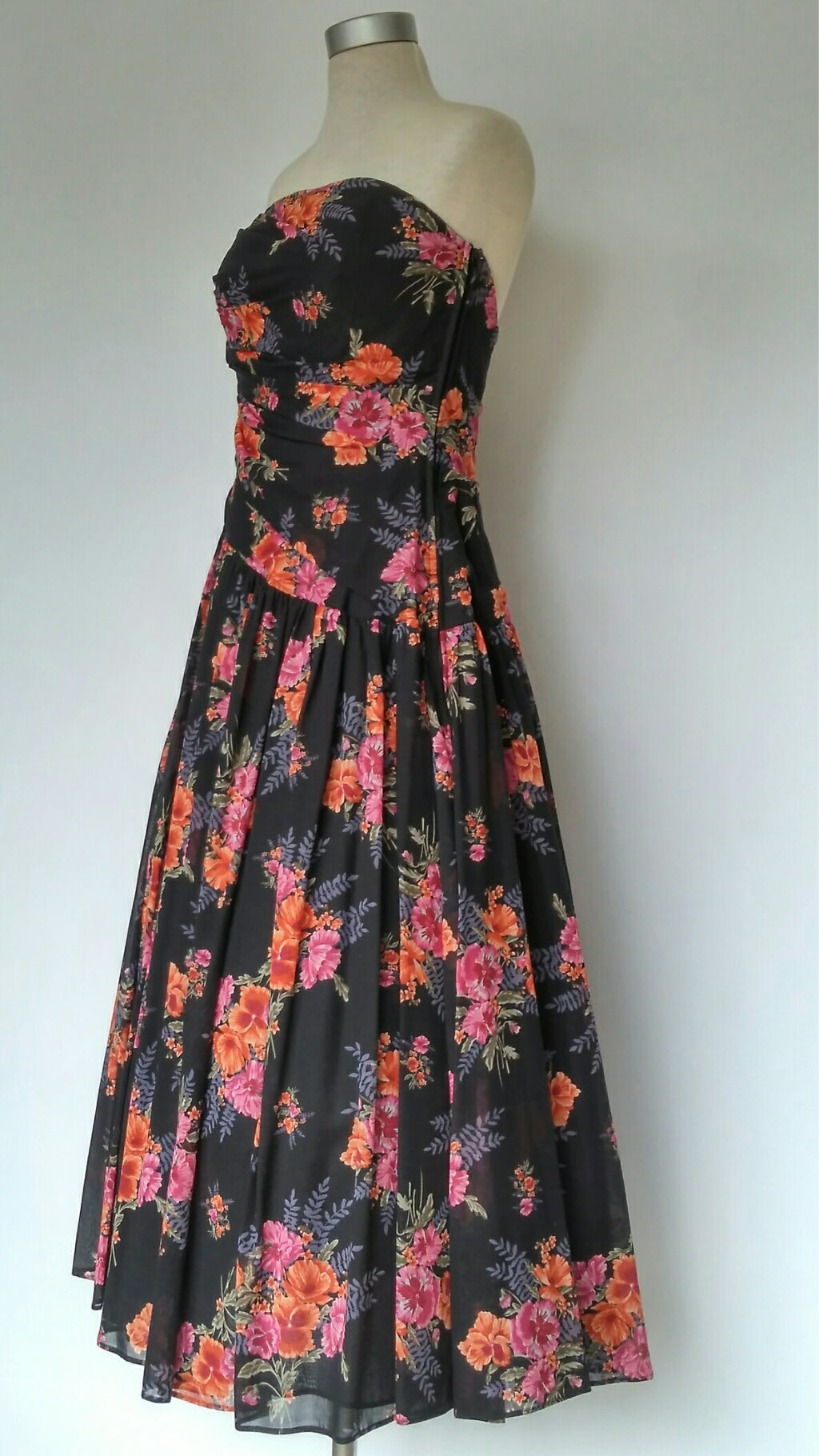 This is a fine cotton lawn ruched bodice strapless dress by none other than Laura Ashley. Unusually it is a bright floral print on a black background far removed from their normal pastel florals. A perfect occasion dress for A Summer event.Iit would take you effortlessly from day to evening.