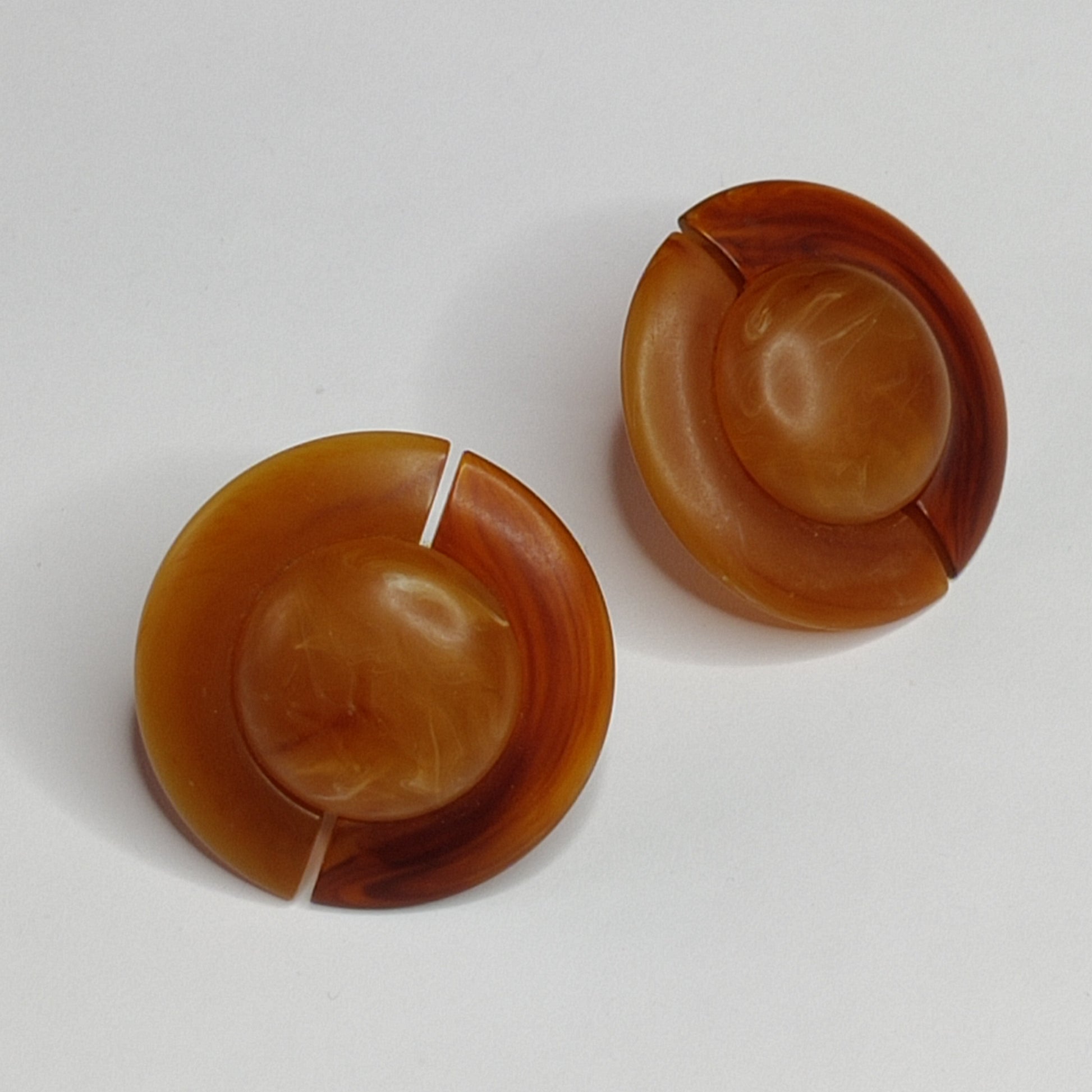 Styled in an acrylic/plastic in a faux tortoiseshell/amber effect they are large but lightweight. They feature a dome at the centre surrounded by a 'brim' which has narrow slits at the top and bottom.