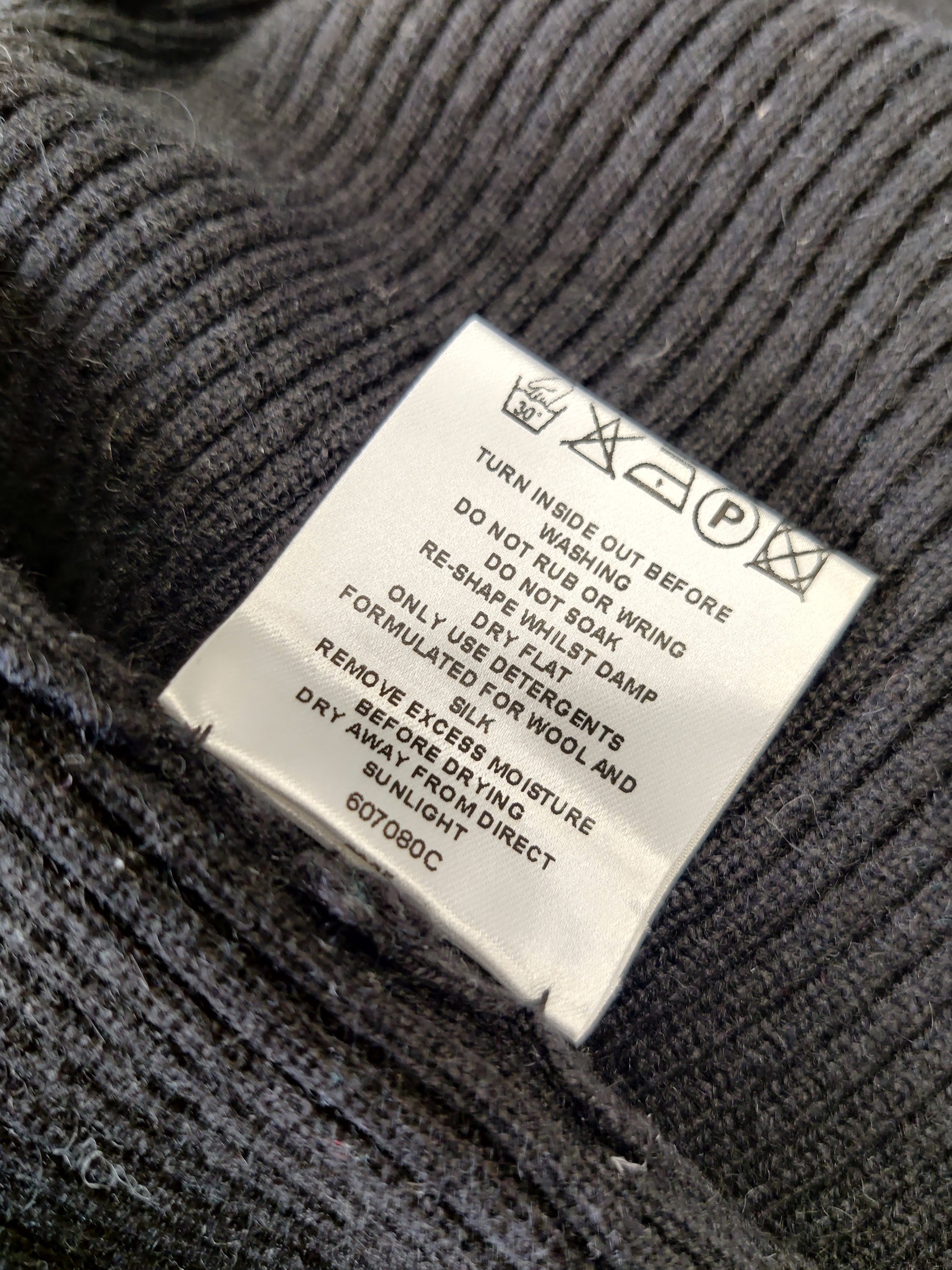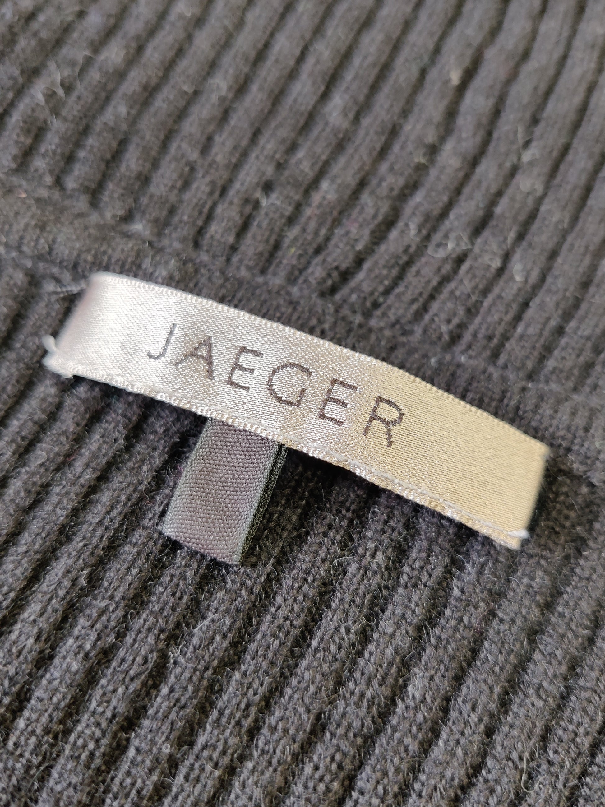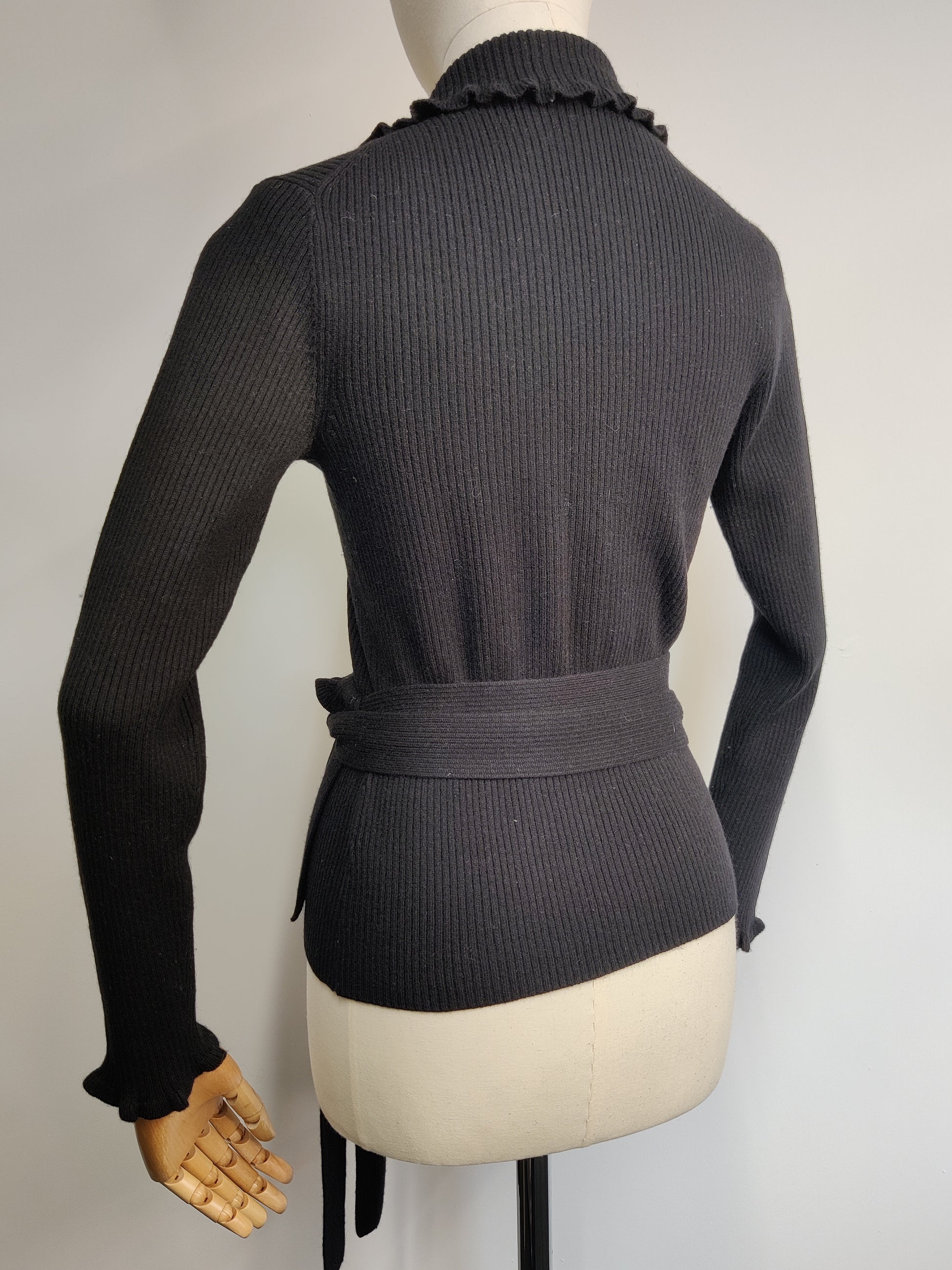 This is a post 2000 black ribbed wrap cardigan with ties. It is made of 55% silk/45% cashmere and features a shawl collar with a narrow frilled edge. It also features the frill at the cuff edges.