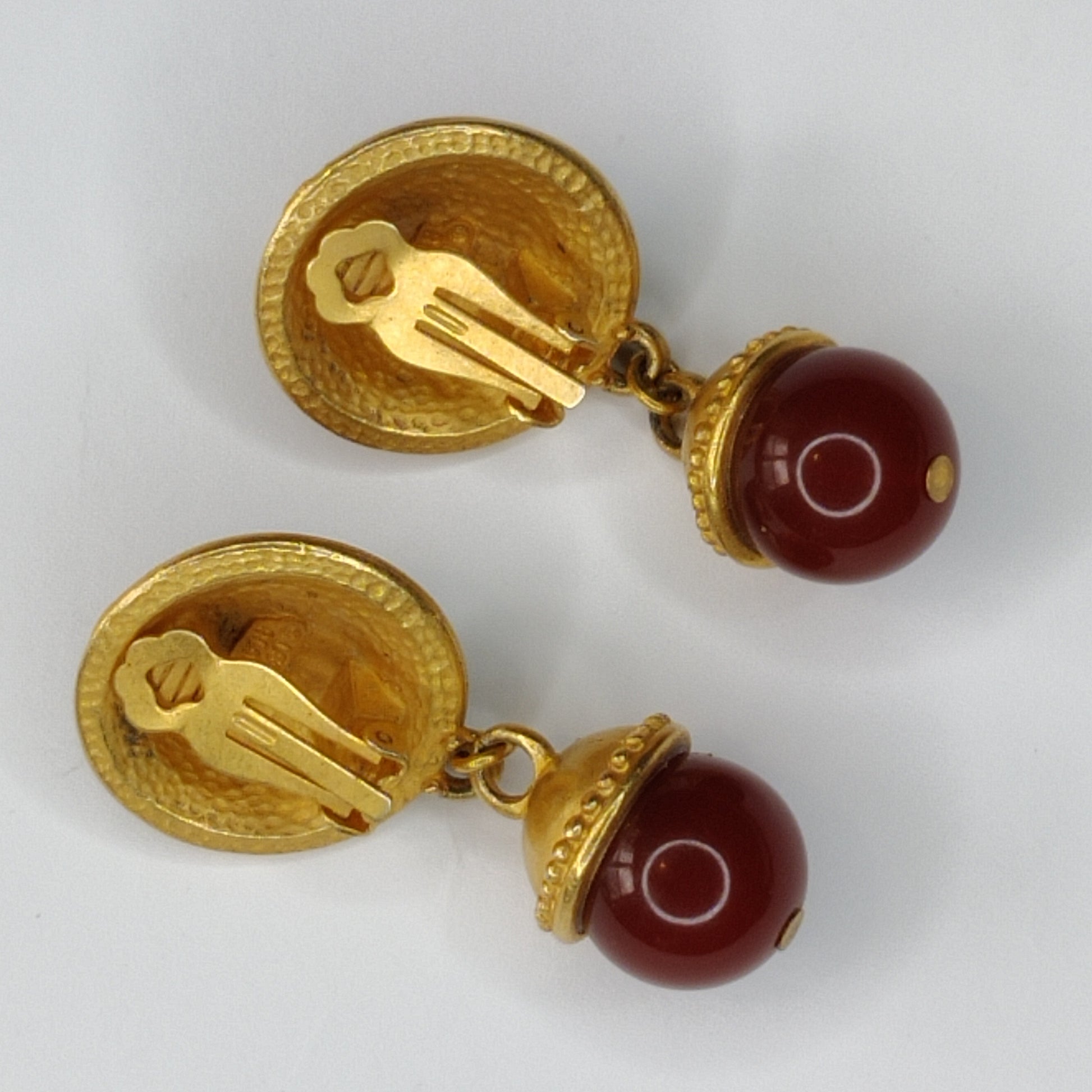 There is a brown glass ball suspended from the clip disc which has a gold tone cap with a beaded edge.