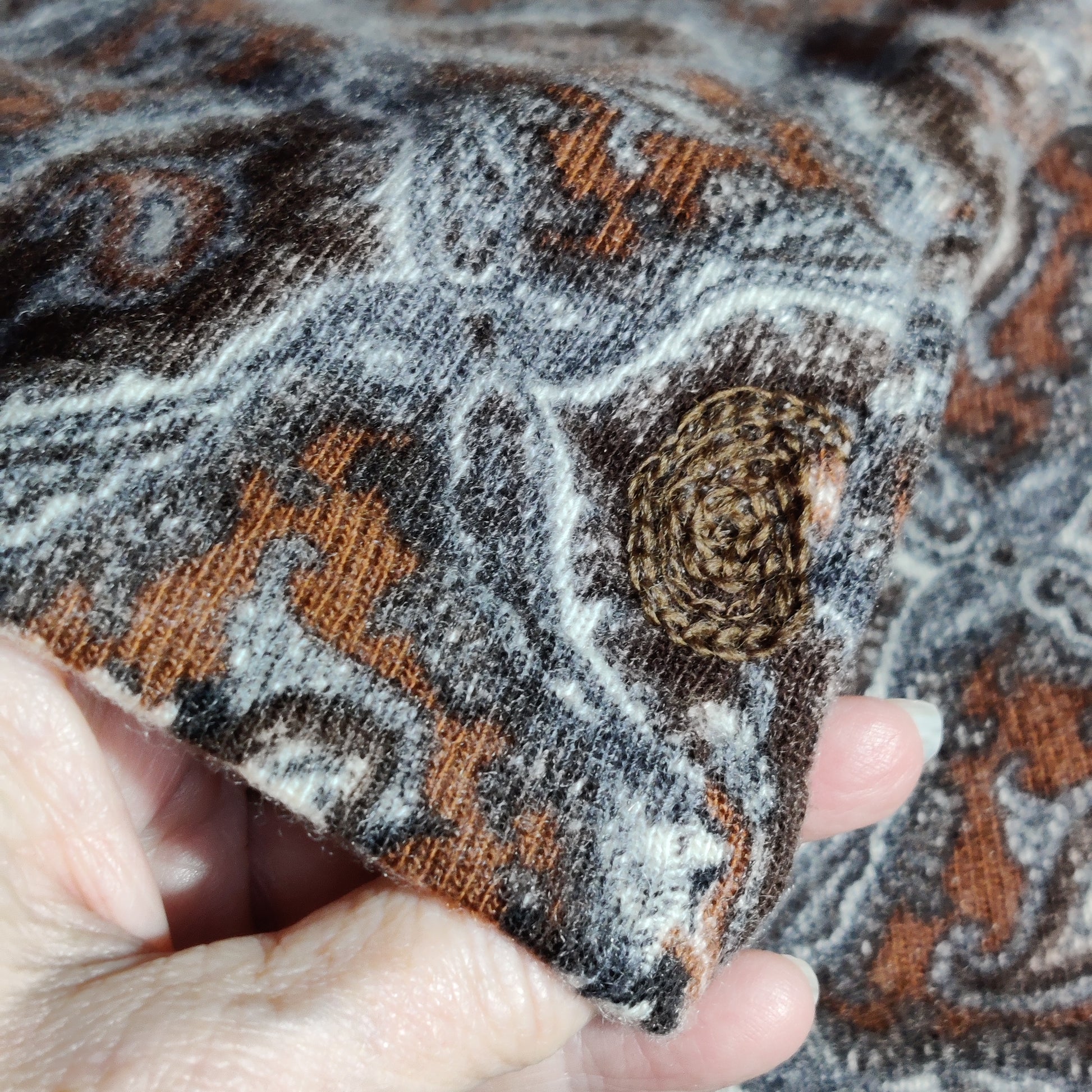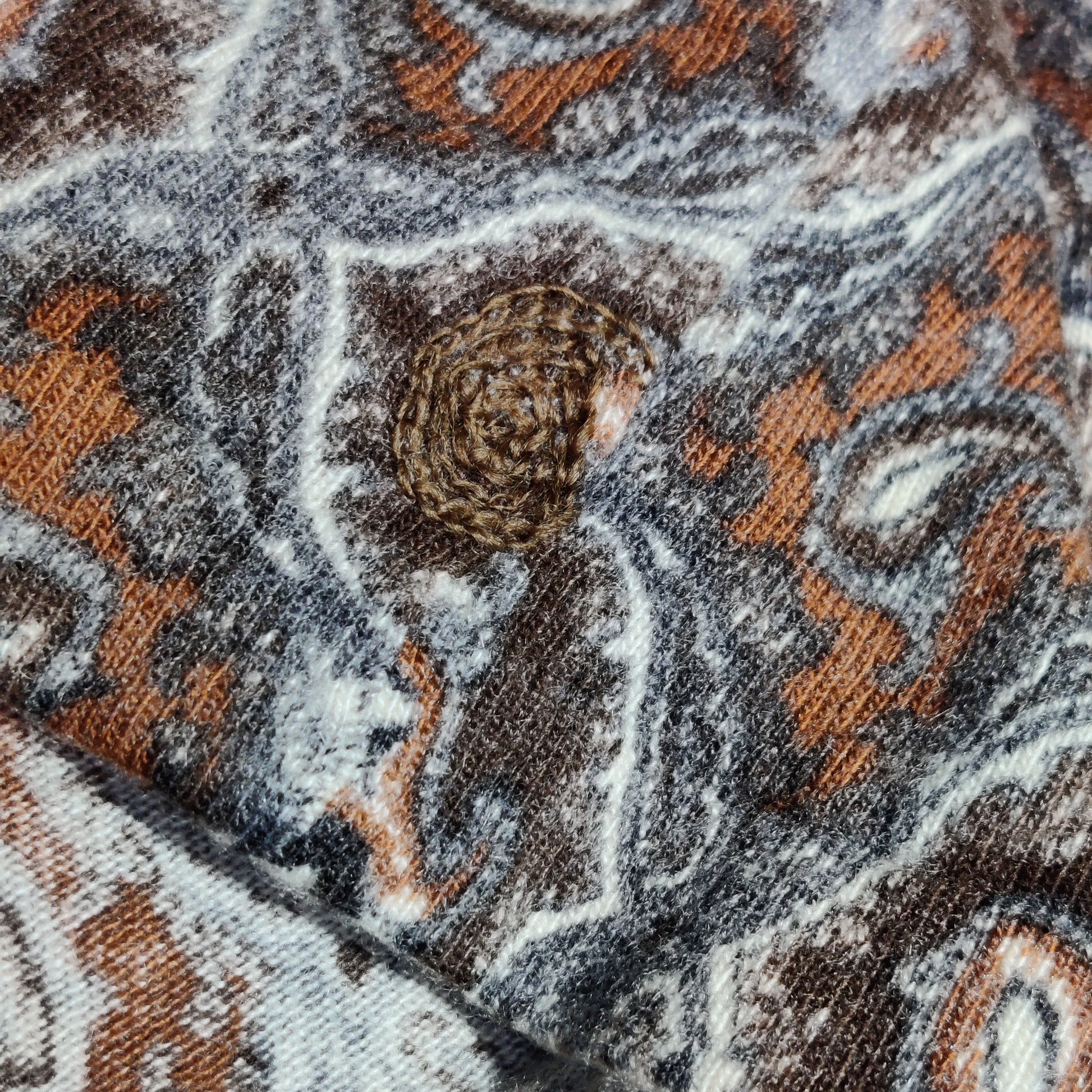 In muted browns, grey and ivory, the pattern includes a paisley motif, popular at the time.