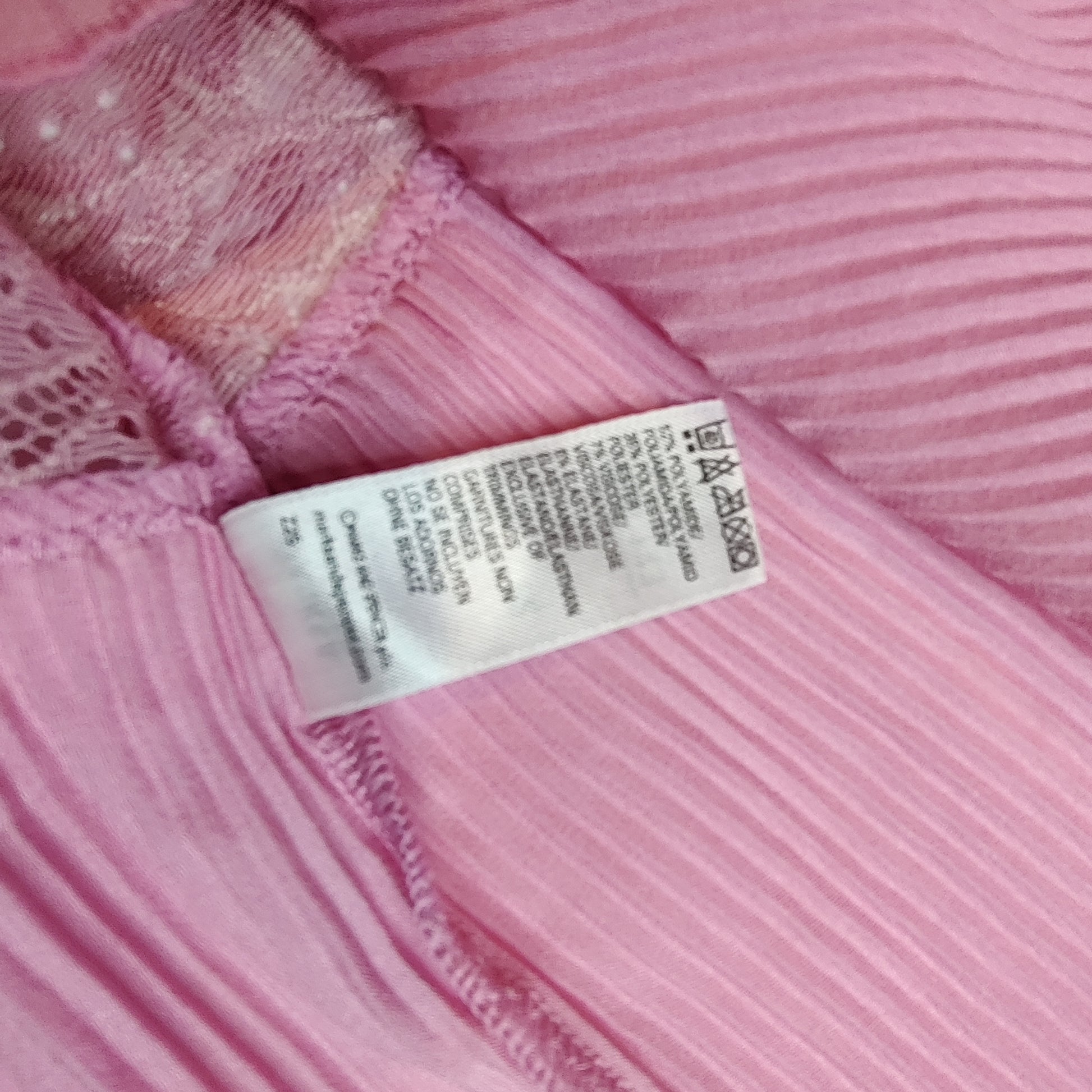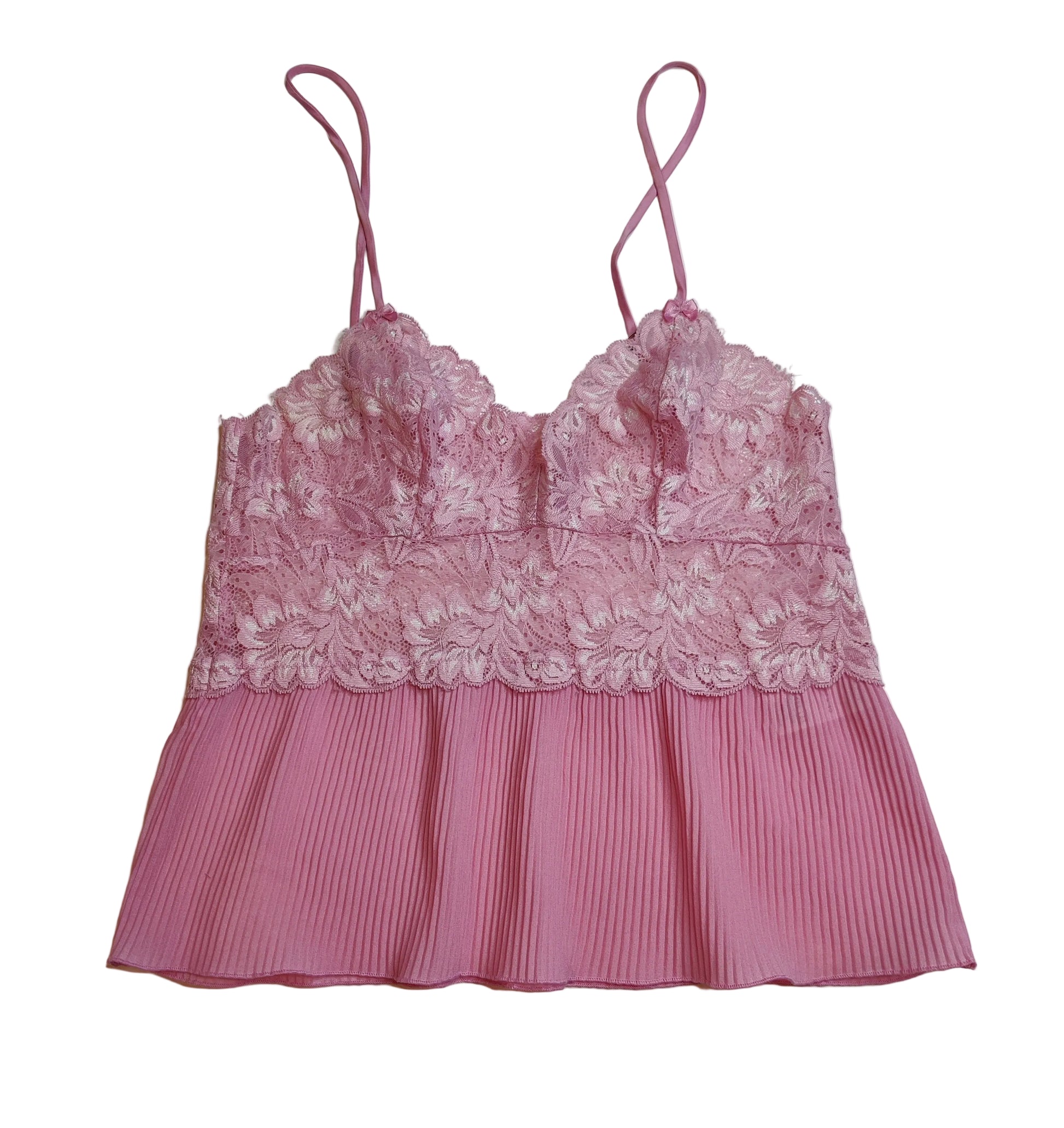 The camisole is a lace upper part with a deep pleated border. It has adjustable ribbon straps with tiny pink ribbon bows at the front bust.