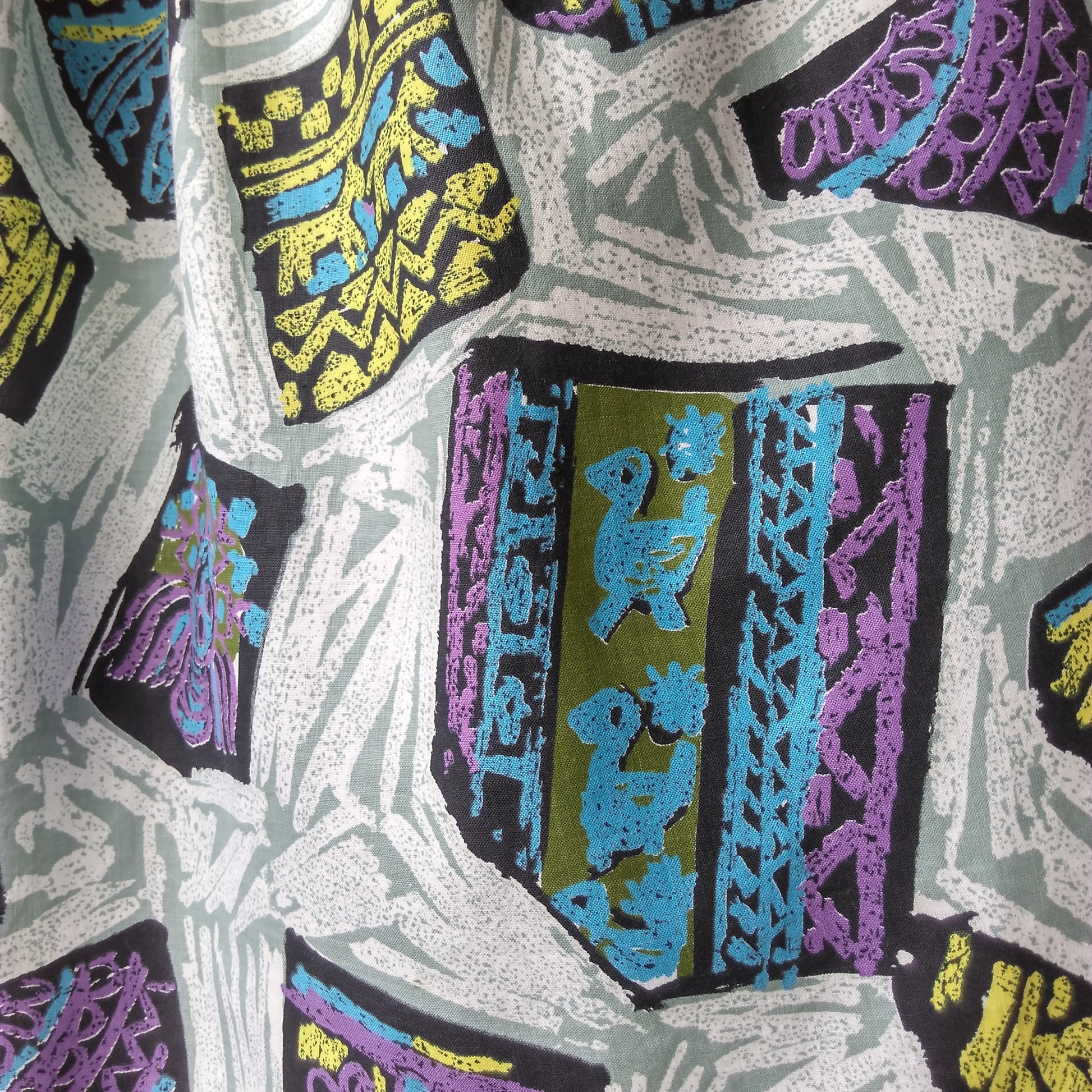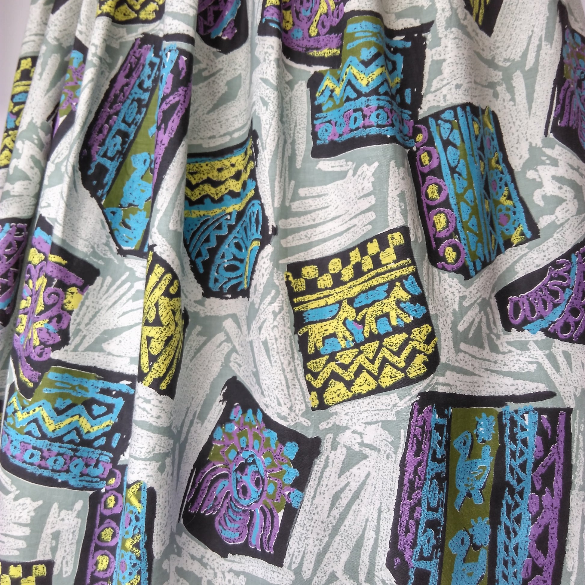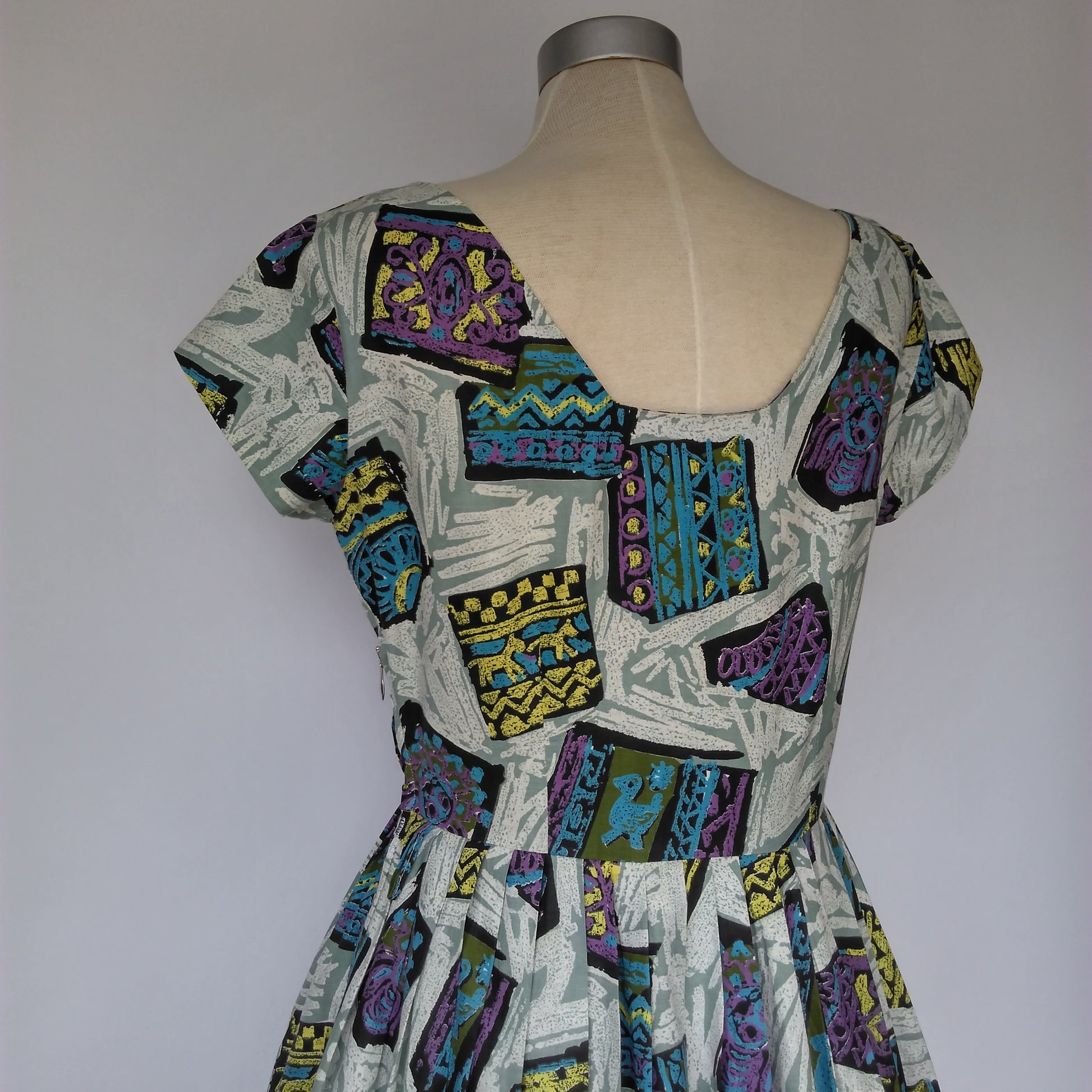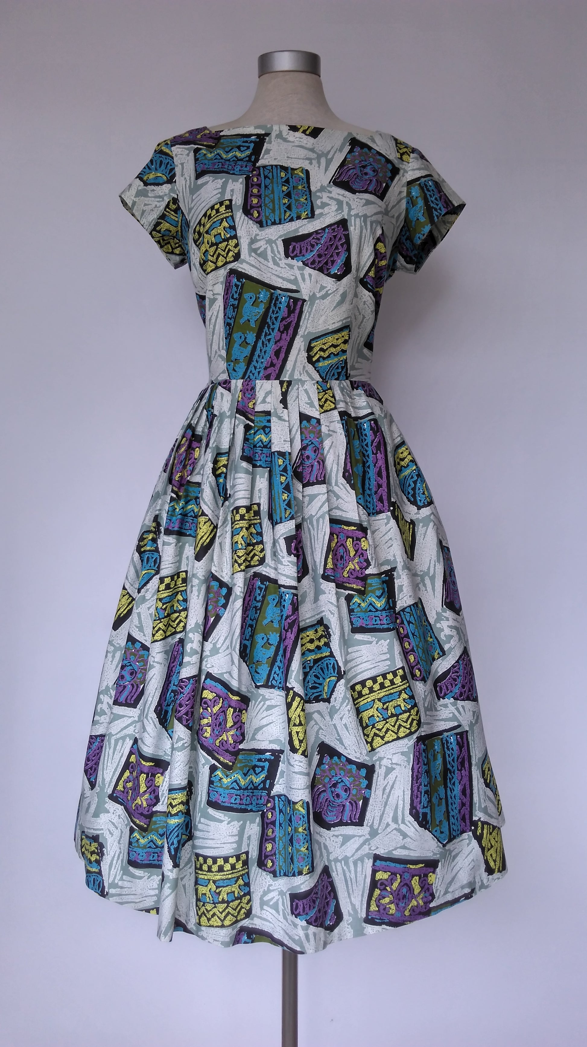 This is a lovely 1950s dress in a quirky print featuring Aztec or Mayan symbols in bright colours on a white background. Definitely a conversation starter.