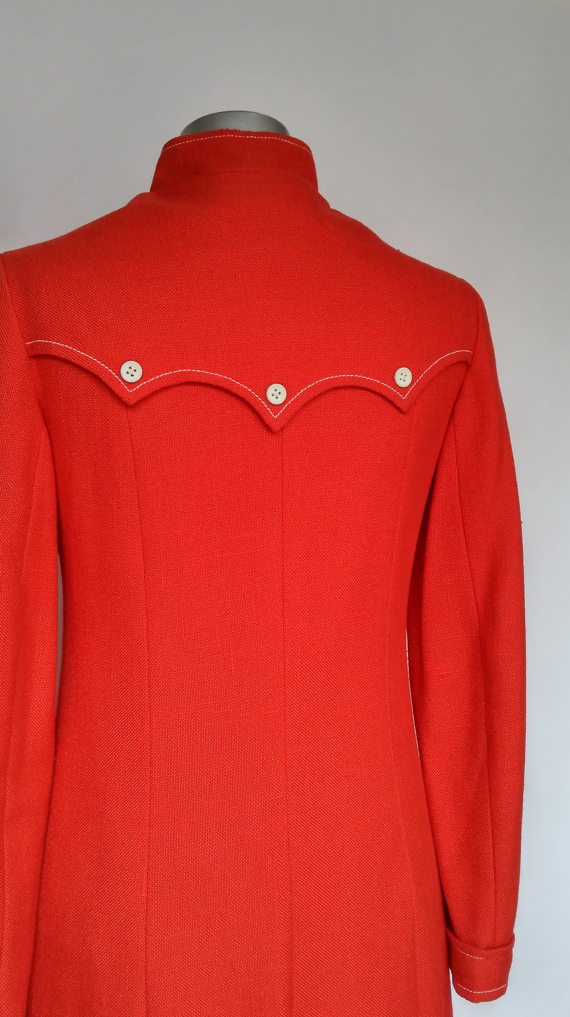 Dating to the late sixties (possibly early seventies) and designed by Gerald McCann it is fully lined with top stitch detailing to the collar, faux pocket flaps, sleeve cuffs and back shaped shoulder 'guard flap'. Fastening at the front on alternate buttons (to ceate an illusion of all buttons being fastened) it saves buttoning every button.....and that can only be good as there's a lot! (see photo of coat unfastened). The collar is a stand up mandarin collar.