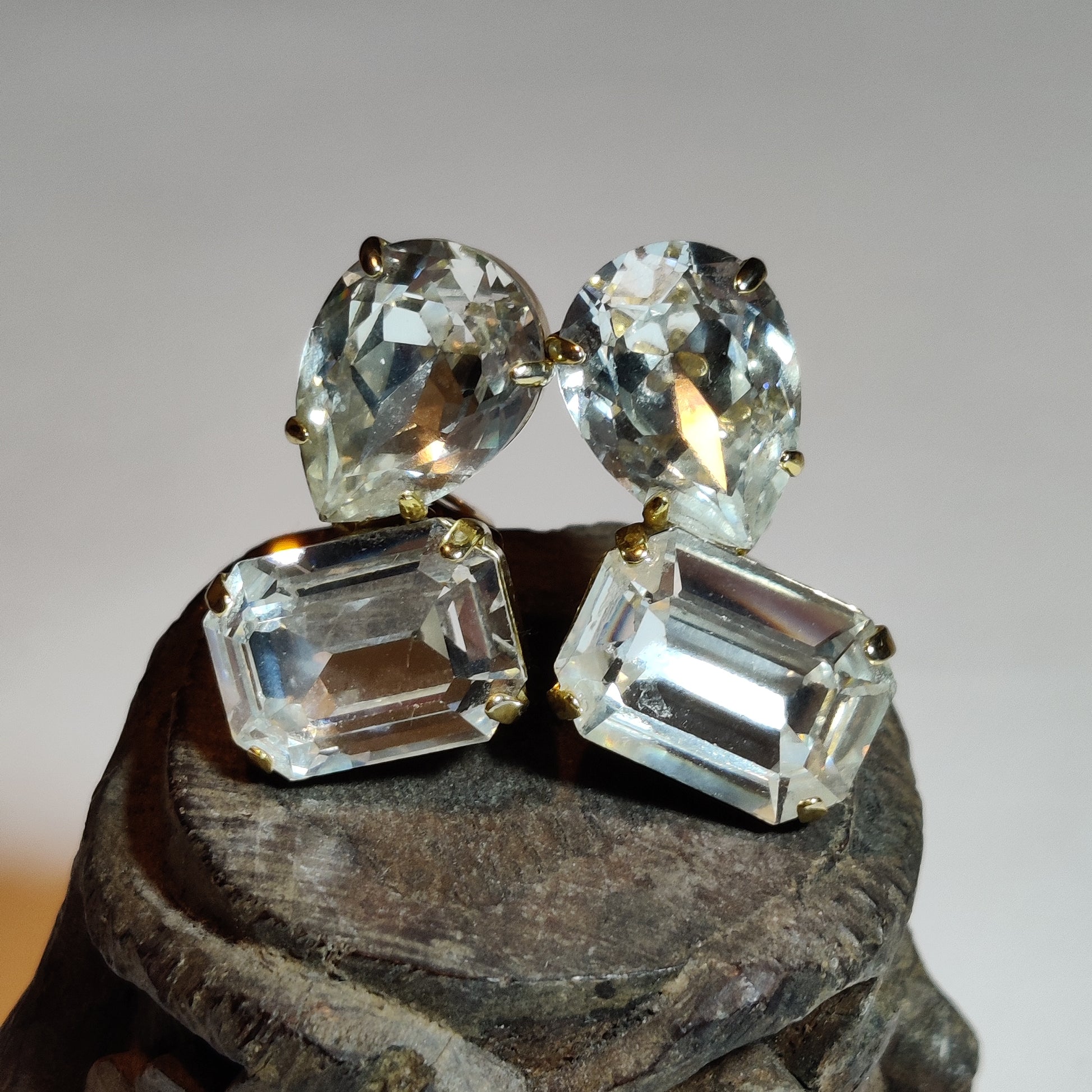 Each earring comprises two large glass rhinestones which are each claw set. One is a large emerald cut rhinestone and the other a cut glass pear shaped rhinestone. Set in gold tone metal the lower rectangular stones are offset to stunning effect against the upper pear shaped stones.