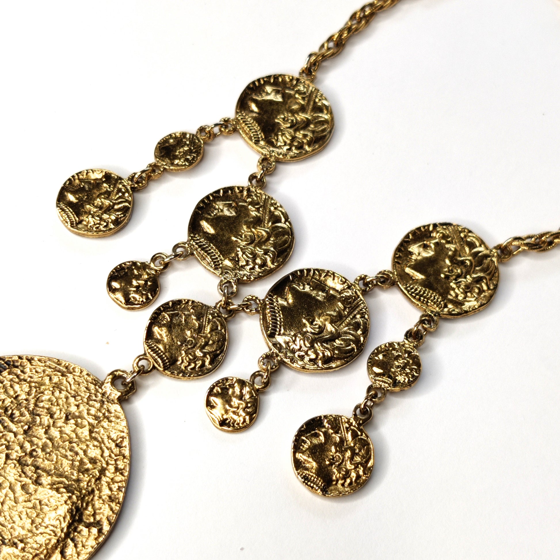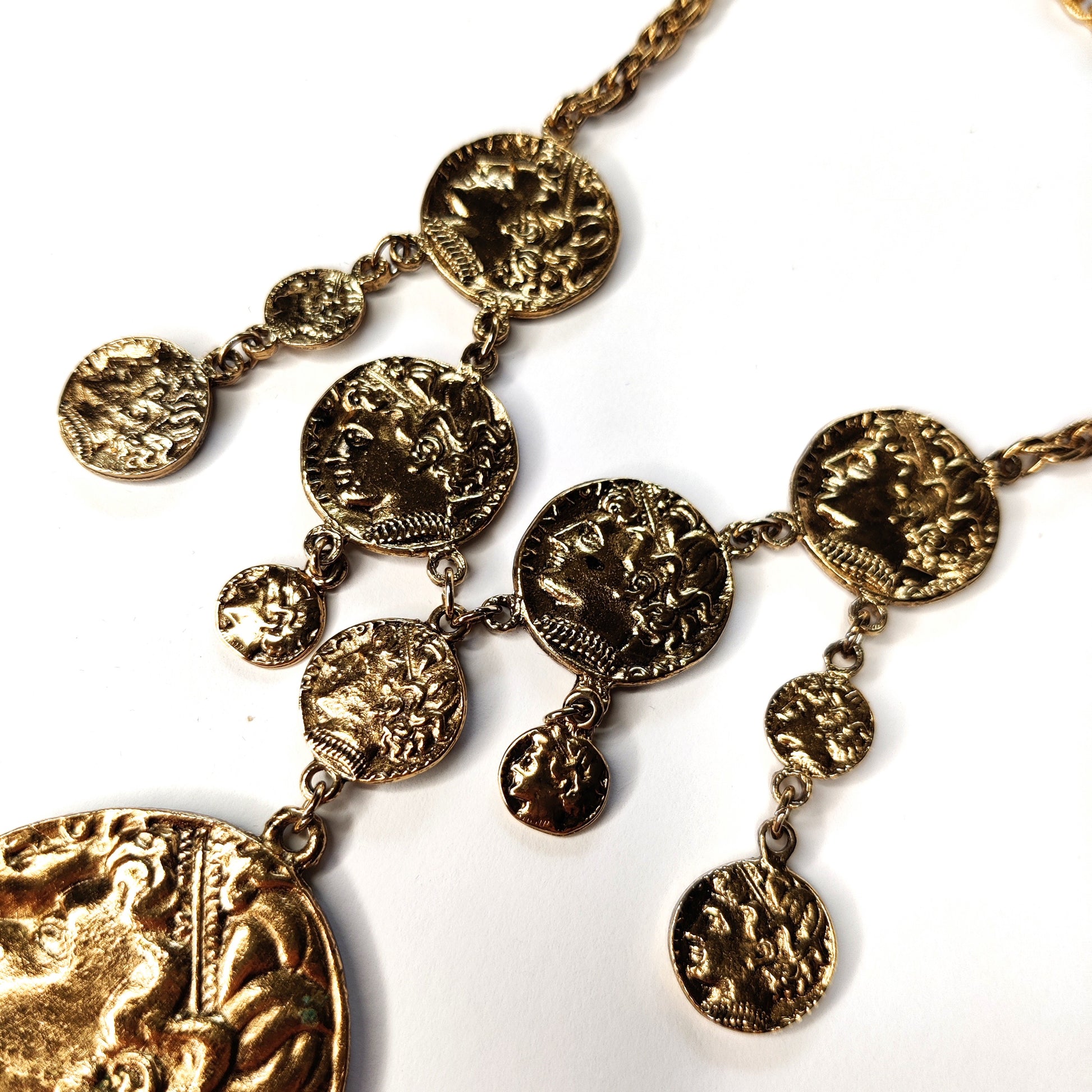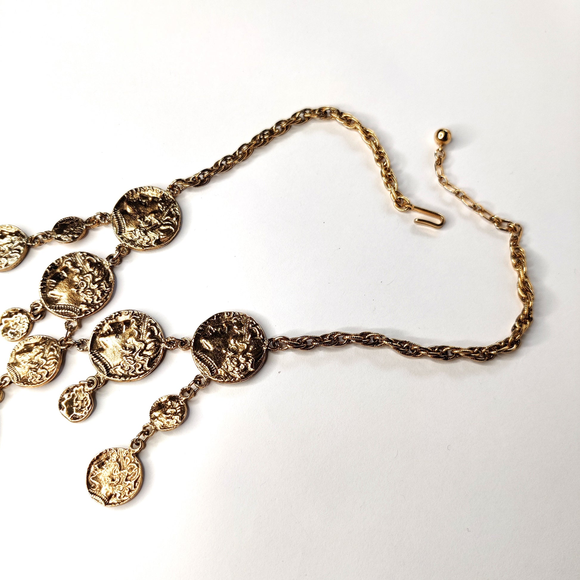This Vintage Crown Trifari ancient Greco-Roman style coin necklace is from the 1970s and is one of the more rare designs from that era. The necklace is in a gold-tone finish with the coins designed to look ancient and distressed with age. It is in excellent condition