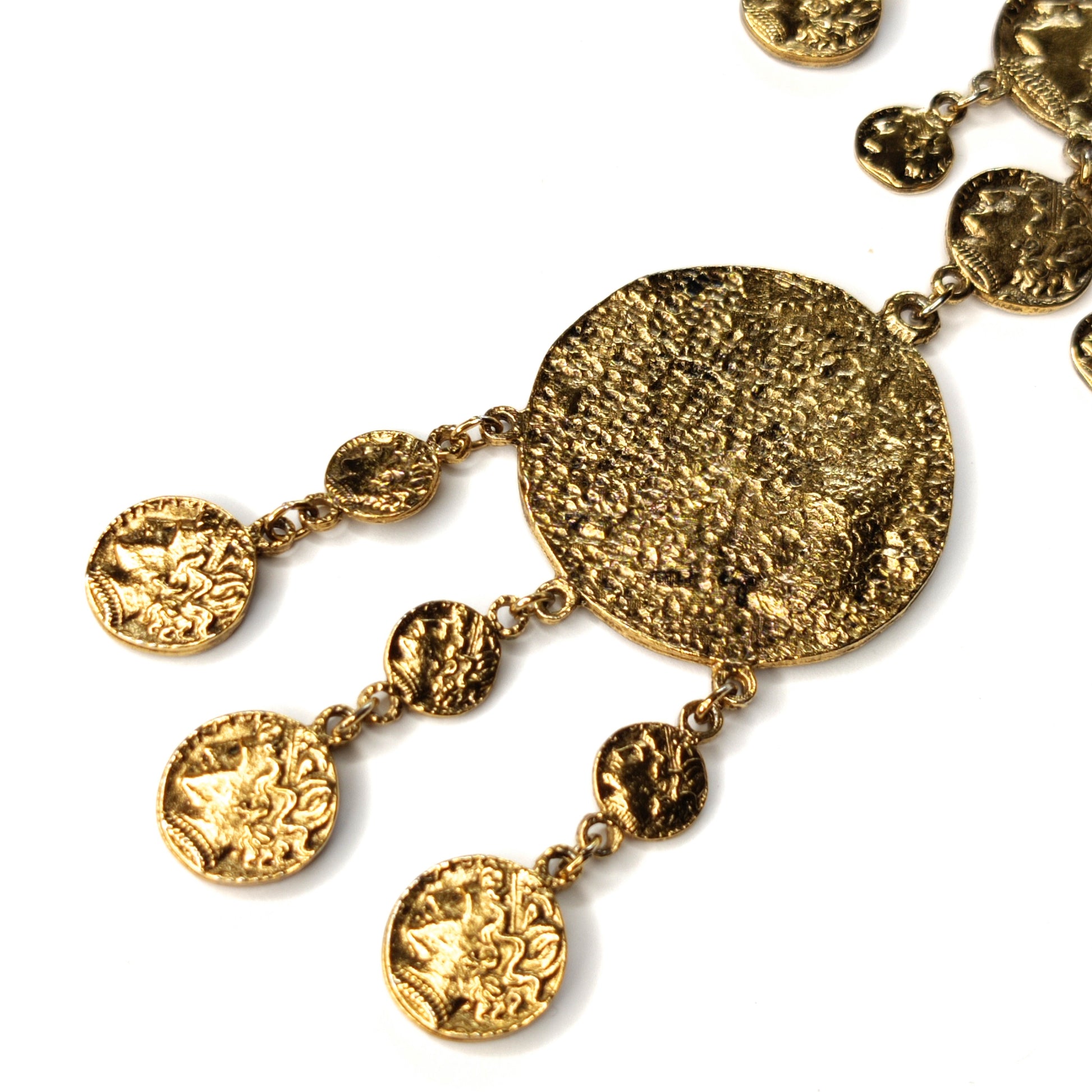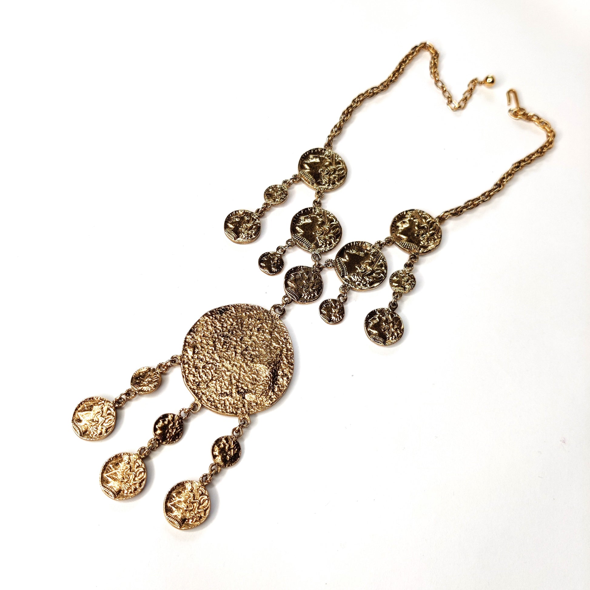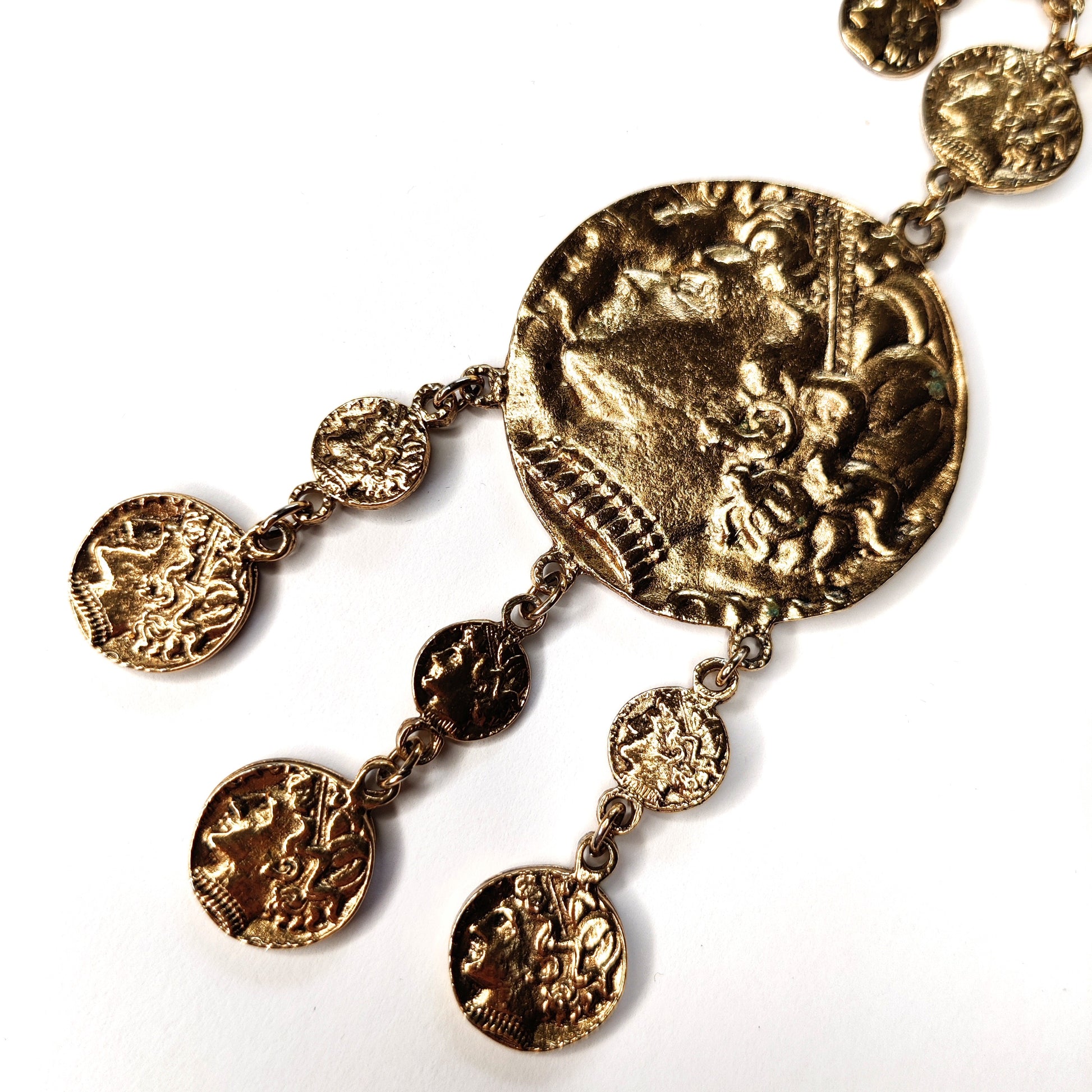 This Vintage Crown Trifari ancient Greco-Roman style coin necklace is from the 1970s and is one of the more rare designs from that era. The necklace is in a gold-tone finish with the coins designed to look ancient and distressed with age. It is in excellent condition