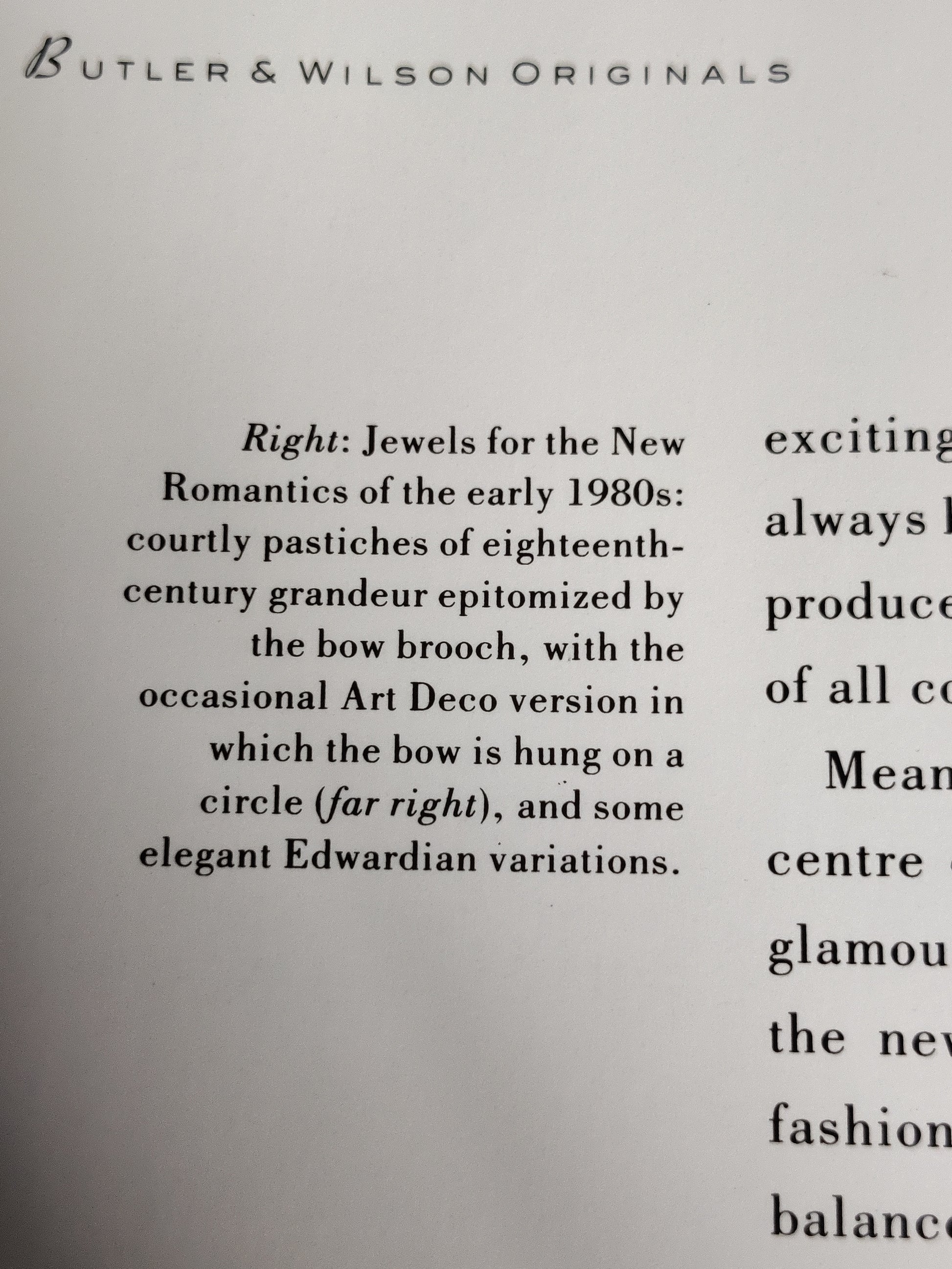 Quote ' Butler and Wilson supplied the New Romantics with pastiches of eighteenth century grandeur, huge diamante ribbon bows, fringed necklaces, long drop 'girandole' or chandelier earrings of superb style and proportion......' (see image of relevant page)