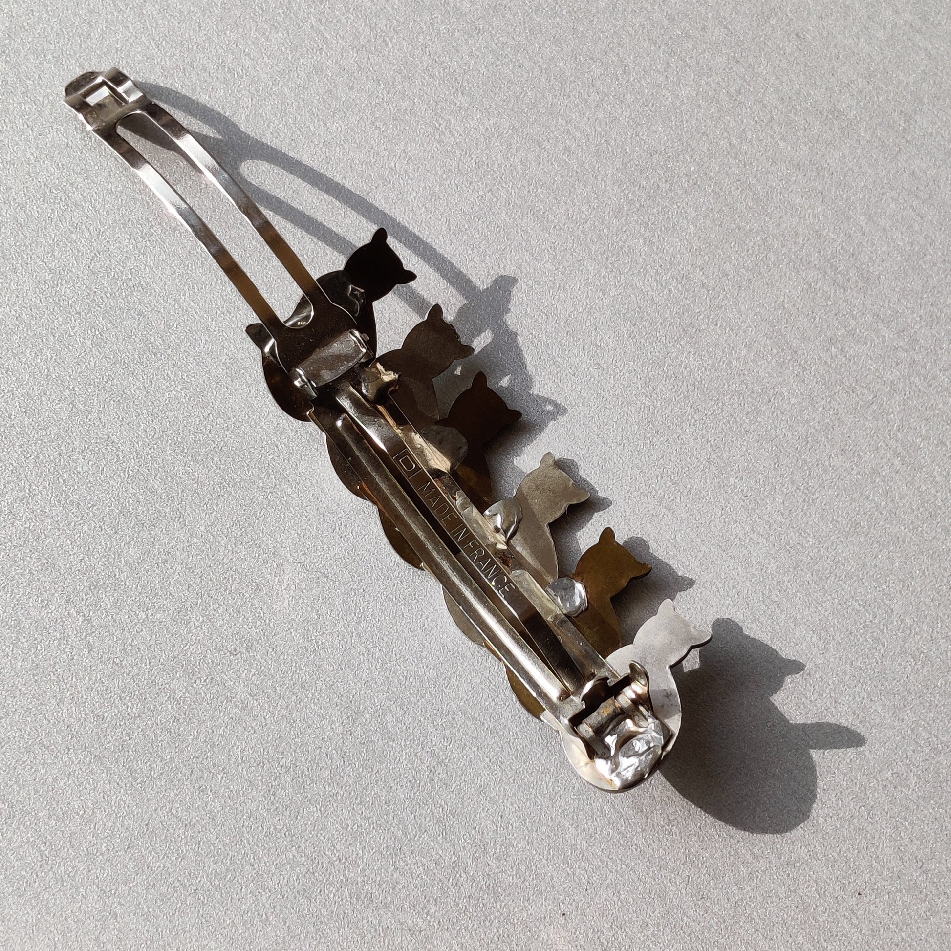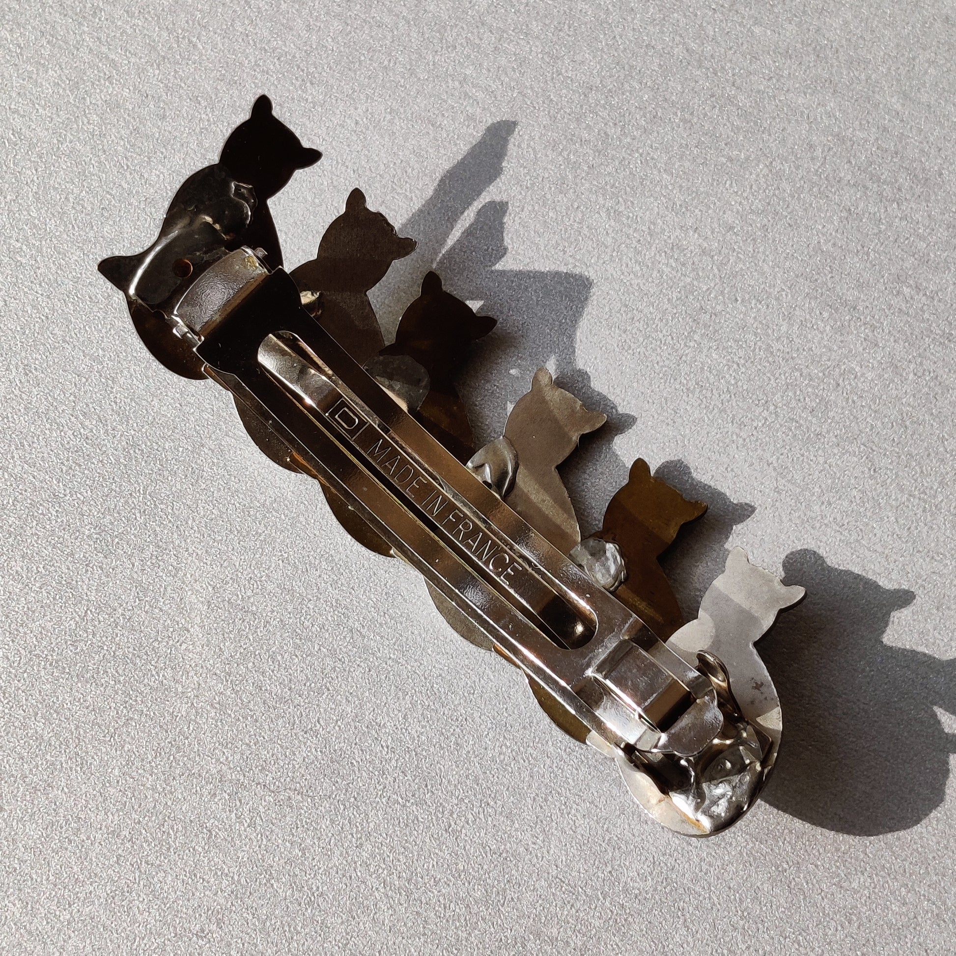 Made in France (stamped on the back) dating from the 1980s/90s. It features a row of six cats in matt tones of gold and silver.