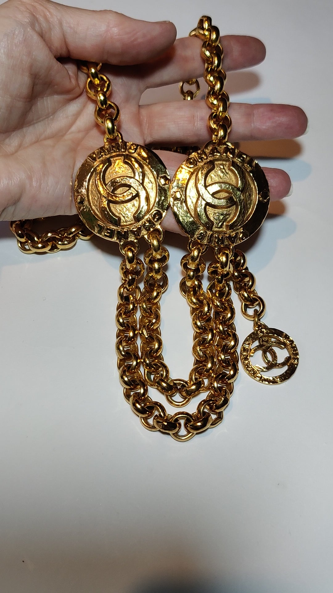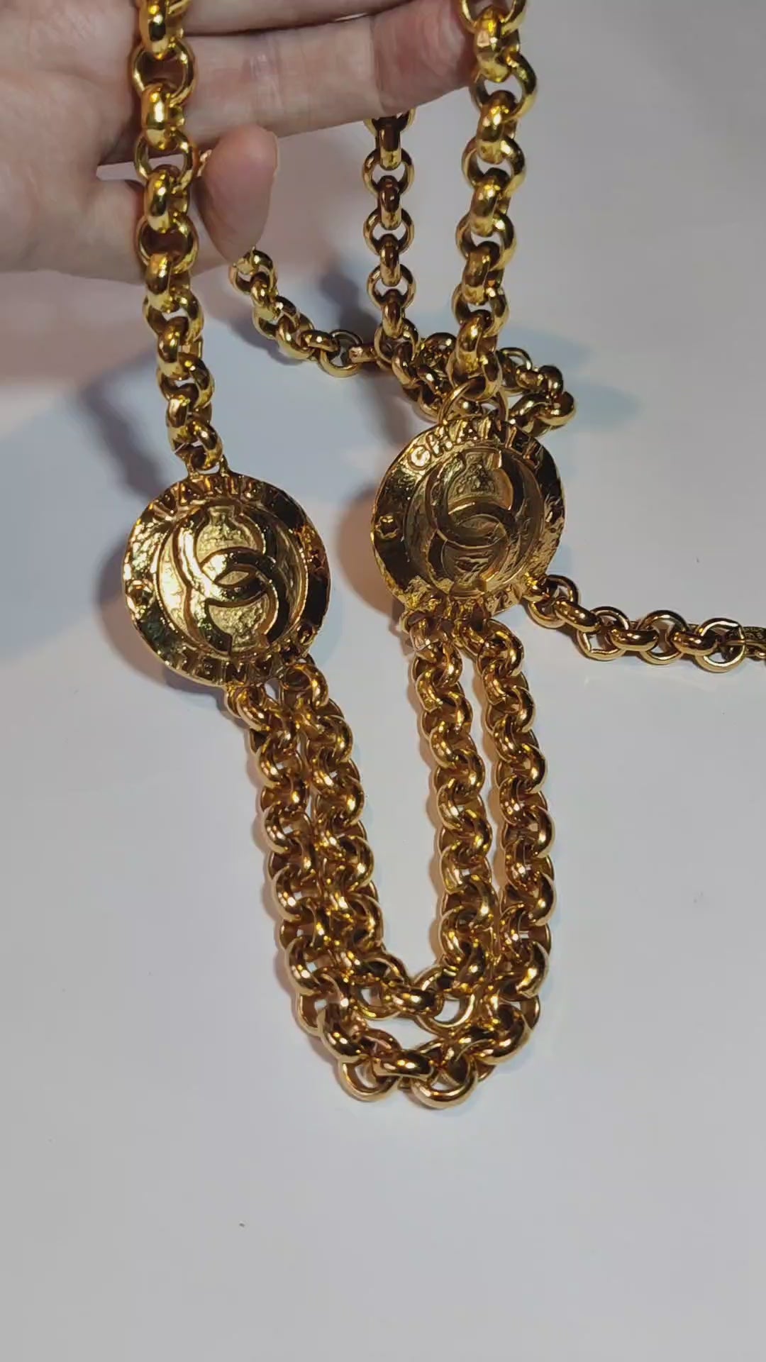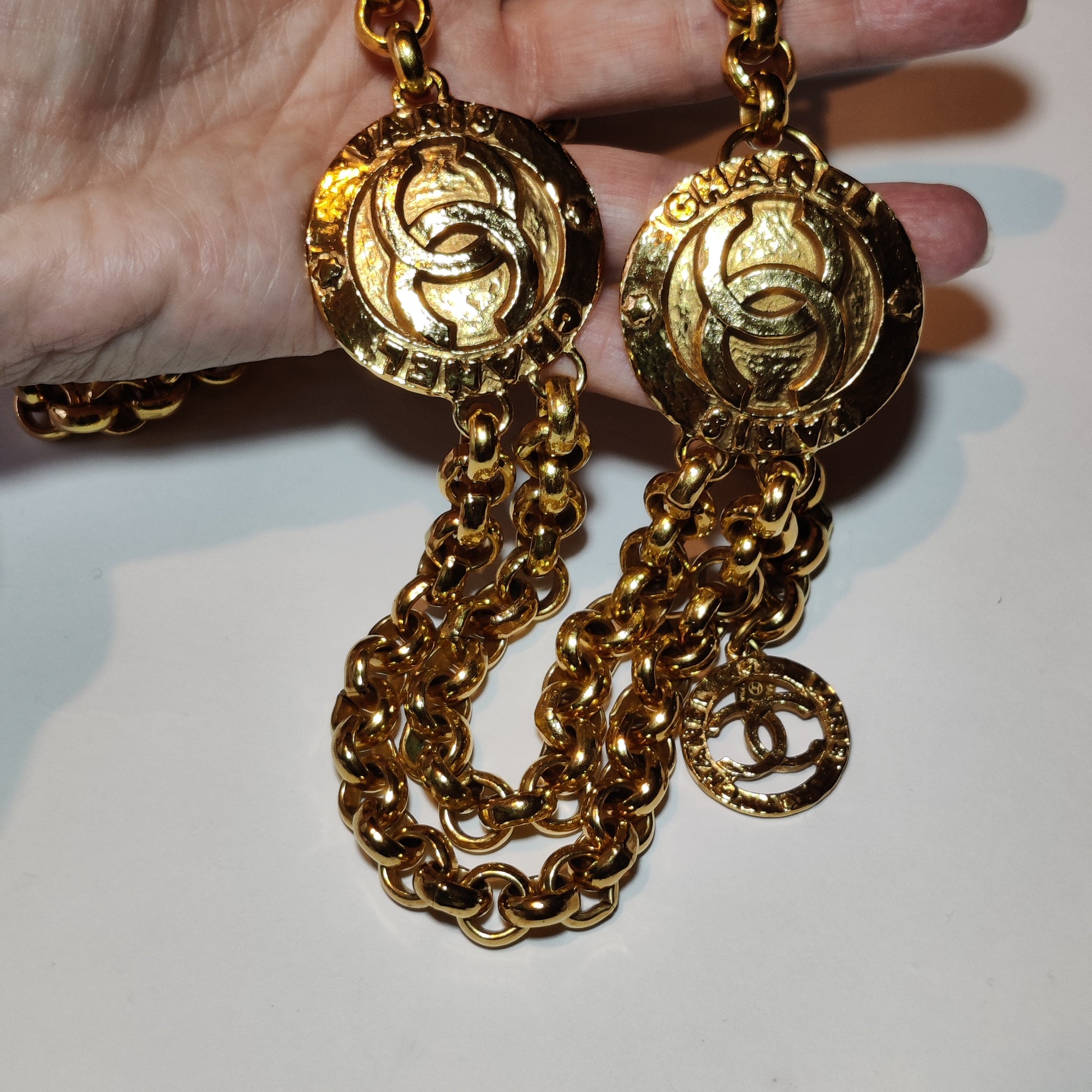 It is one of Channel's classic designs featuring two medallions each with interlocking 'C's logo and the words 'CHANEL' and 'PARIS' with two suspended chains between. The chain is a heavy curb chain and the whole belt is gold plated in a deep rich gold tone.