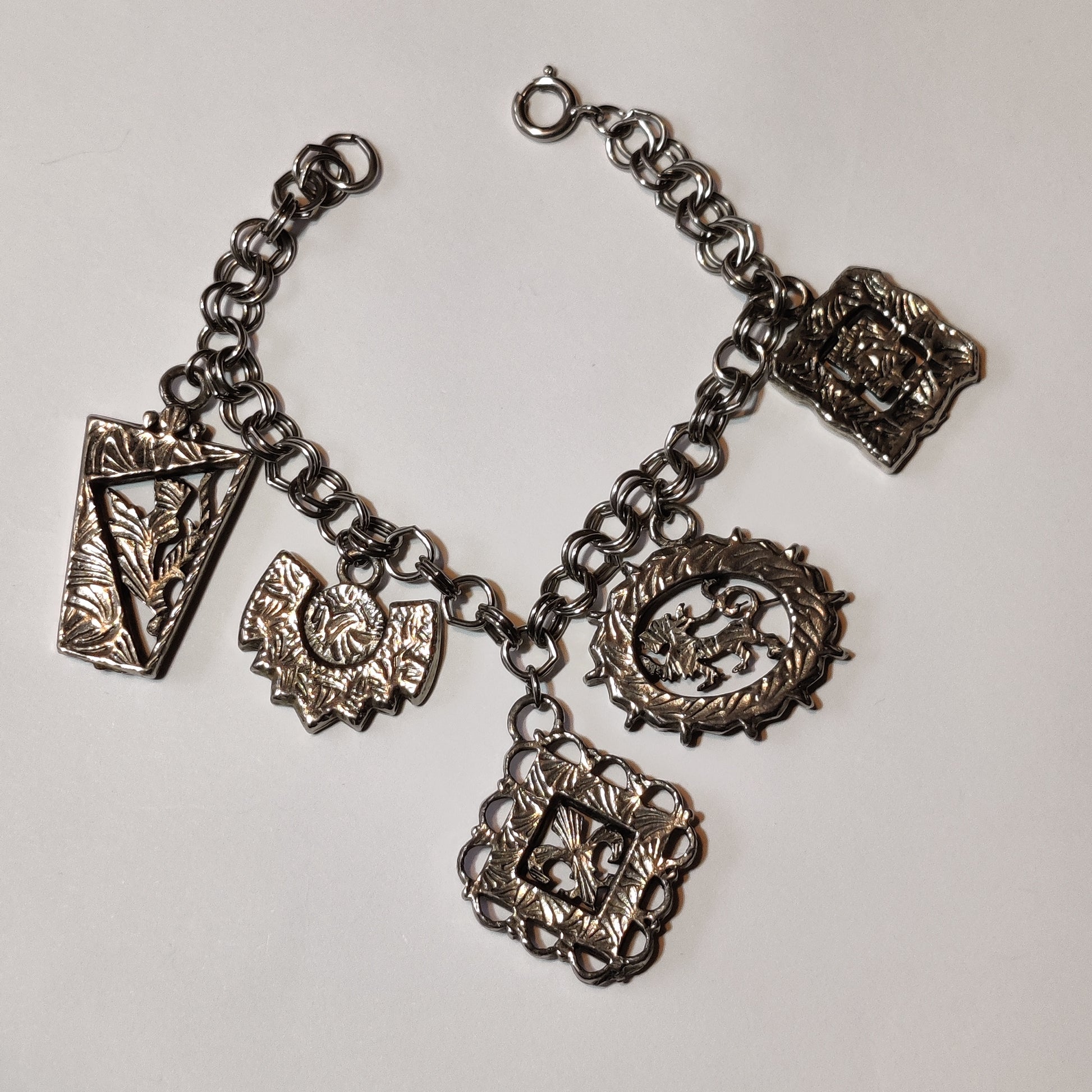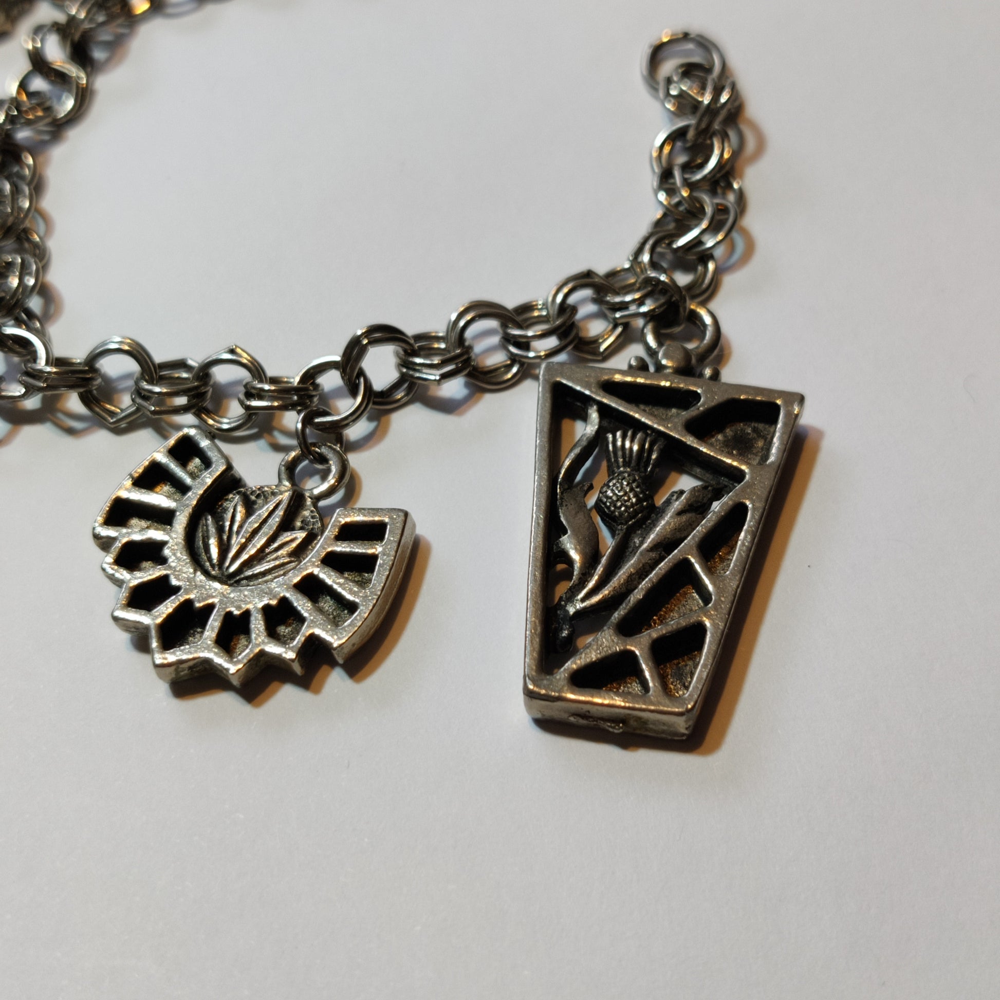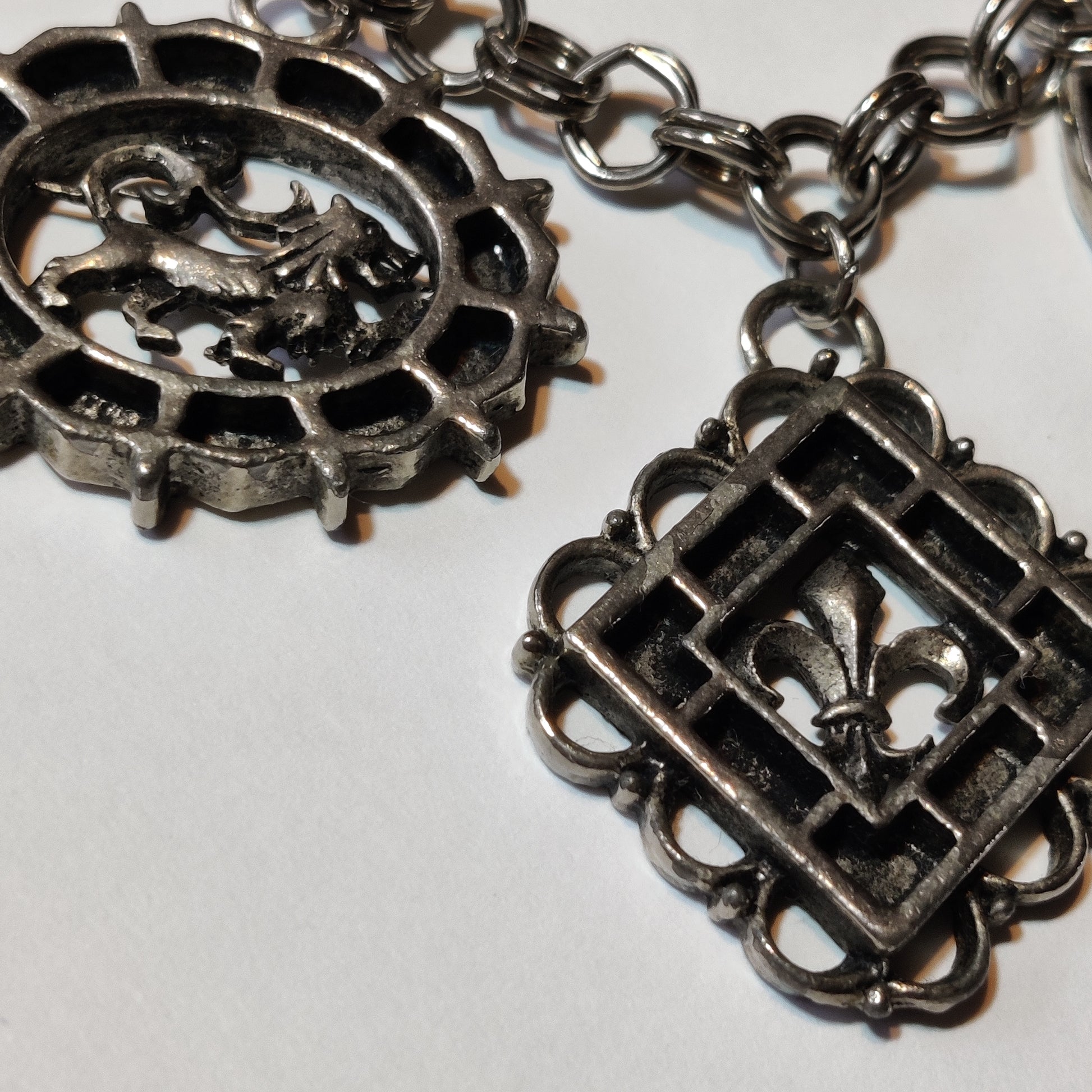 It has five chunky pierced metal charms attached to the double ring chain. They feature heraldic type symbols; a lion rampart, a thistle, a symbol/seal , a Fleur de Lis and a fan shape with leaves.
