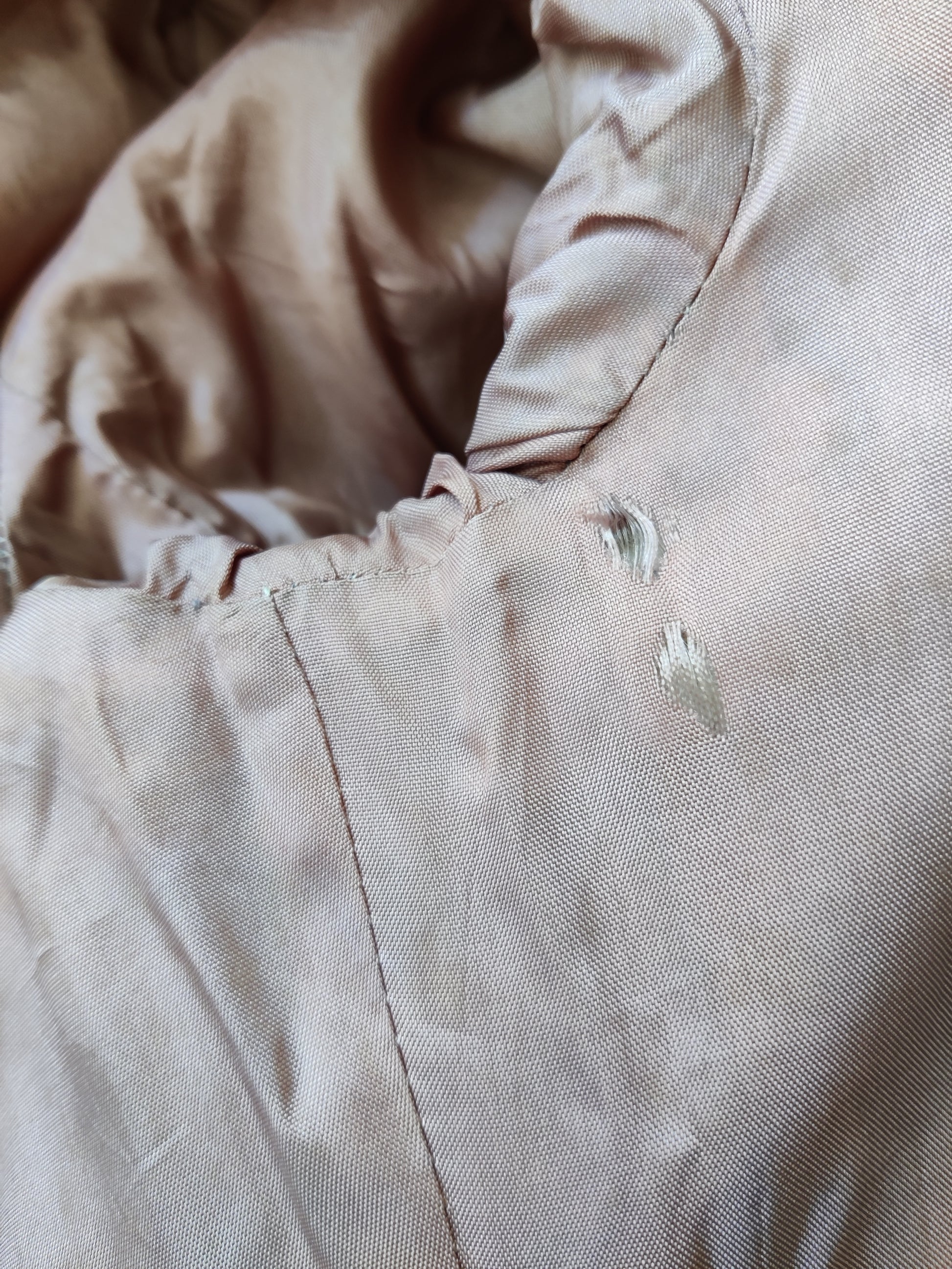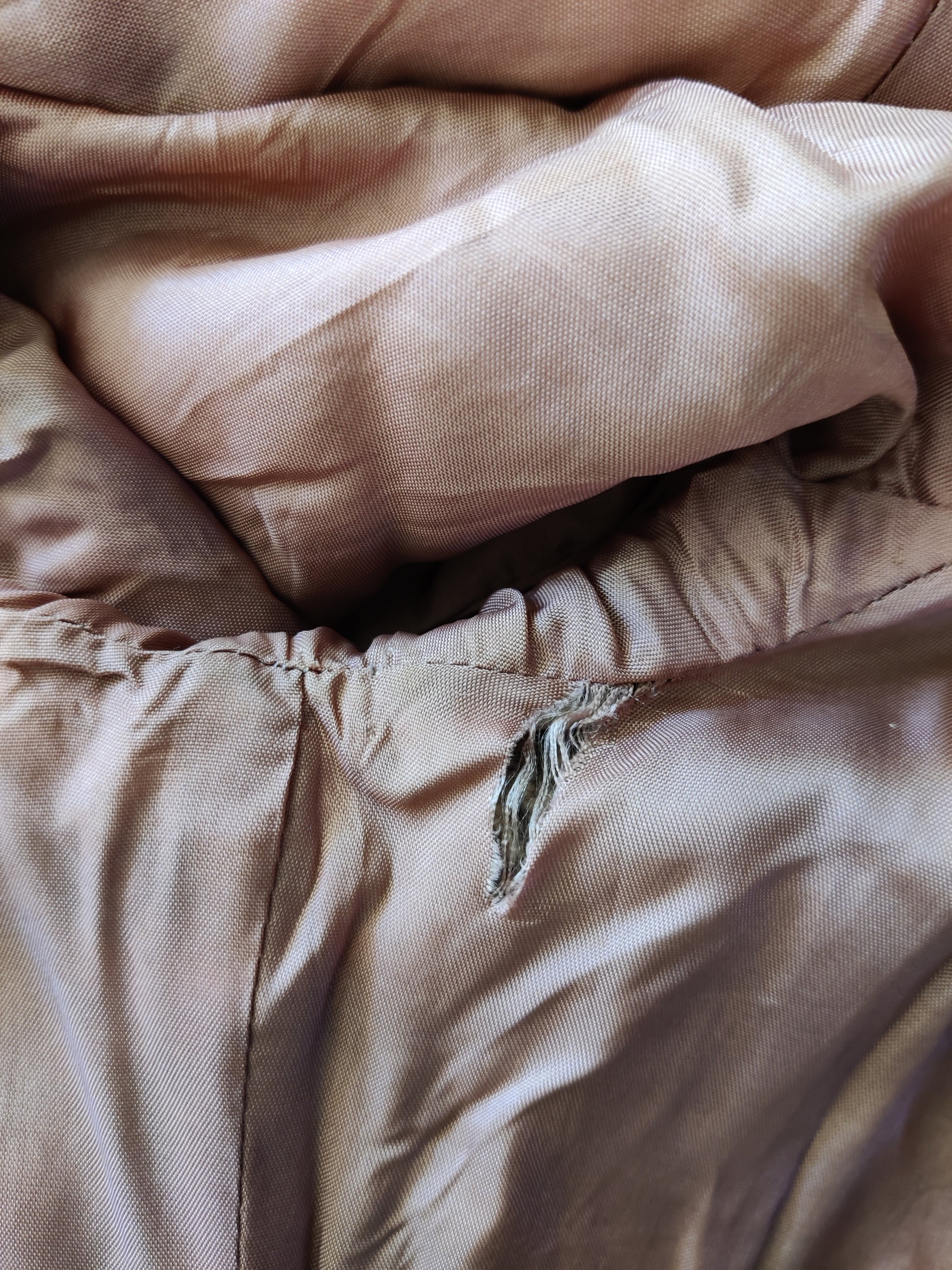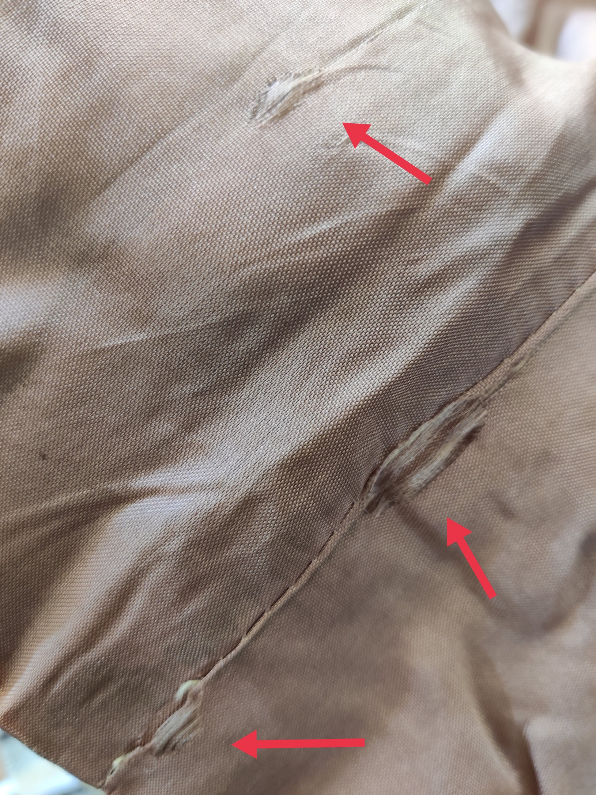 Please note it has damage to the lining. See images. There are small wear tears at each armhole and at one lower side seam it has three small wear tears.