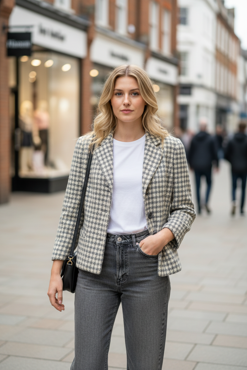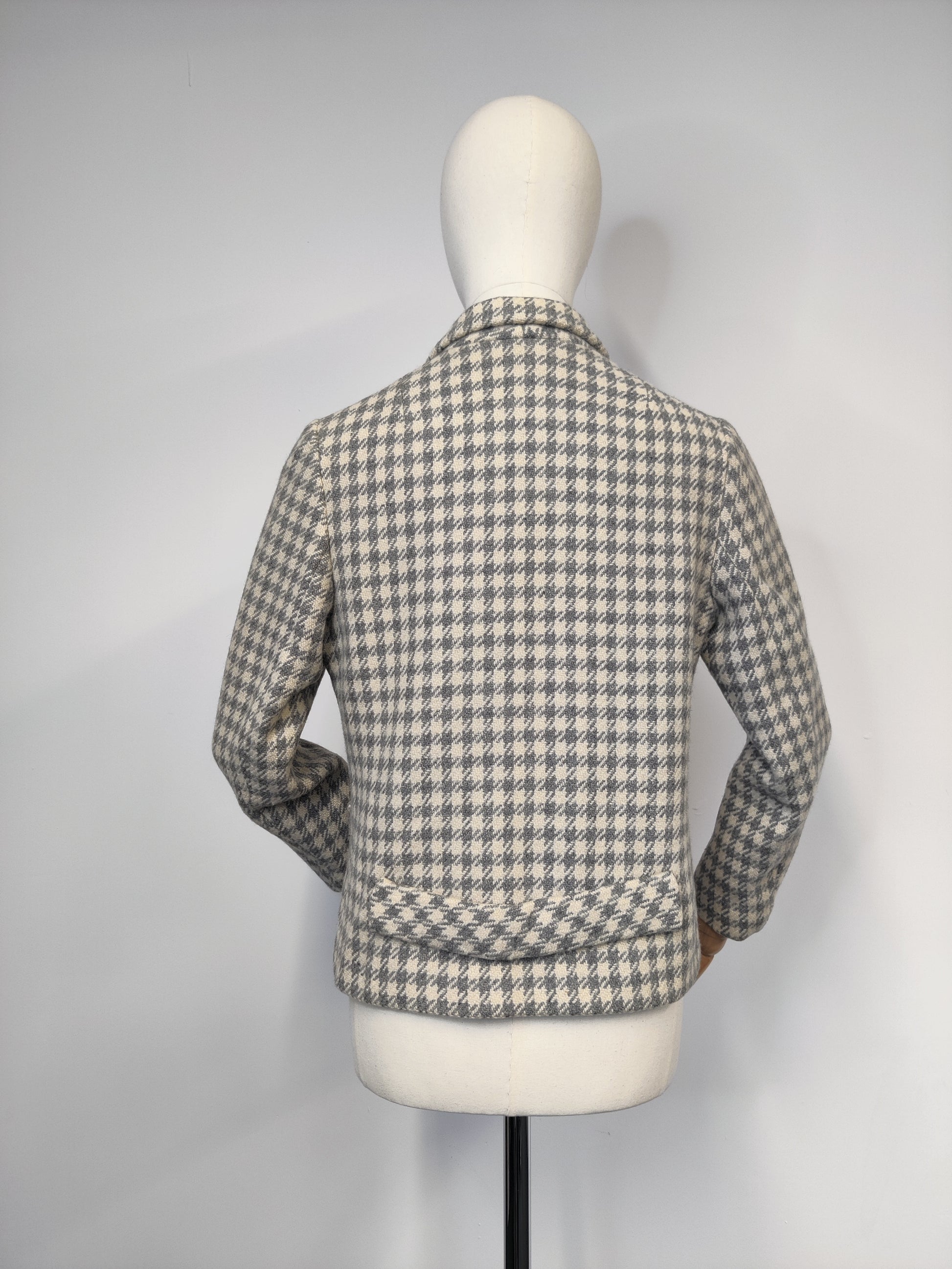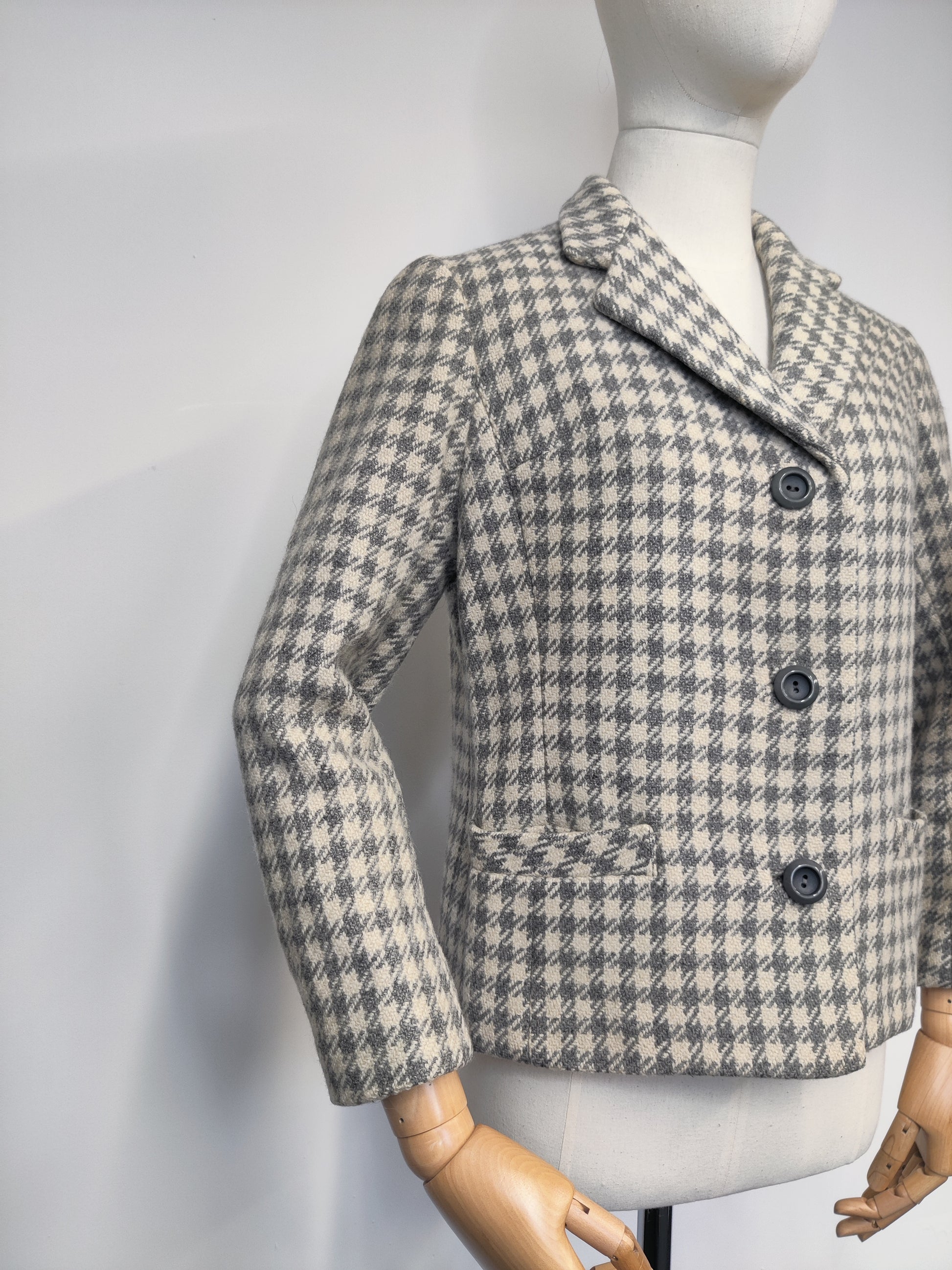 In grey and off white wool check it features 3/4 sleeves and a stylish tab at the back. It has high labels a three button fastening and shallow faux pockets.