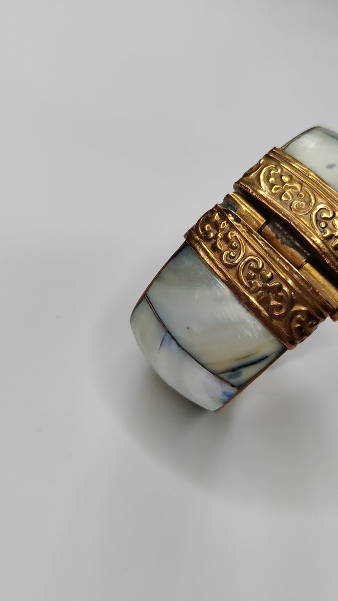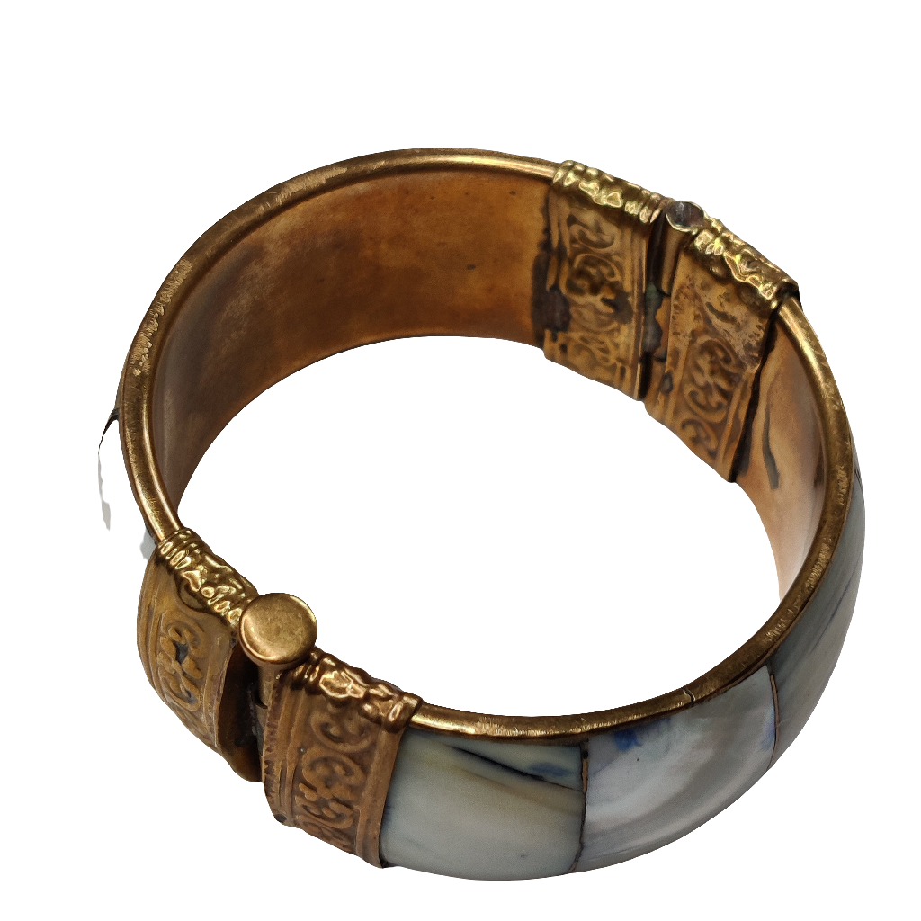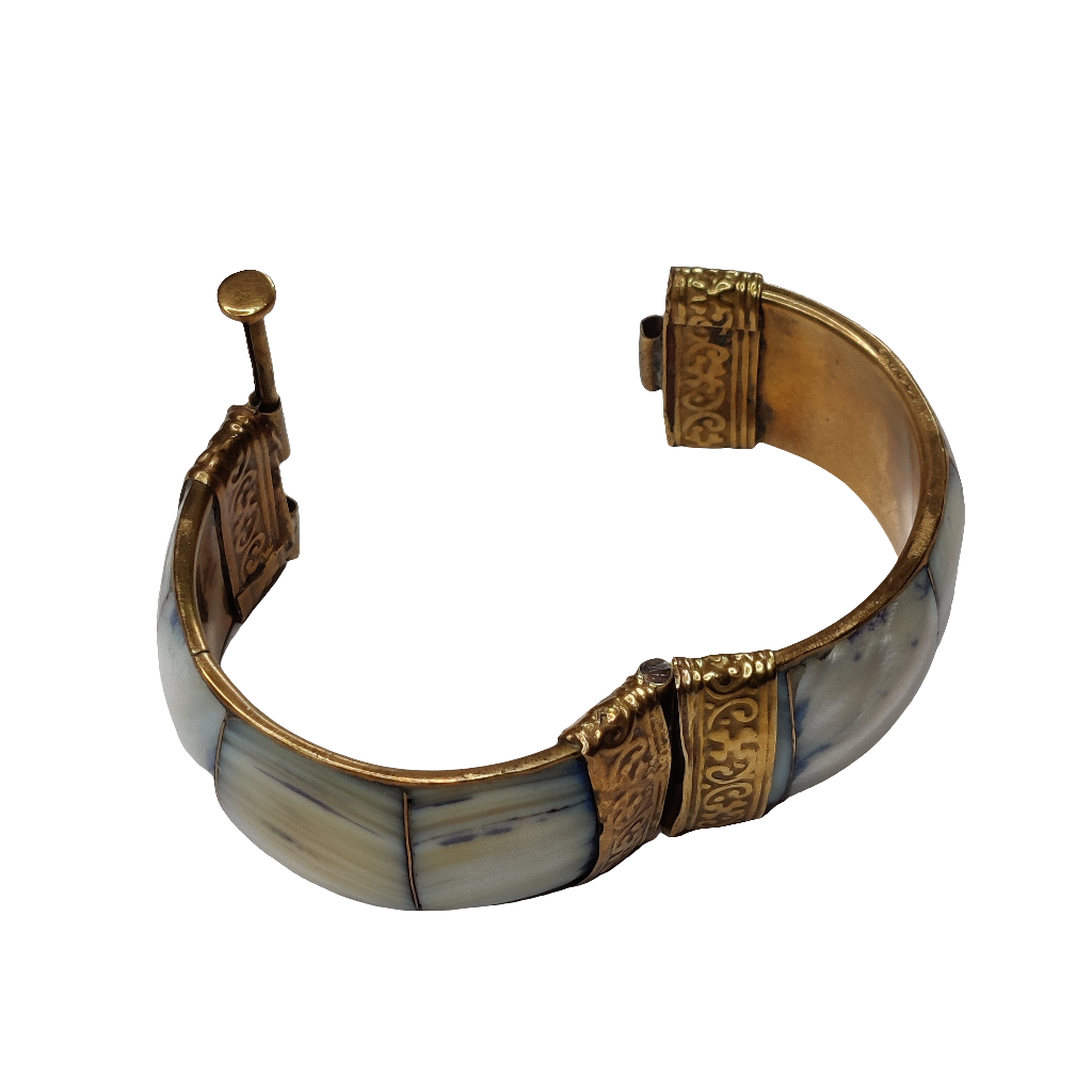 This is an ethnic hinged bangle in a base metal (probably brass) set with panels of mother of pearl/shell. Most likely Indian in origin.
