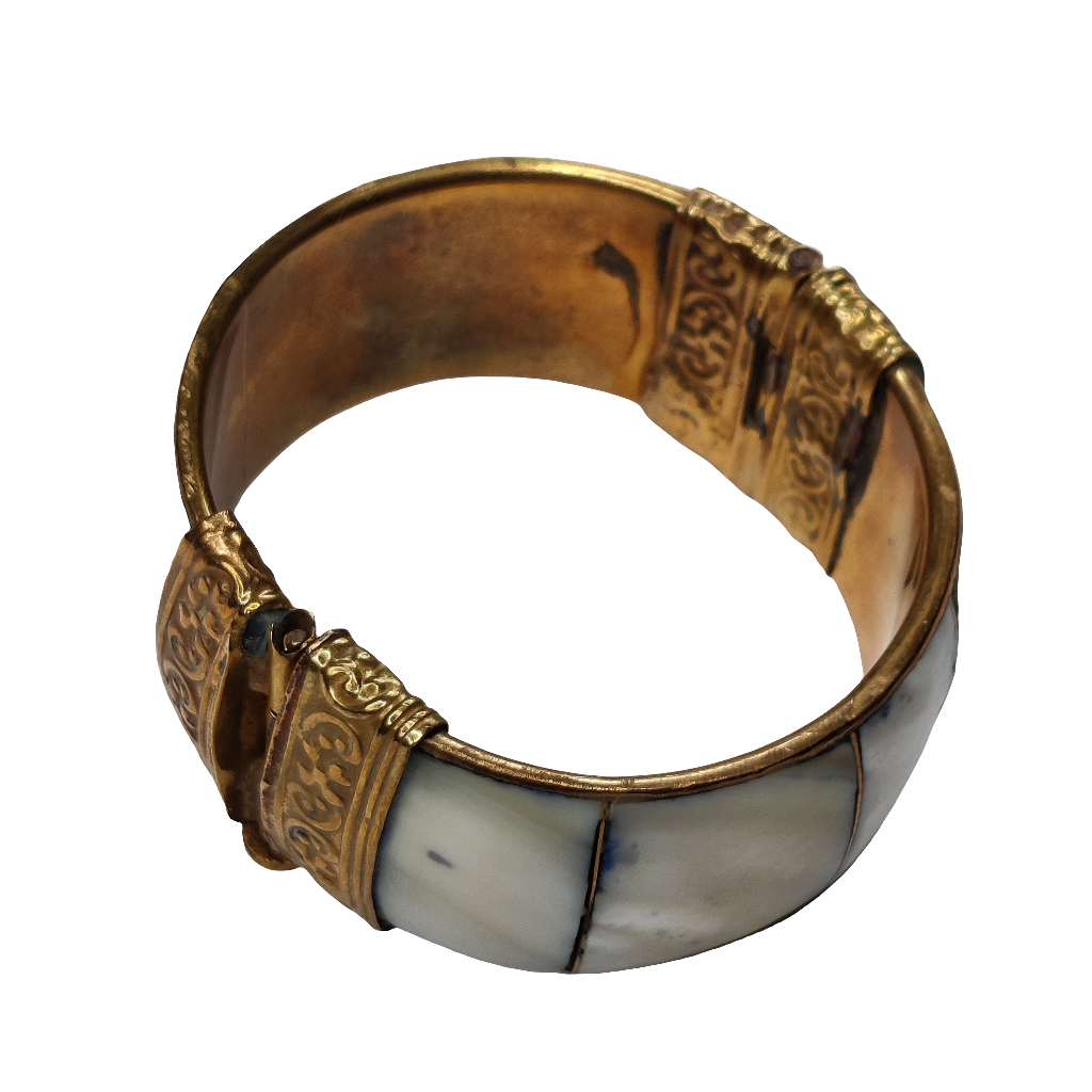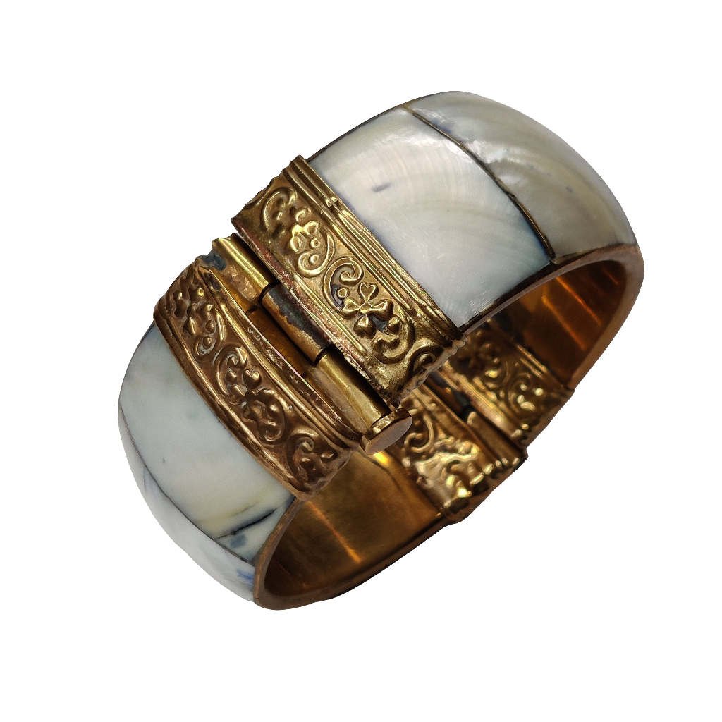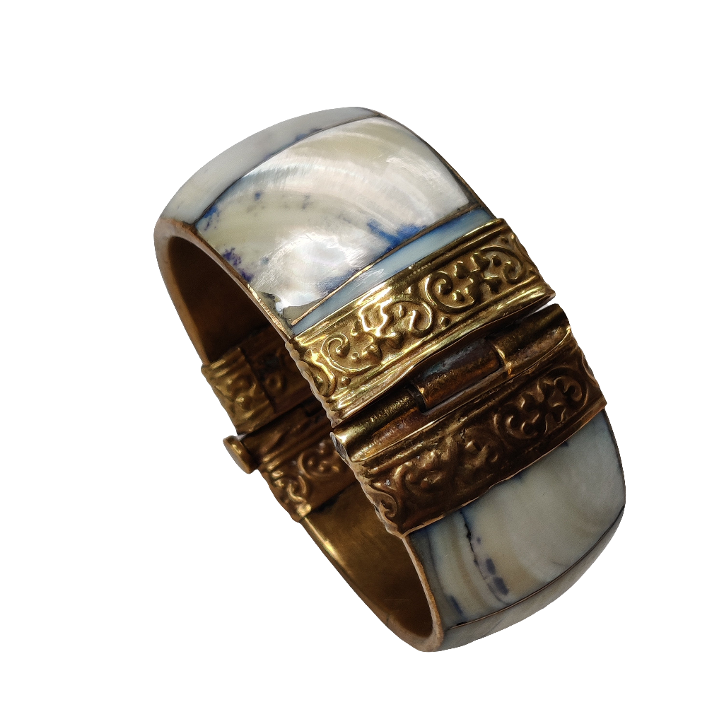 This is an ethnic hinged bangle in a base metal (probably brass) set with panels of mother of pearl/shell. Most likely Indian in origin.