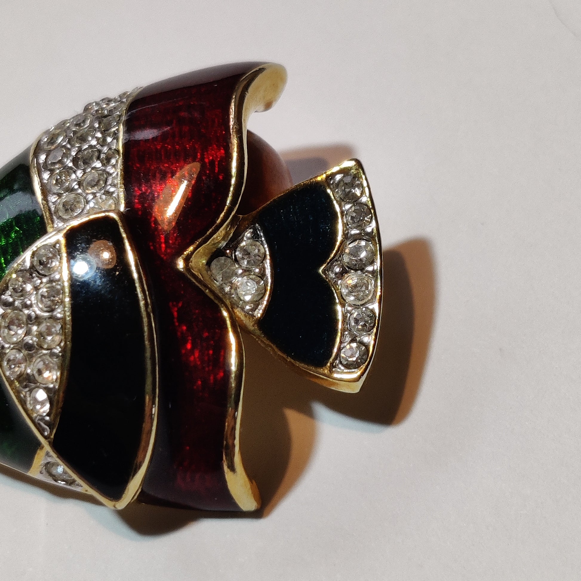 In gold tone metal it is a striped fish in multi coloured enamels (red, blue and green) with pave set diamante and a red diamante eye.
