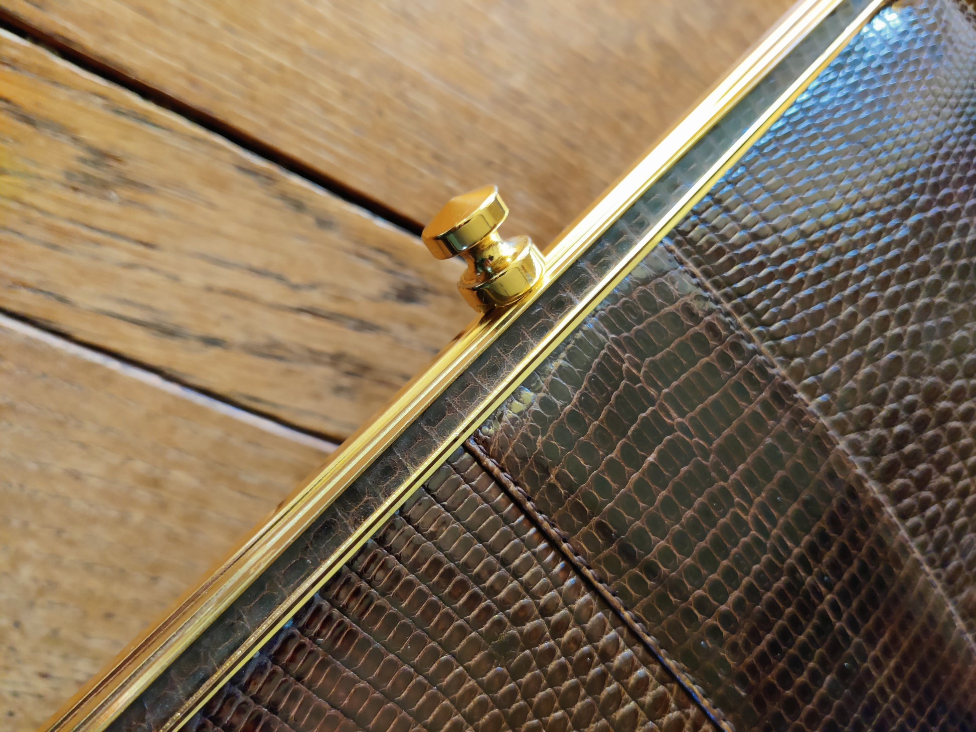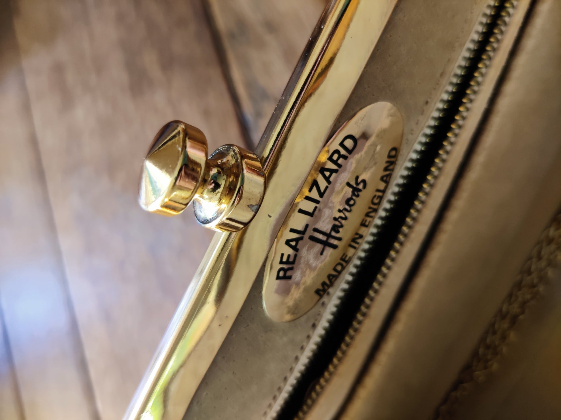 This is a beautiful quality lizard skin bag by Harrods. It dates to around the 1980s and was made in England.