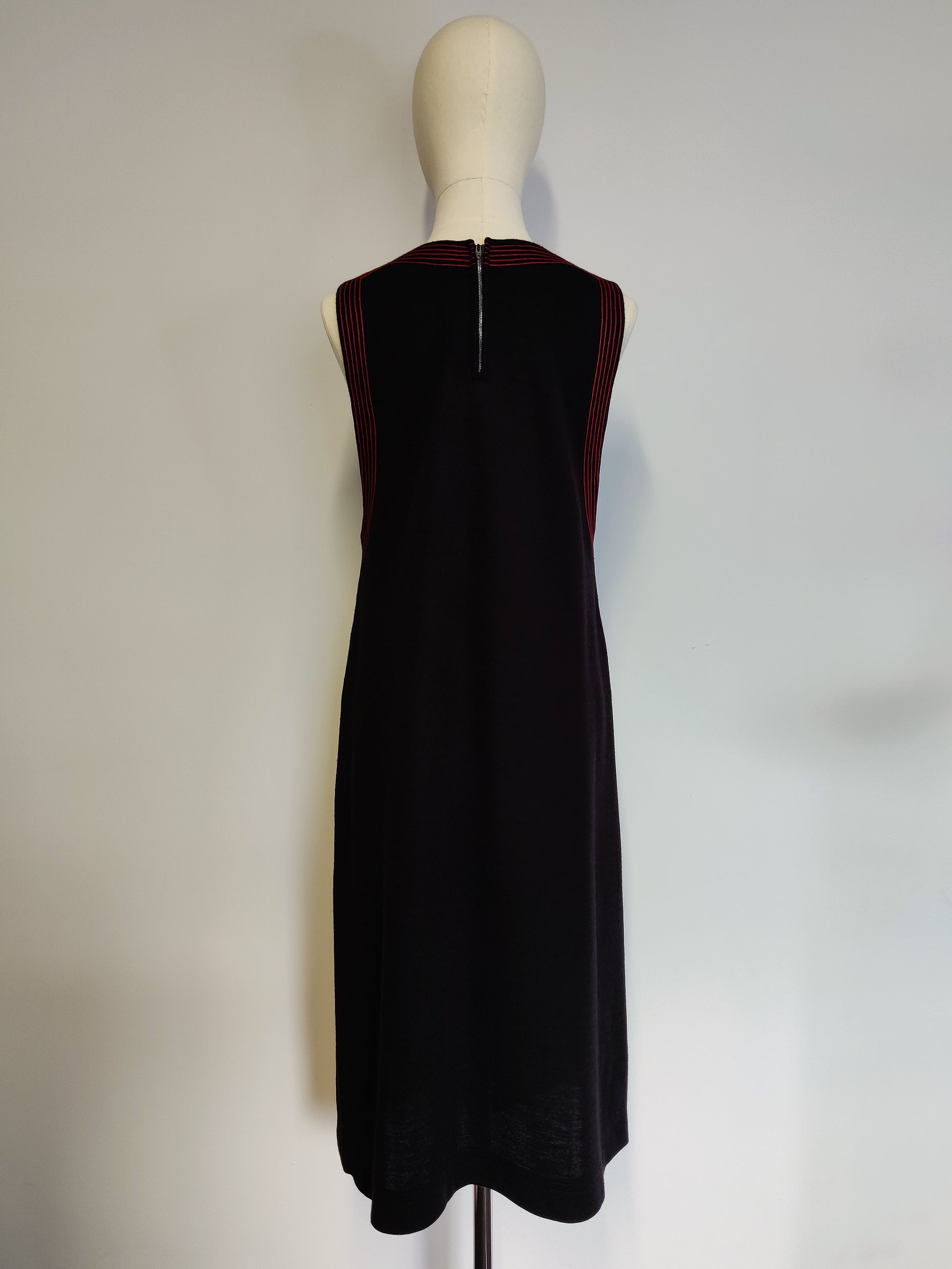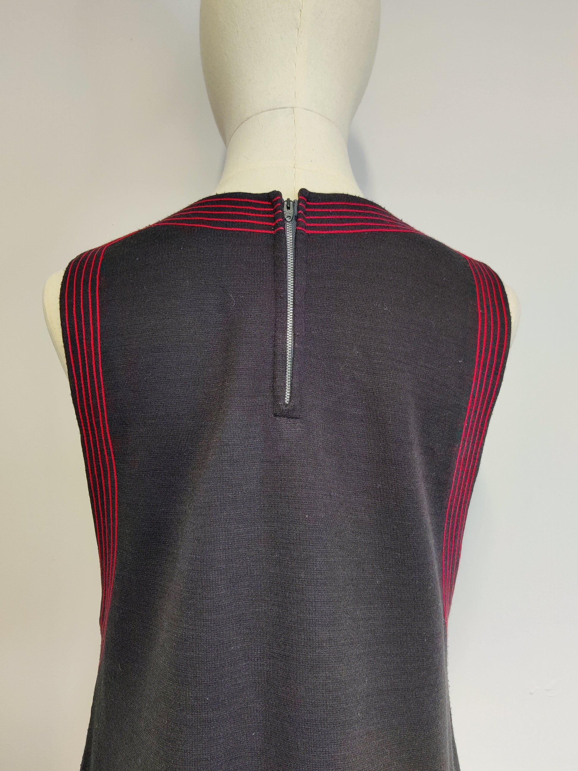 Made in a jersey courtelle fabric it features rows of red topstitching to the neckline, shoulders and armholes.