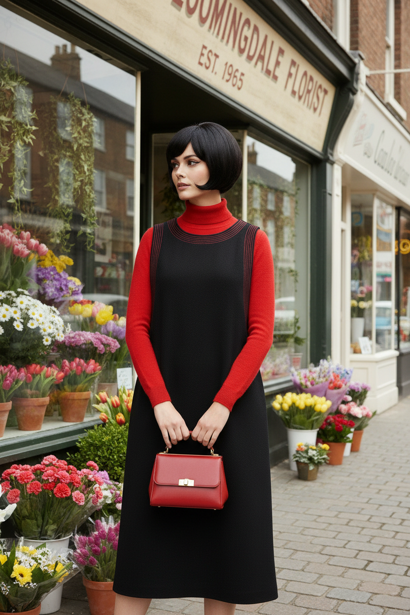 This is a stylish pinafore by Jean Varon dating to the late 1960s or early 1970s.