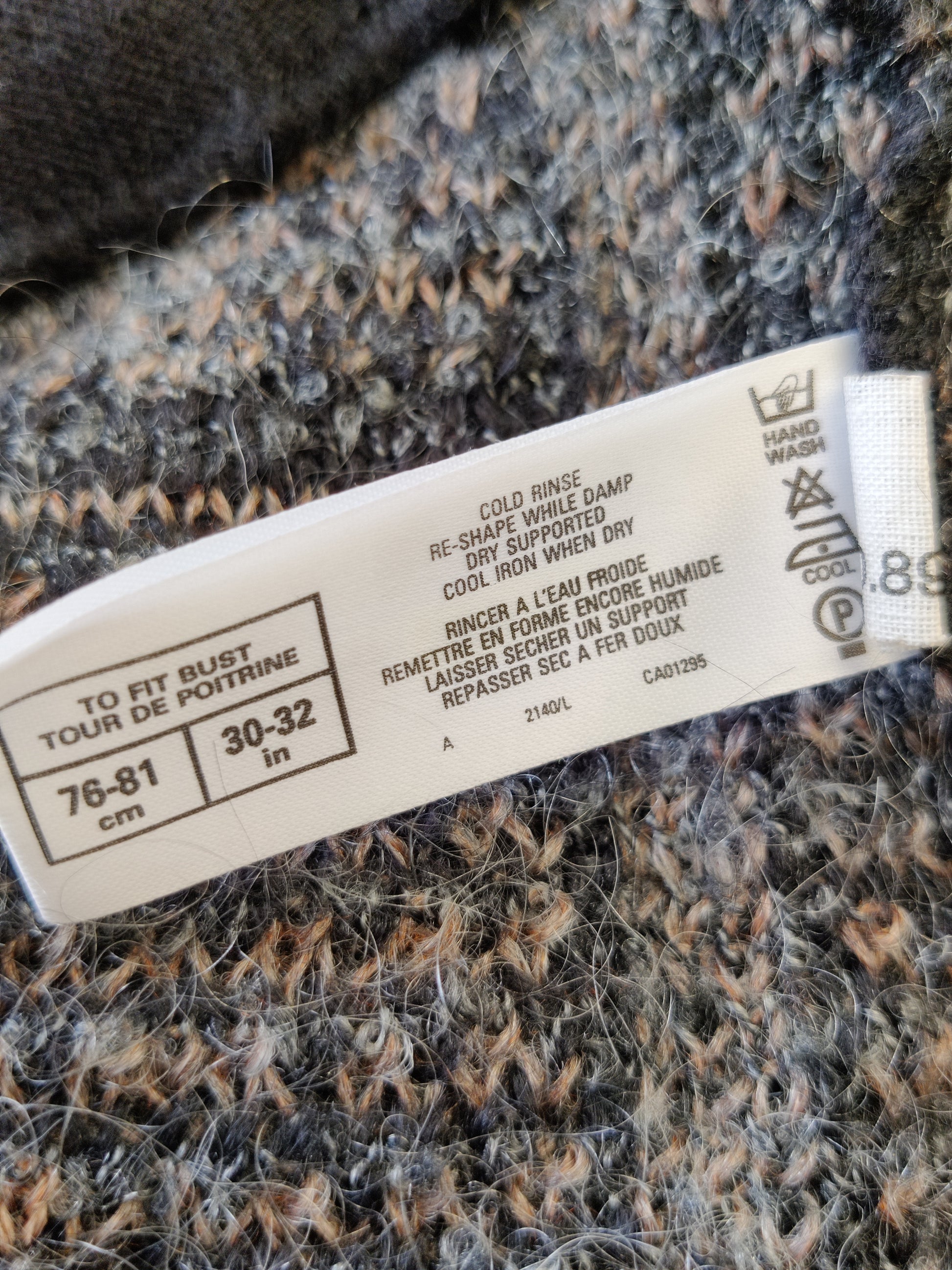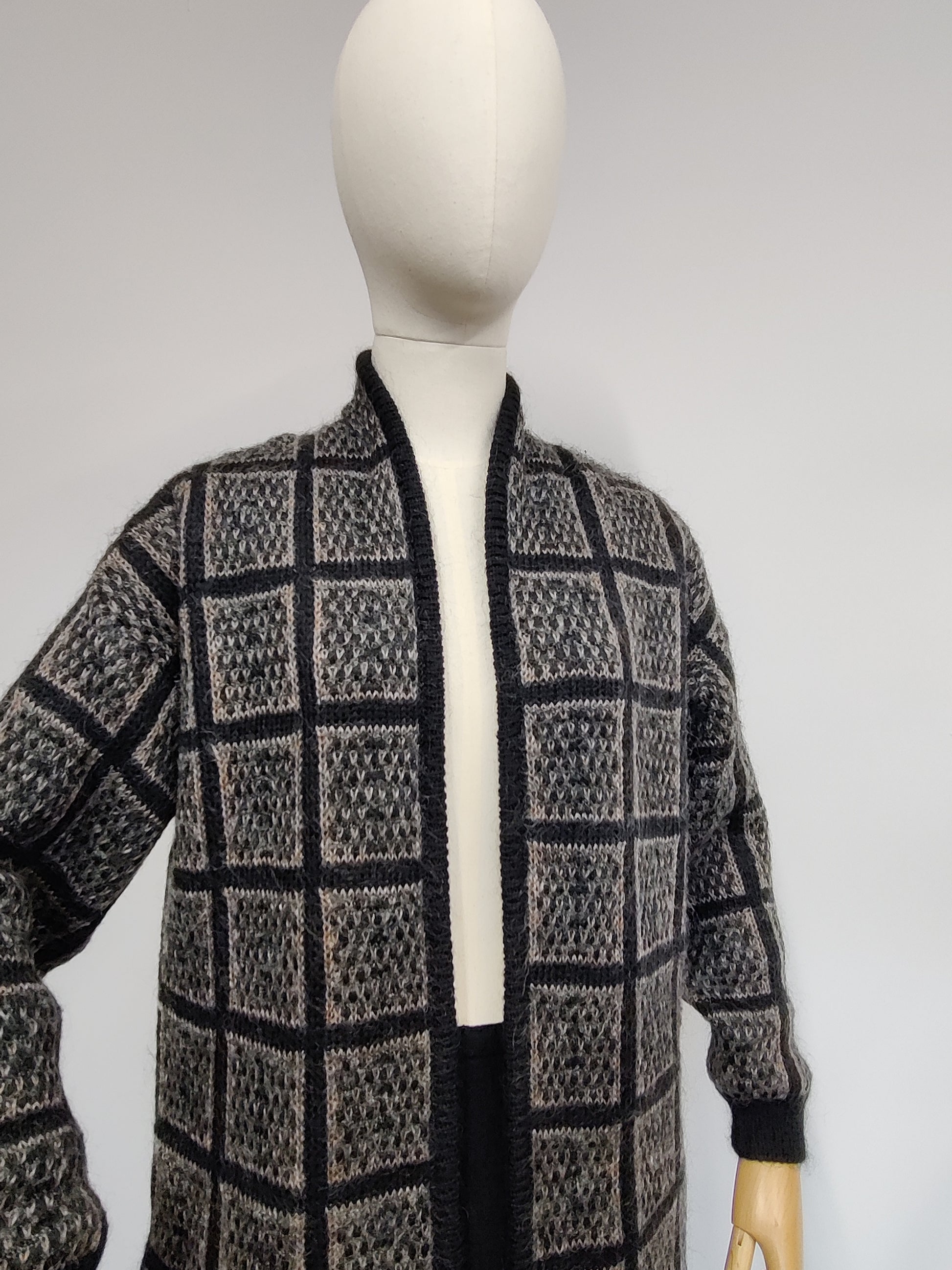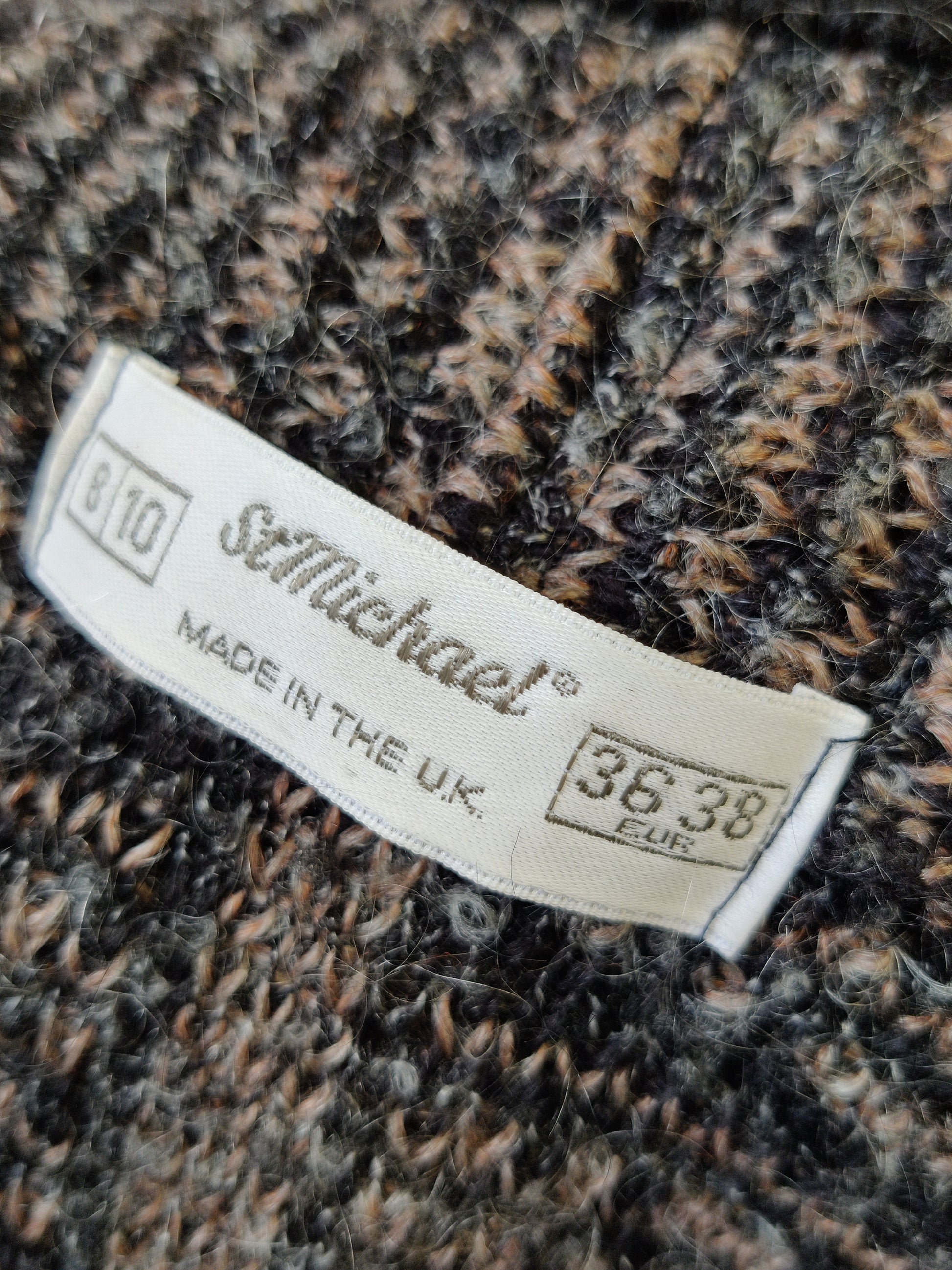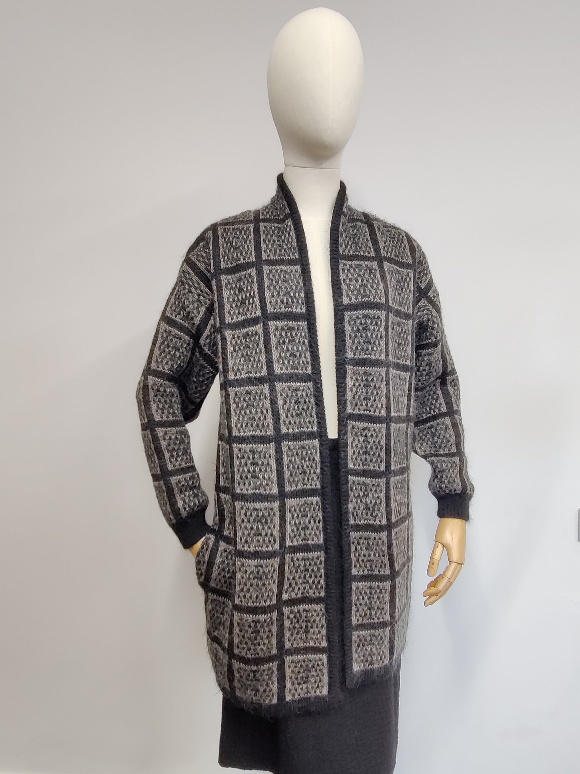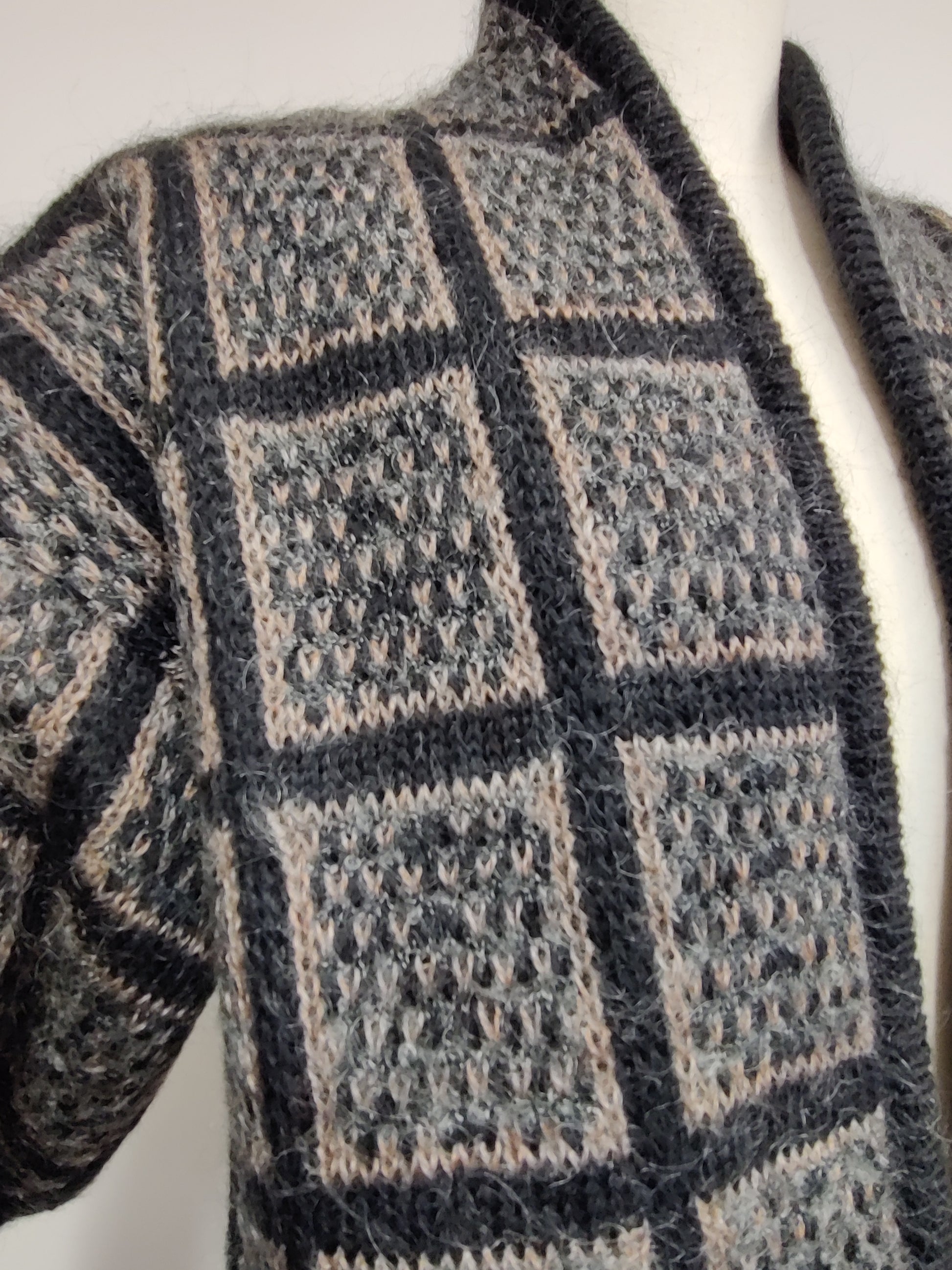 This is a 1980s/90s long cardigan/jacket by Marks and Spencer. Made in the UK the yarns are mixed acrylic/nylon/mohair and wool. It is a slightly heavier weight and could be worn as a jacket/short coat.