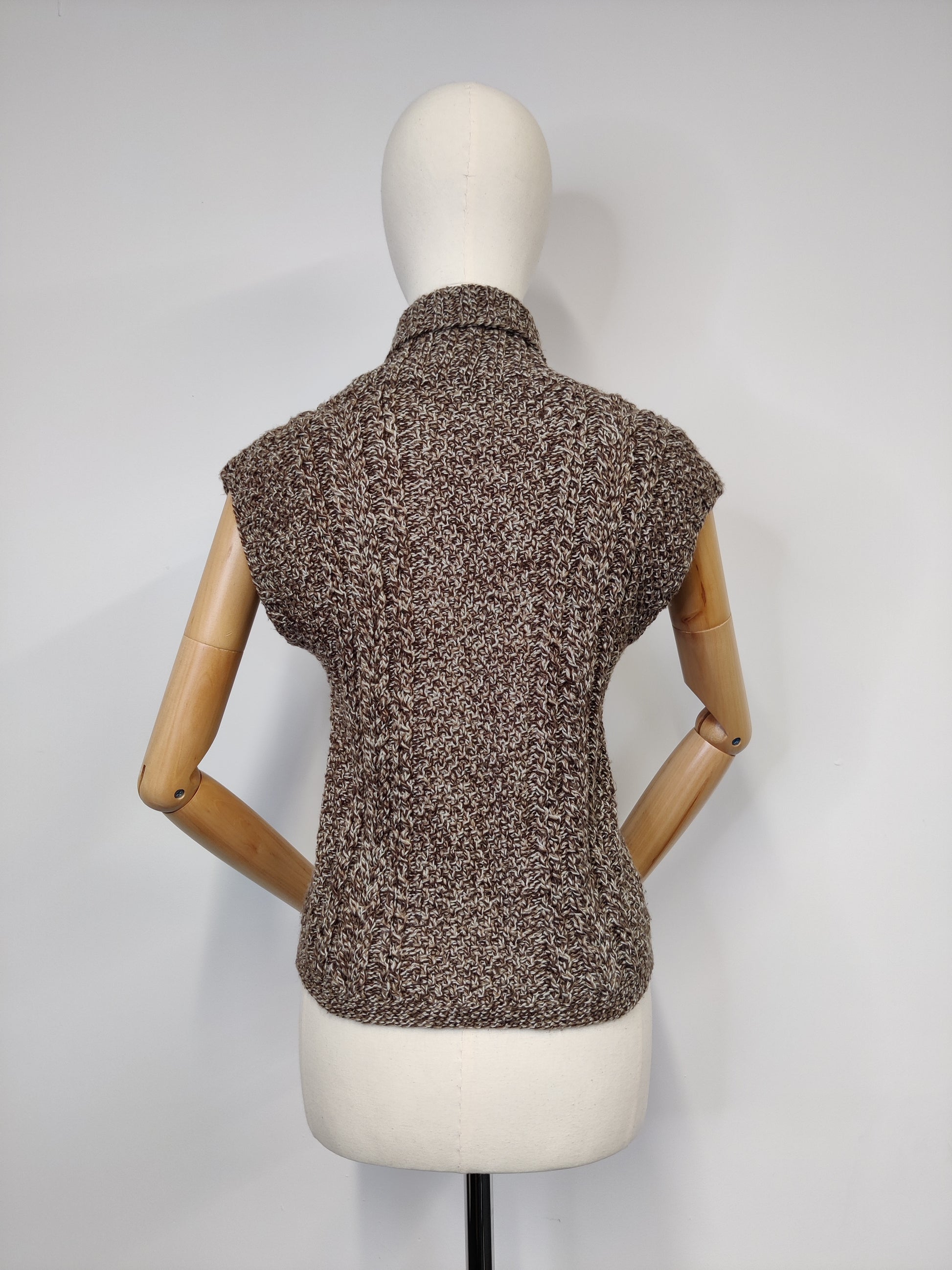 This is a beautifully hand-knitted waistcoat in a brown marl/tweed soft yarn.